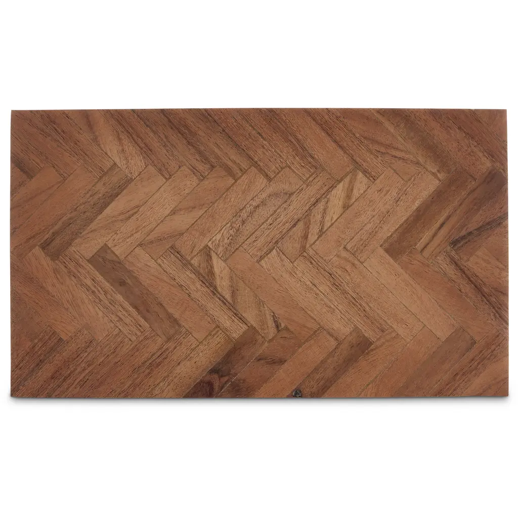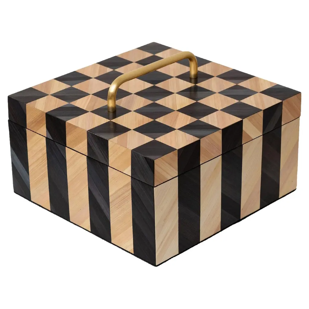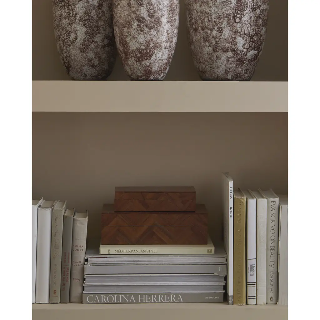 The Alfeo Box Set includes large and small decorative boxes made of solid wood with surface treatments in herringbone patterns. These are painstaking artisanal decorative accessories because the pieces of wood are hand-applied. The color variations inherent in the natural wood will also mean that each box is unique. Furthering the artisanal feel is how the pattern extends all the way through to the outside rims.