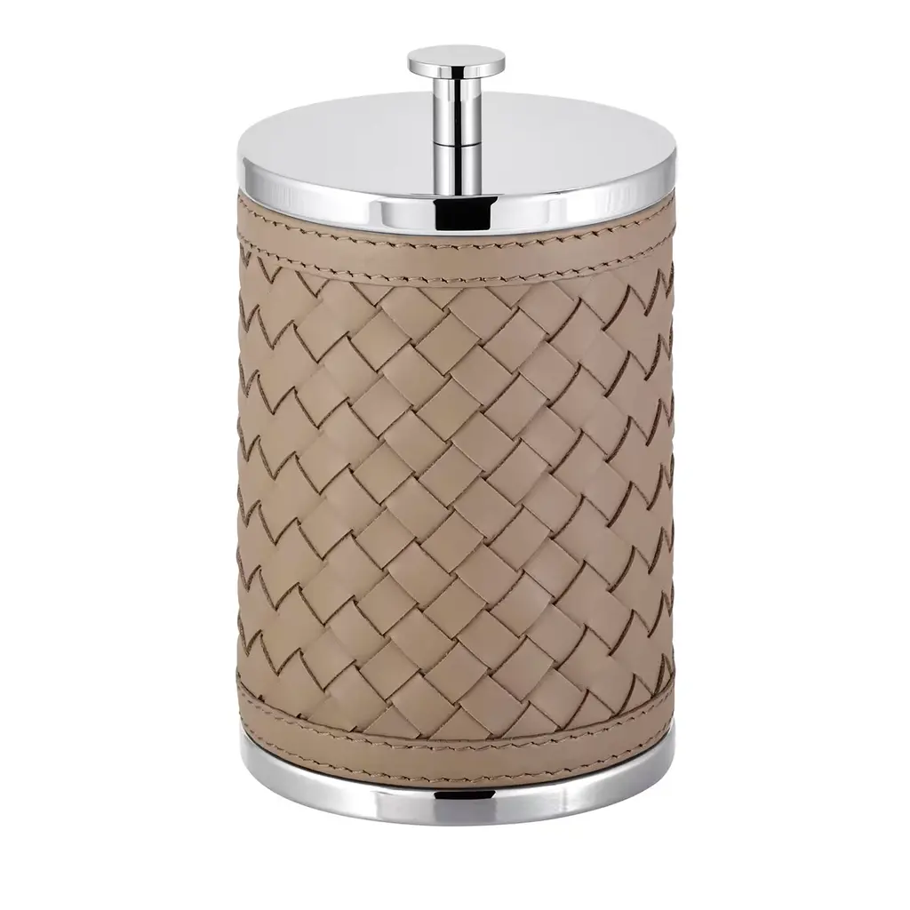The Alghero bathroom set features a series of articles with a fine leather-covered metal structure with quilted diamonds padded leather. Alghero is a minimal bathroom collection ideal for any setting. The rigid cylindrical main volumes are rendered softer by the finest leather, with its velvety texture, combined with one among two metal finishes of choice (chrome or gold) for a naturally elegant resulting design.