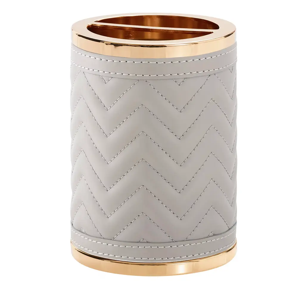 The Alghero bathroom set features a series of articles with a fine leather-covered metal structure with quilted herringbone padded leather. Alghero is a minimal bathroom collection ideal for any setting. The rigid cylindrical main volumes are rendered softer by the finest leather, with its velvety texture, combined with one among two metal finishes of choice (chrome or gold) for an elegant resulting design. Each piece of this bathroom set is covered with quilted herringbone padded leather.