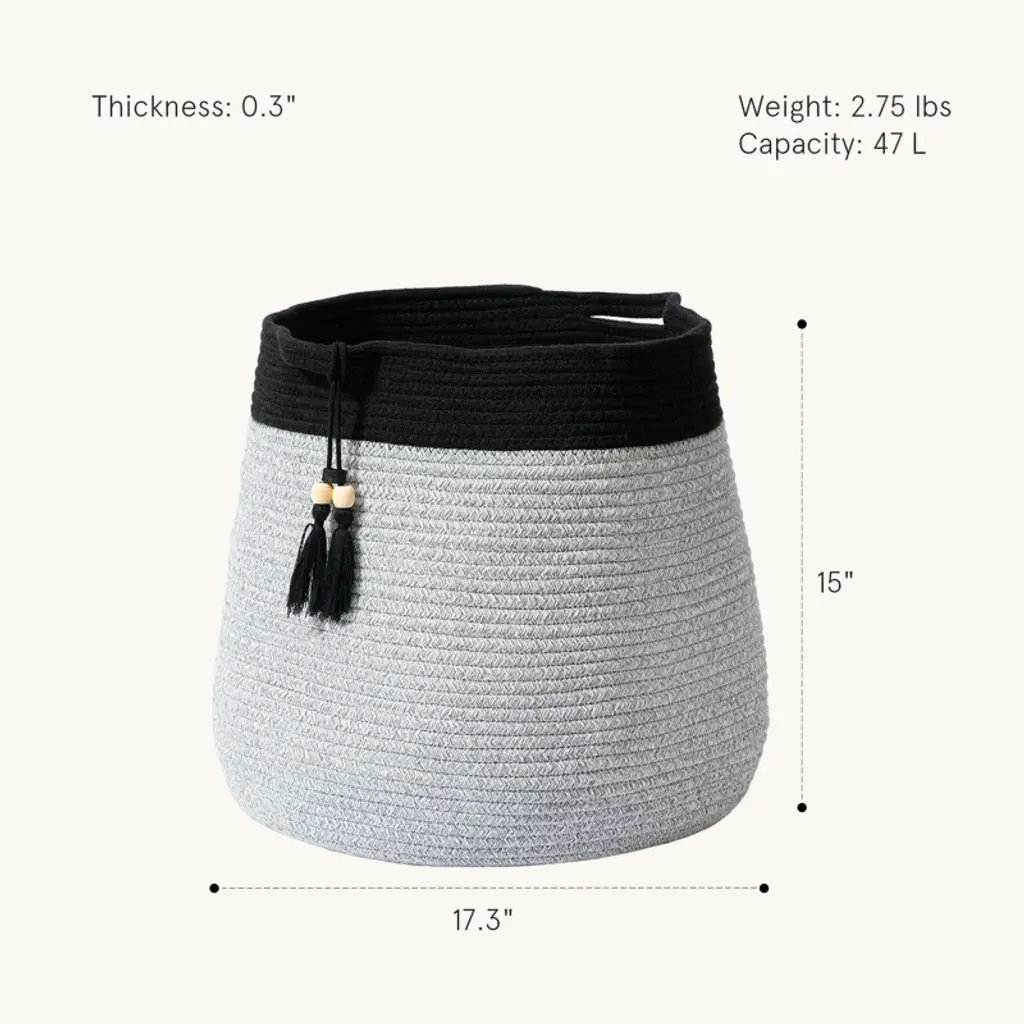 Having a breathable and organized home helps refresh your spirits. Decluttering can be turned into bliss with versatile organizers. Made from natural elastic cotton rope and corn skin, our baby laundry basket serves an environmental and safe storage solution. Featuring the unique bulgy shape, our toy storage basket is designed in harmonious two-tone color scheme with exquisite macrame tassels, enabling it to double as home decoration and storage container for your living room, bedroom, bath, and clothes laundry.