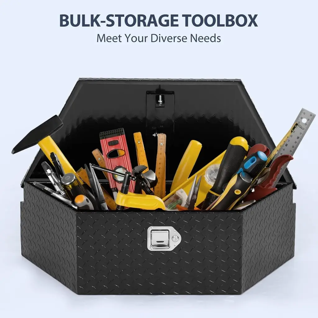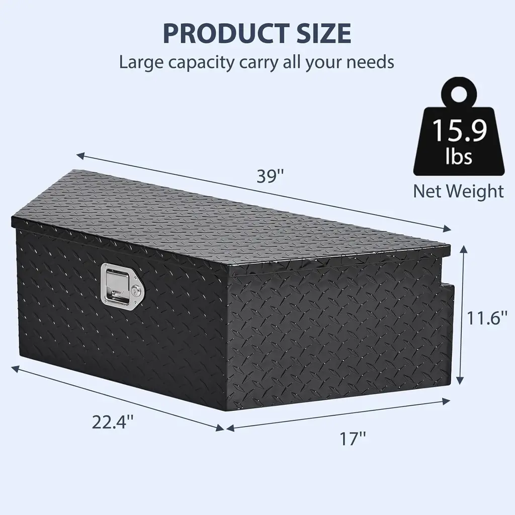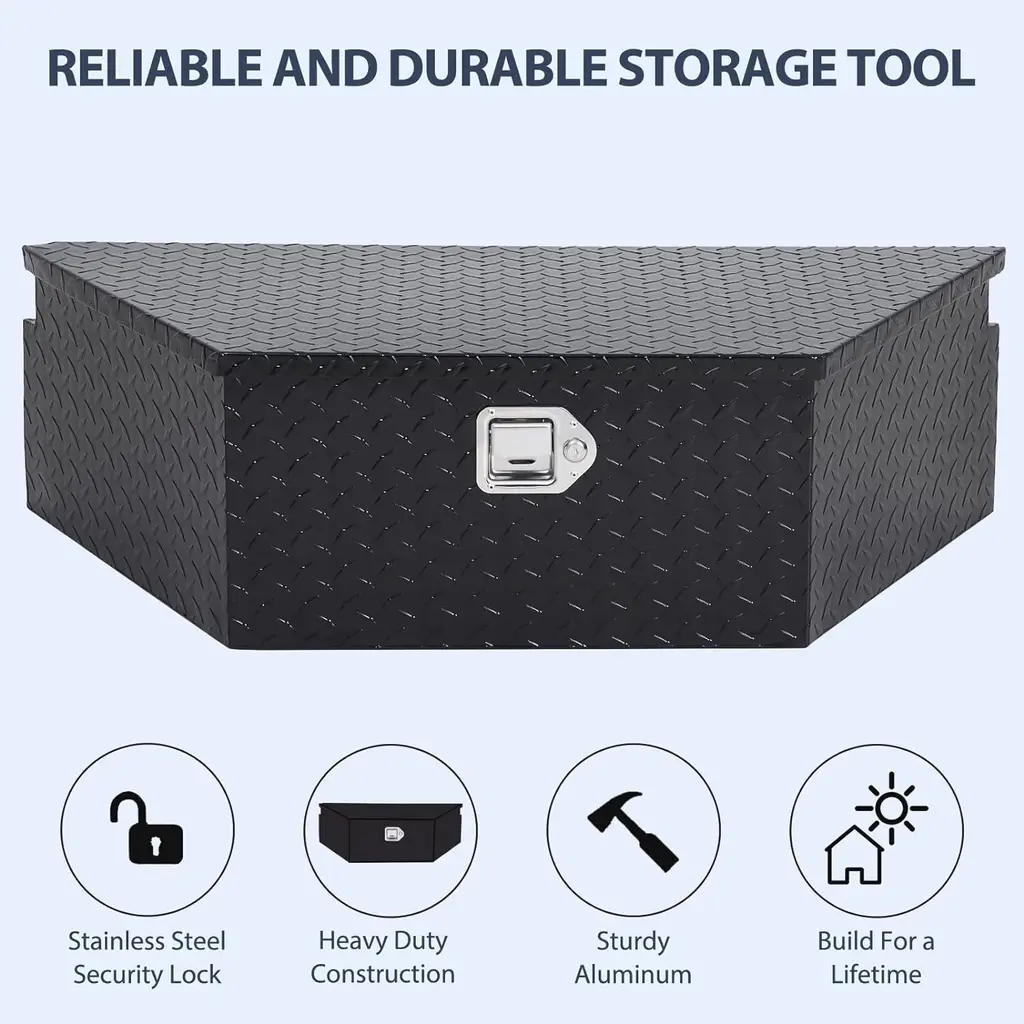 STURDY AND DURABLE: This trailer tongue toolbox is made of high-quality aluminum alloy material to ensure its durability and long service life. Offers enhanced rust and corrosion resistance, and could be durable for years. SPACIOUS STORAGE: This trailer storage box is a fully functional storage box on the trailer tongue. It provides valuable extra storage space for tools, camping supplies, wilderness gear and other essentials. WEATHERPROOF DESIGN: Fully welded seam construction and a weatherproof seal allow this tool box for trailer tongue to protect your stored items from the rain in all types of harsh weather conditions. Keeping the inside tool dry and neat all the time. FITTED WITH GAS STRUT: The trailer toolbox features an easy-to-open-and-close gas strutted notched lid to assist with opening and closing, hold the lid in place and allow for a soft close. Making it easy for you to access what you need at any time. SECURITY PROTECTION: The trailer tongue box is equipped with a reliable locking system to effectively protect your belongings from the risk of theft. Increase your truck storage space with this trailer toolbox and have peace of mind knowing your belongings are safe from theft.