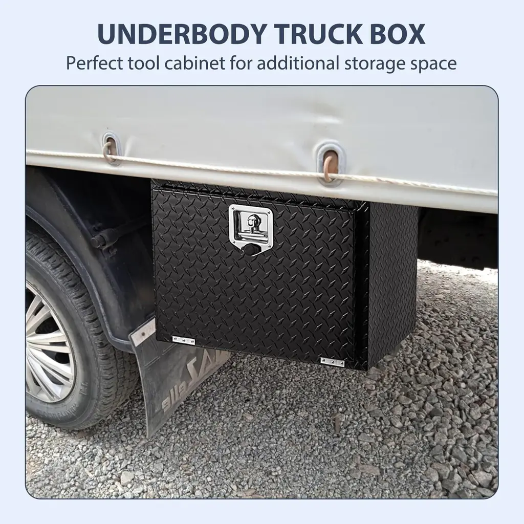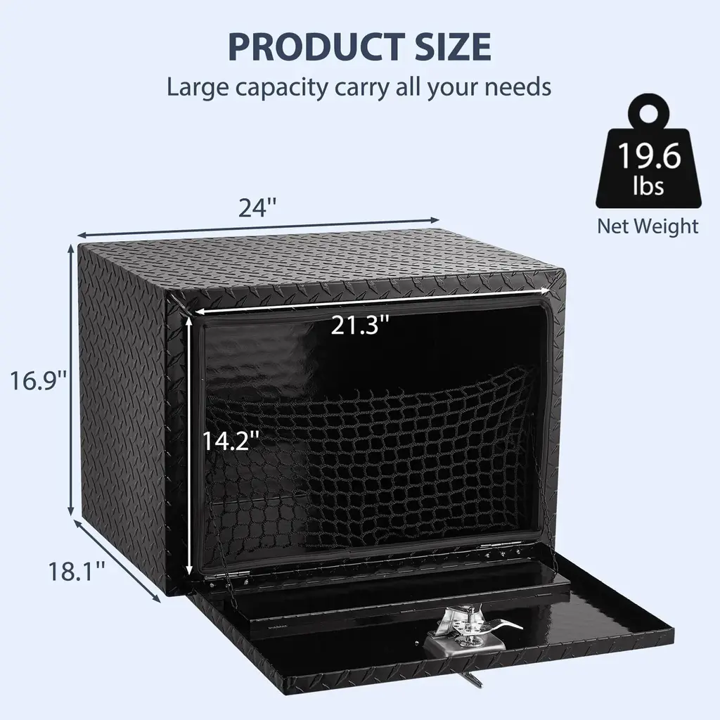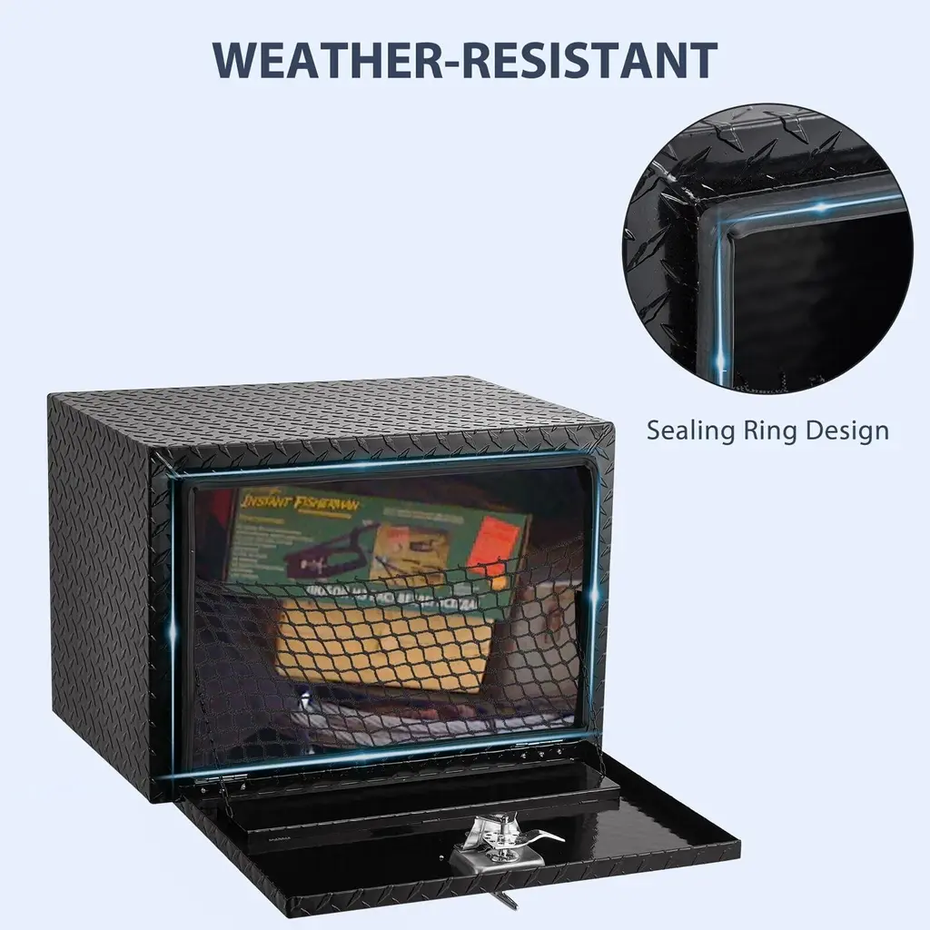 STURDY AND DURABLE: This underbody truck box is made of high-quality aluminum alloy material to ensure its durability and long service life. Offers enhanced rust and corrosion resistance, can be durable for years and keeps tools and equipment safe. INNOVATIVE MESH POCKET DESIGN: We design our products with the user in mind, so we have equipped this truck toolbox with a mesh pocket, so that you no longer need to worry about too many items falling out when you are reaching for them, giving you a better user experience. SPACE-SAVING STORAGE: This underbody tool box conveniently mounts under your vehicle, allowing you to save space in your truck bed. Keep all your tools and small accessories organized to prevent them from rolling around in the bed of your truck or RV. WEATHERPROOF DESIGN: Fully welded seam construction and a weatherproof seal allow this tool box for trucks to protect your stored items from the rain in all types of harsh weather conditions and keep the inside tool dry and neat all the time. SECURITY PROTECTION: The embedded T-shaped handle of this underbody box is designed without a bulge, making it resistant to scratches and hits during driving. The box is lockable and comes with one exclusive key to ensure the security of your items. The lock opens to a drop-down door that provides full access to all contents in the box.