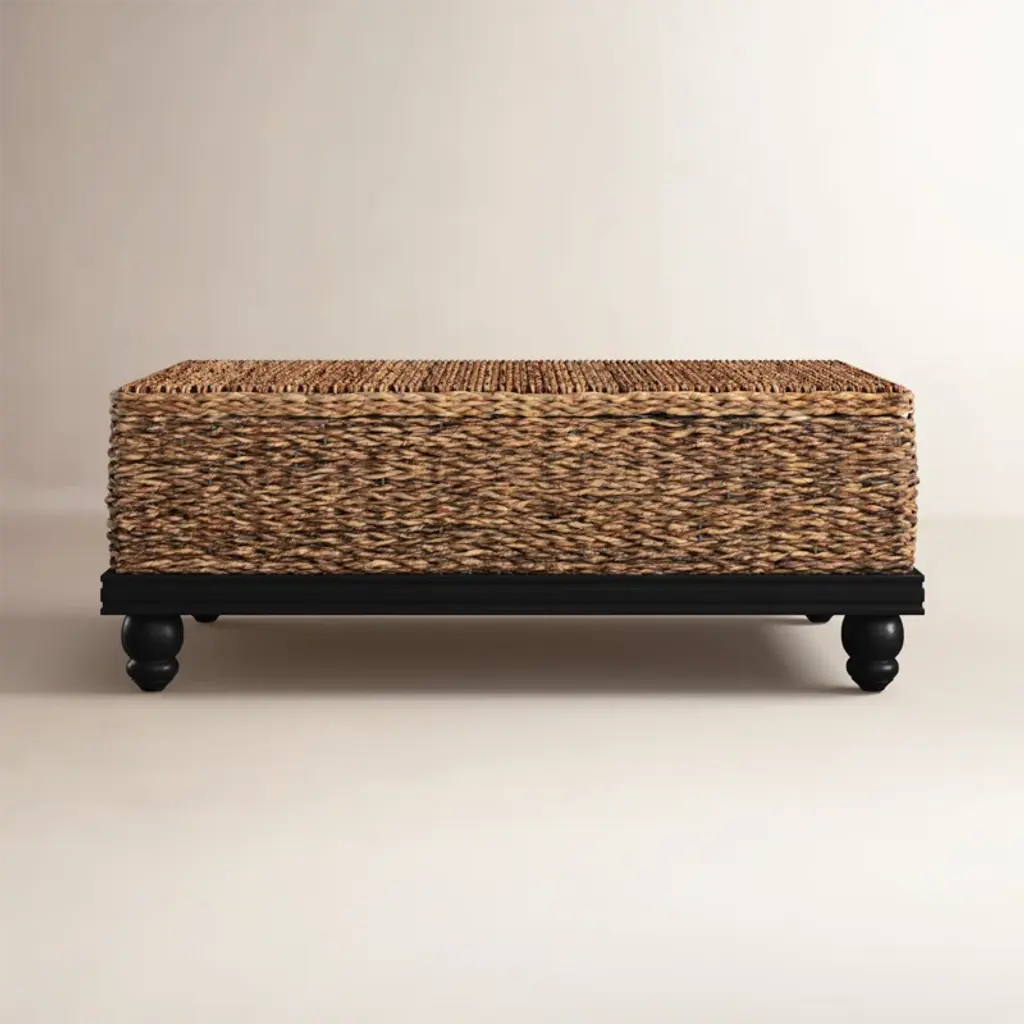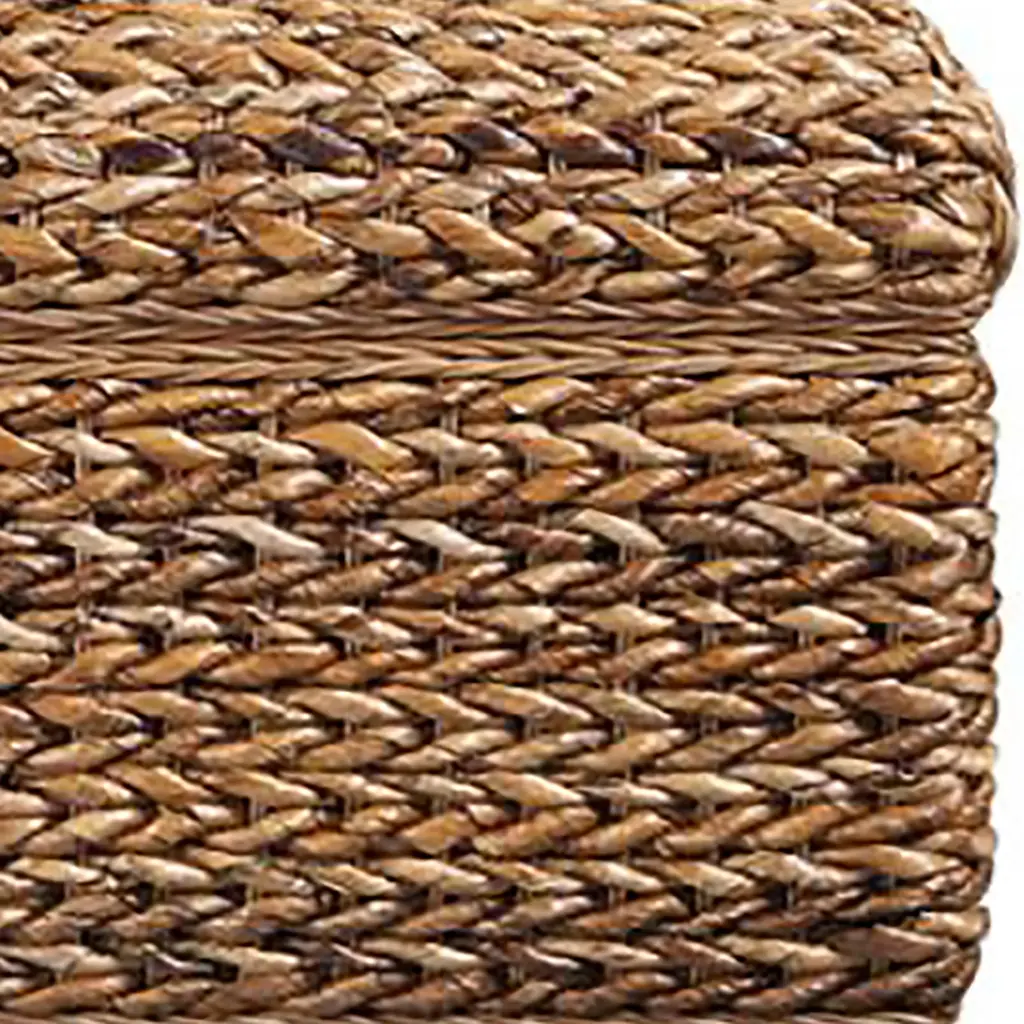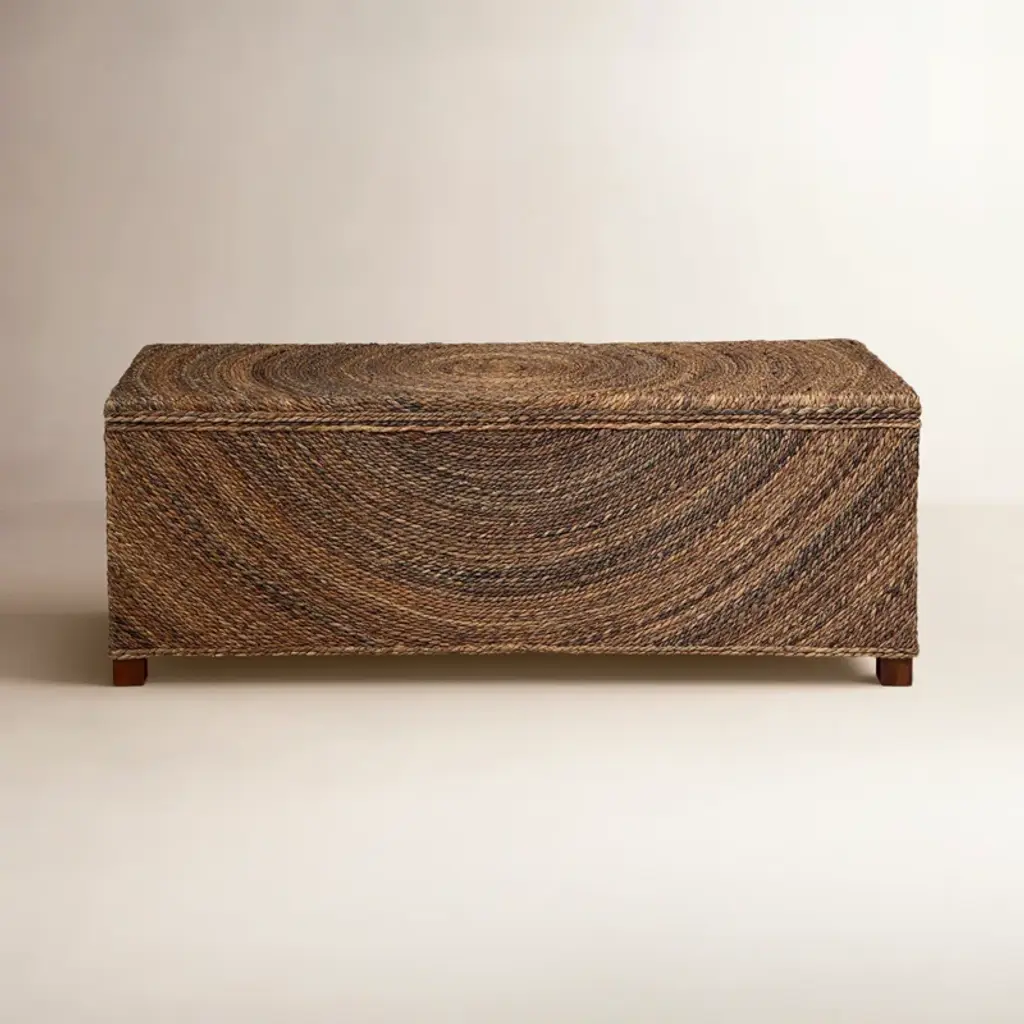 Romance Copy Ethnic-inspired, sturdily built and made from natural woven banana leaf, this charming trunk is embellished with light hand distressing in a rich natural brown finish. Its ample storage makes the trunk a highly practical piece to place in a living room or family room, for stowing items while providing a relaxed accent to your space. Product Details Set includes One (1) trunk Dimensions 19 inches high x 42.25 inches wide x 18.25 inches deep Finish Color Amber and Honey Materials Mahogany Weight limit 300 lbs