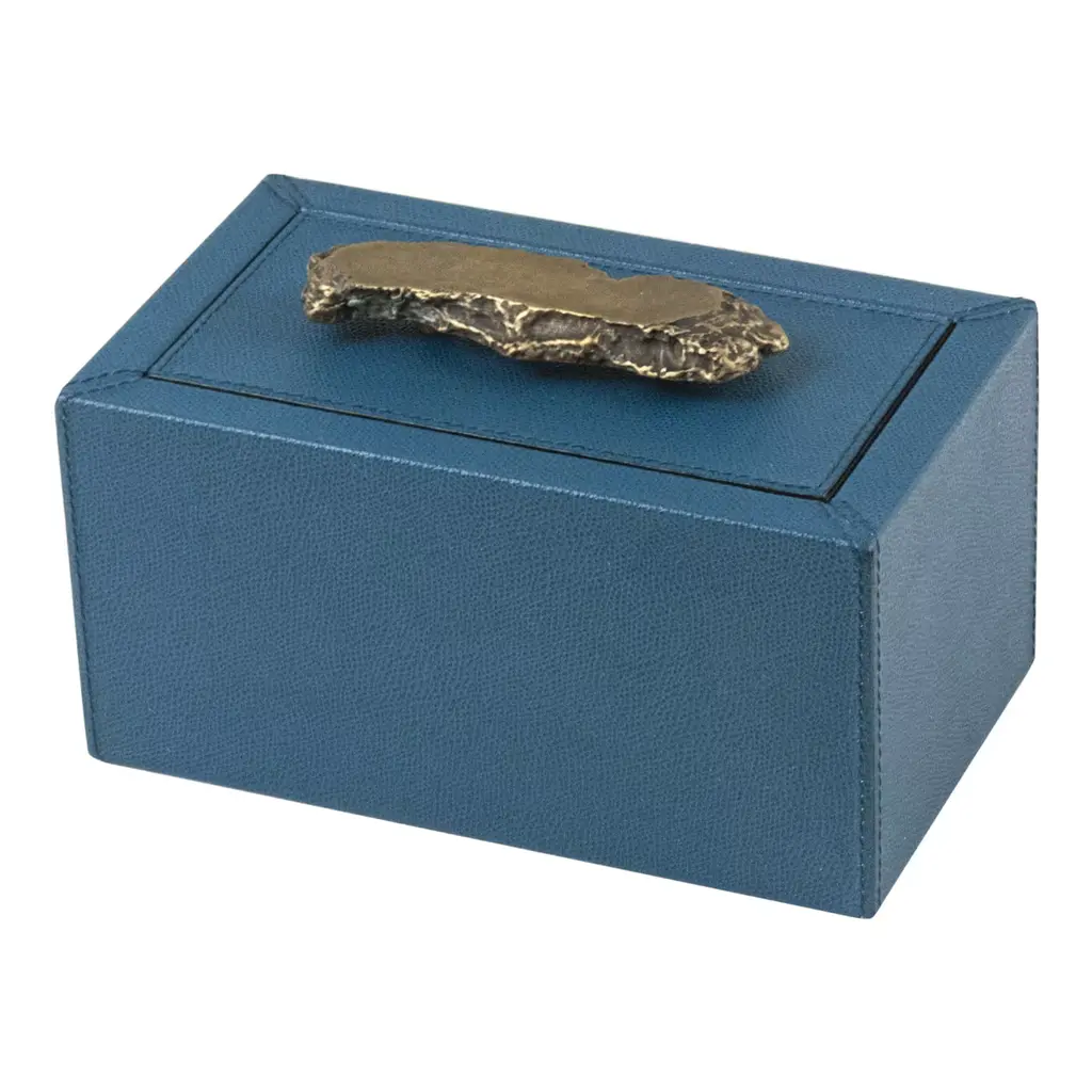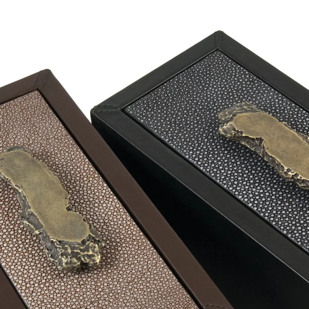 Part of the Ambra collection in the Shagreen Edition, this precious piece of functional decor will make a statement in any room of the house. Either to collect everyday objects in an entryway, or to store valuable family memories, this piece will add a sophisticated touch to any decor. Its wood structure is entirely covered in fine nappa leather. The lid is particularly striking, thanks to its real shagreen leather cover and a sculpture-like handle in metal with a bronze finish. The available color combination is mole brown or black.