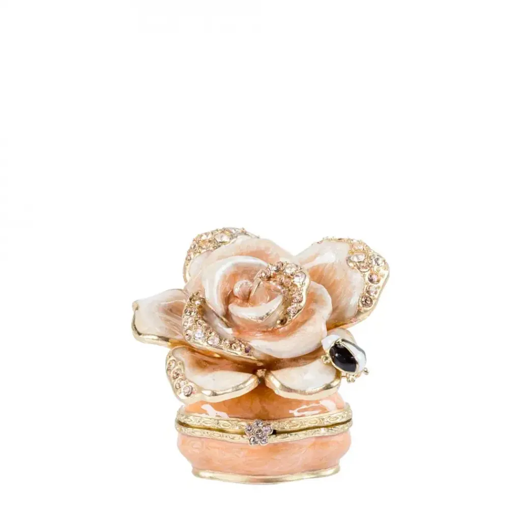 A mesmerizing kaleidoscope of beautiful ivory butterflies dances across the top of this heart-shaped box. Filled with your treasures or given as a gift to a loved one, this box is a true work of art. Hand enameled in vibrant shades of white, plated in 14K gold, and adorned with meticulously hand-set opalescent European crystals on each butterfly's wing, it's a piece that will be cherished for years to come.