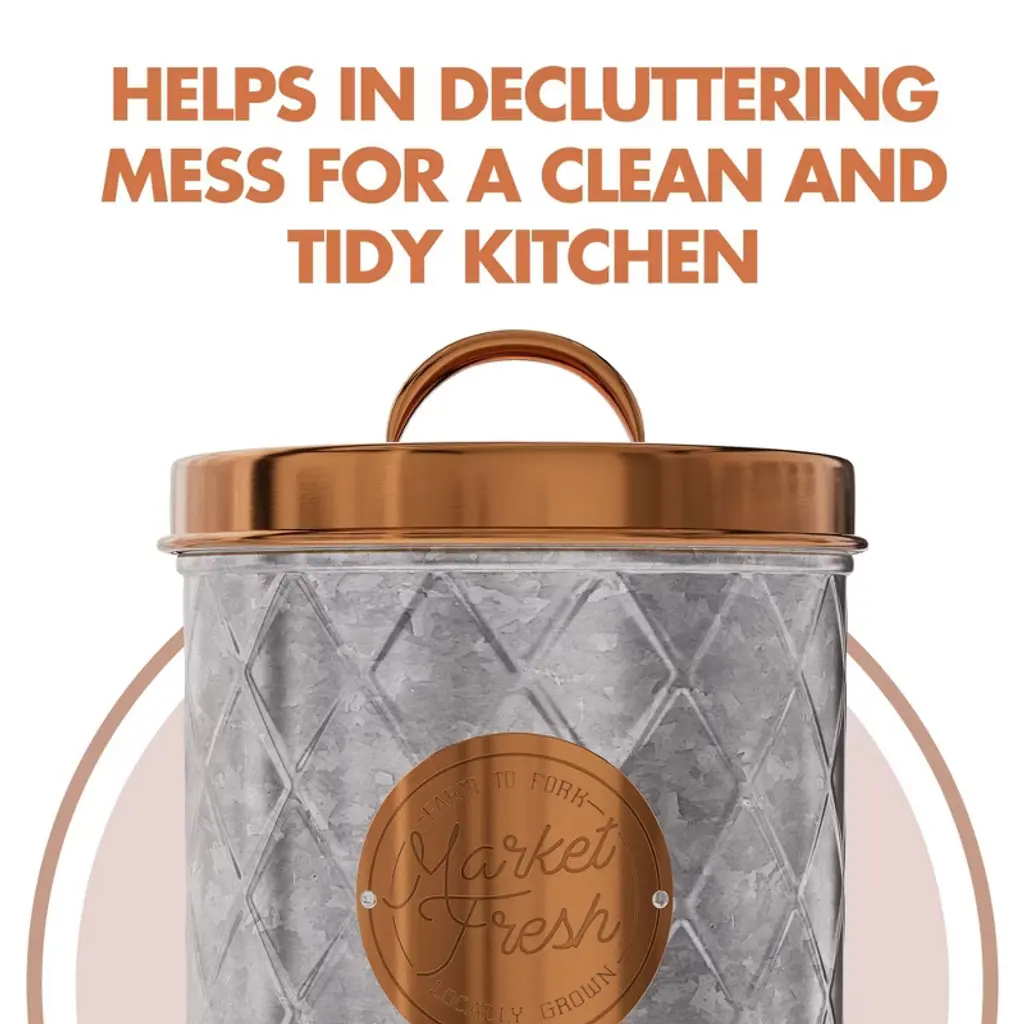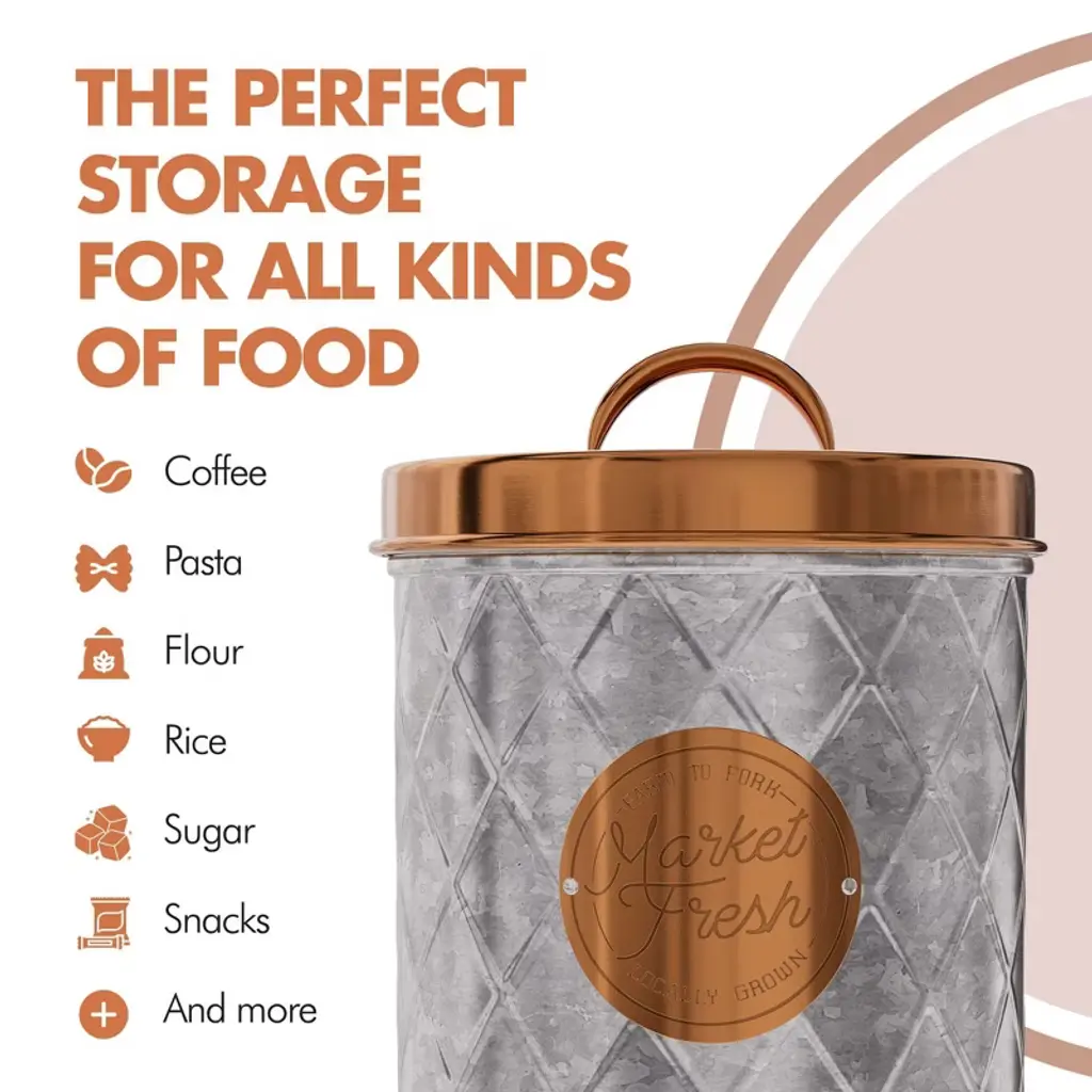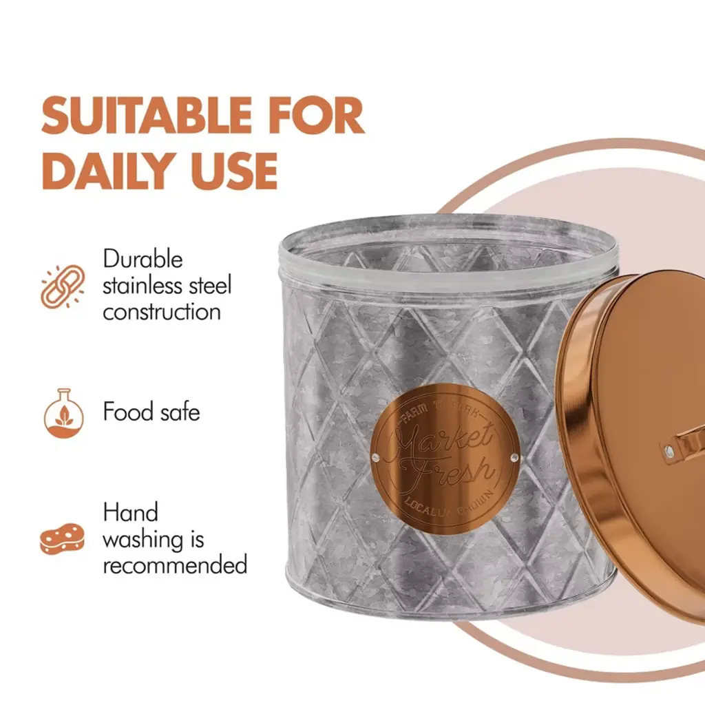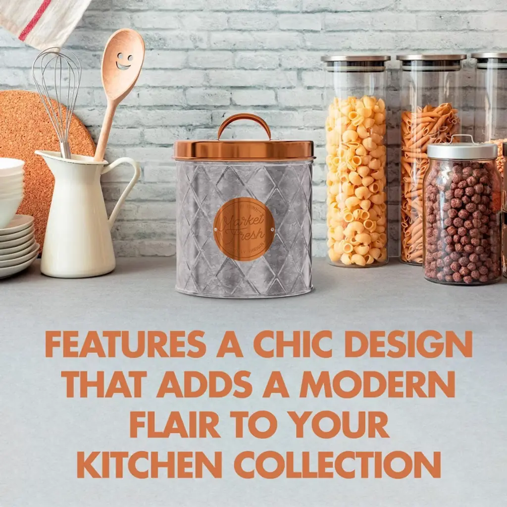 The Amici Home Bristol Stainless Steel Canister is designed to keep your coffee, tea, sugar, flour, and snacks fresh while adding farmhouse-inspired style to your kitchen. Constructed from durable food safe stainless steel, this 84 oz storage jar measures 7" x 6.25" and provides ample space for pantry essentials. Whether you’re storing coffee beans, ground coffee, loose tea, tea bags, sugar, flour, or dry snacks, this airtight canister offers both functionality and charm. The wide mouth opening makes it easy to scoop flour, measure sugar, or fill with snacks, while the copper-tone metal lid with handle adds a decorative farmhouse touch. Equipped with a tight silicone gasket seal, this canister locks in freshness by keeping air and moisture out. That makes it especially useful for preserving the flavor of coffee and tea, as well as maintaining the texture of sugar, flour, cookies, crackers, or snacks. For care, hand wash with mild soap and dry immediately; not safe for dishwasher or microwave use. With its large capacity, airtight seal, and versatile design, the Amici Home Bristol Stainless Steel Canister is the ideal choice for keeping coffee, tea, sugar, flour, and snacks organized, fresh, and stylishly displayed.