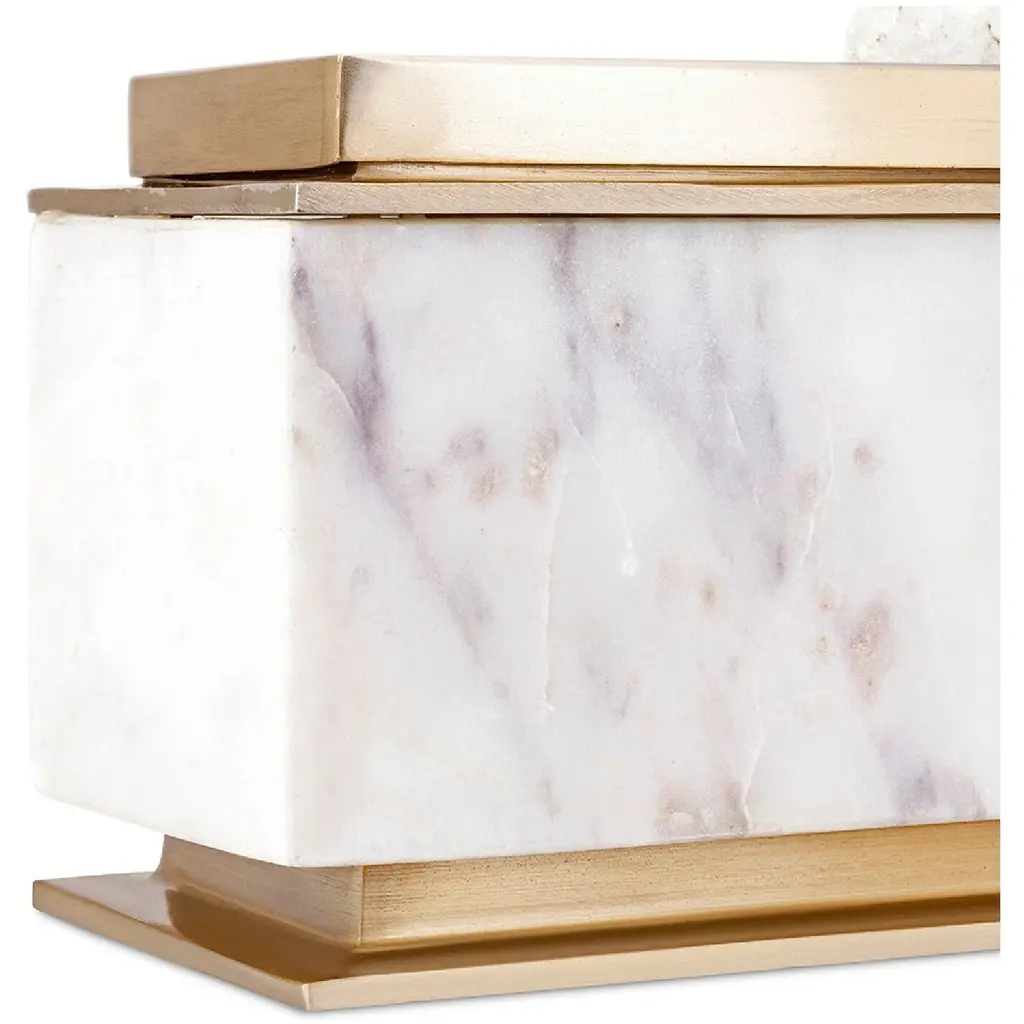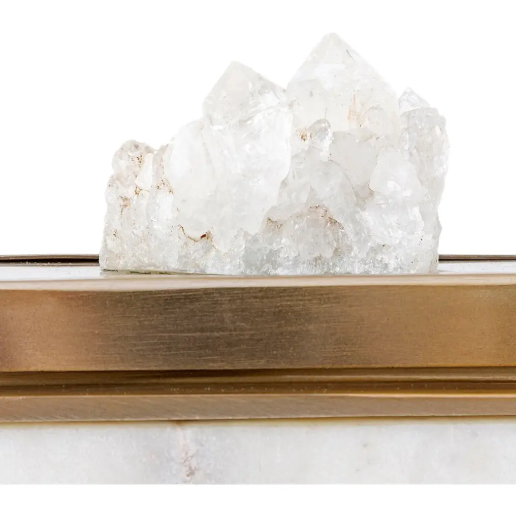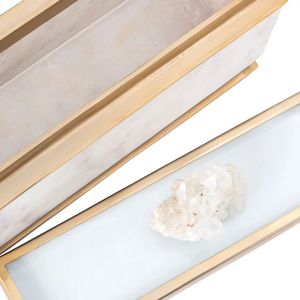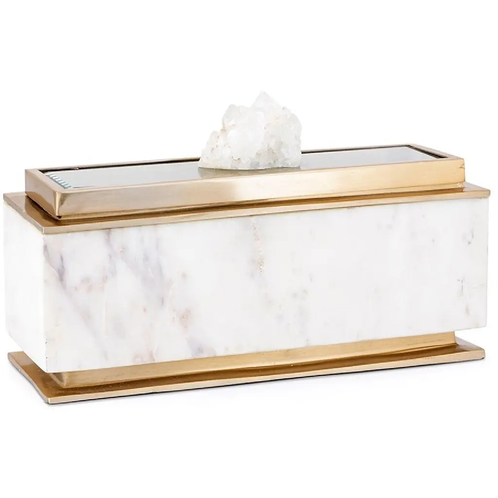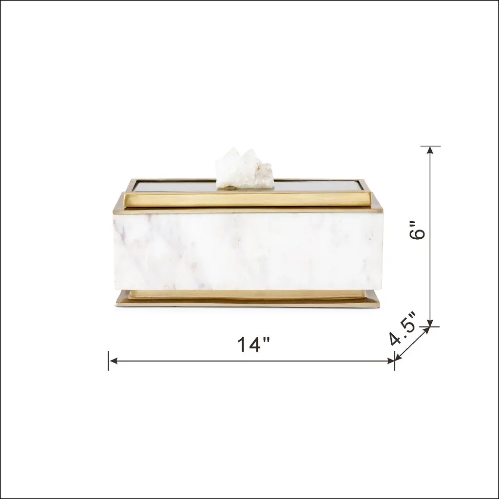 Expertly crafted from premium marble, aluminum, and iron, this decorative storage box boasts an organic white hue that is contrasted by gleaming gold touches at the lid and base. Completing the alluring visuals, a natural stone adorns the transparent glass lid, making for a luxurious yet functional addition to your home decor.