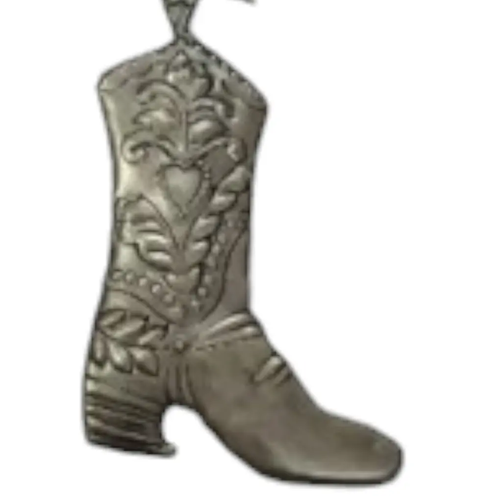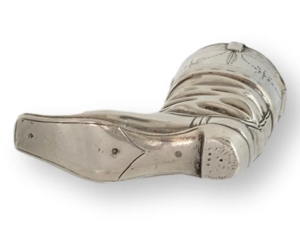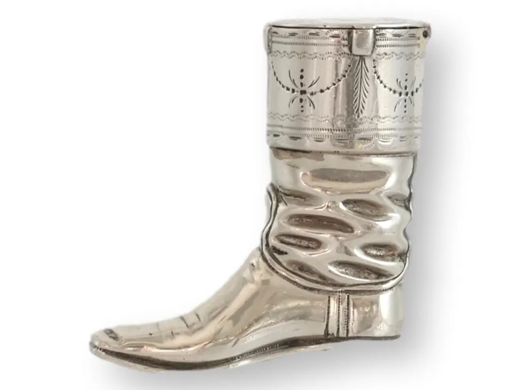 Rare antique figural snuff box in the form of a slouched riding boot, crafted in silver plate with ornate etched detailing and monogrammed lid. The lid opens on a hinged top, revealing an interior cavity. A charming and highly collectible novelty piece, likely dating to mid 19th century, and perfect tobacciana collectors.