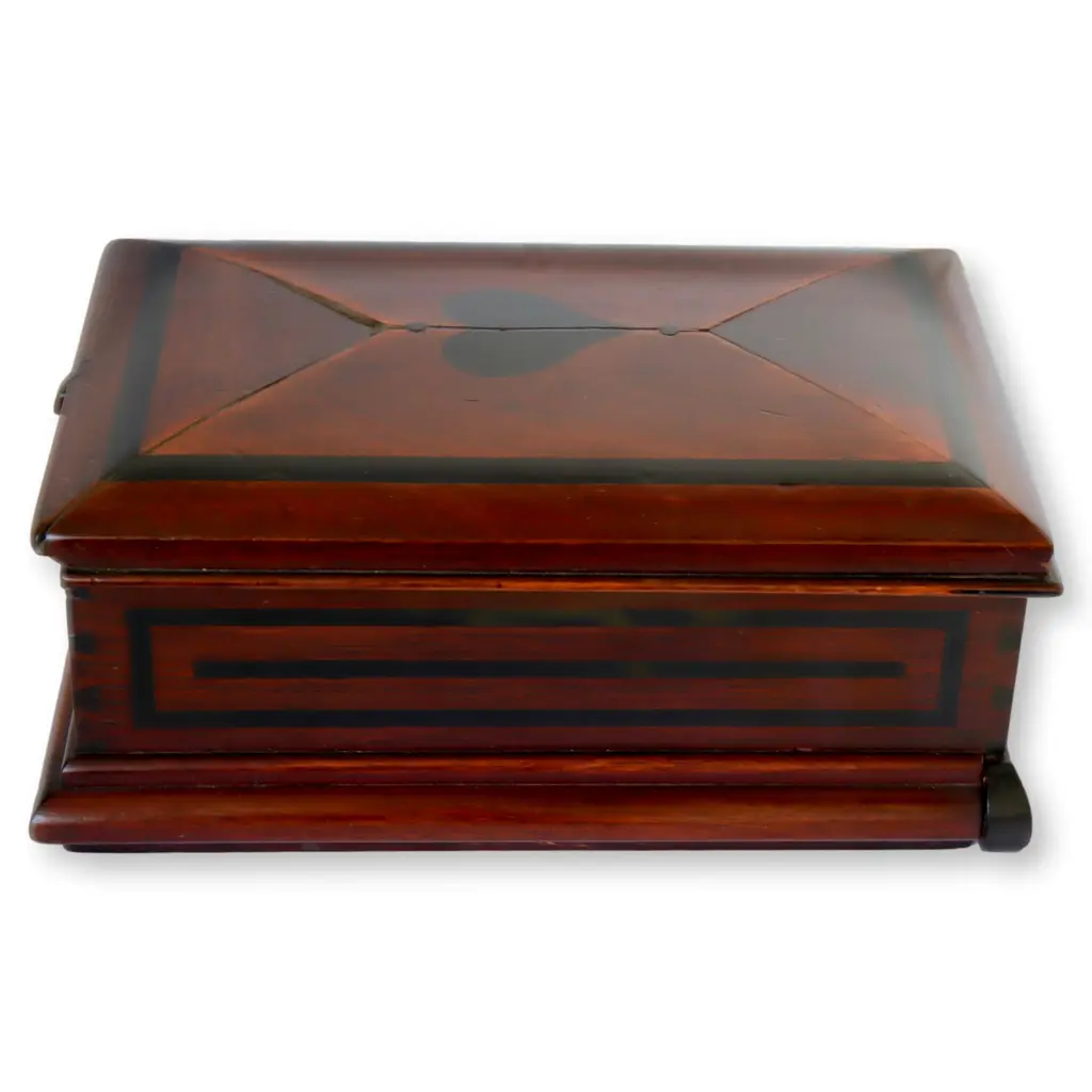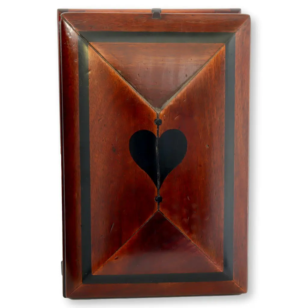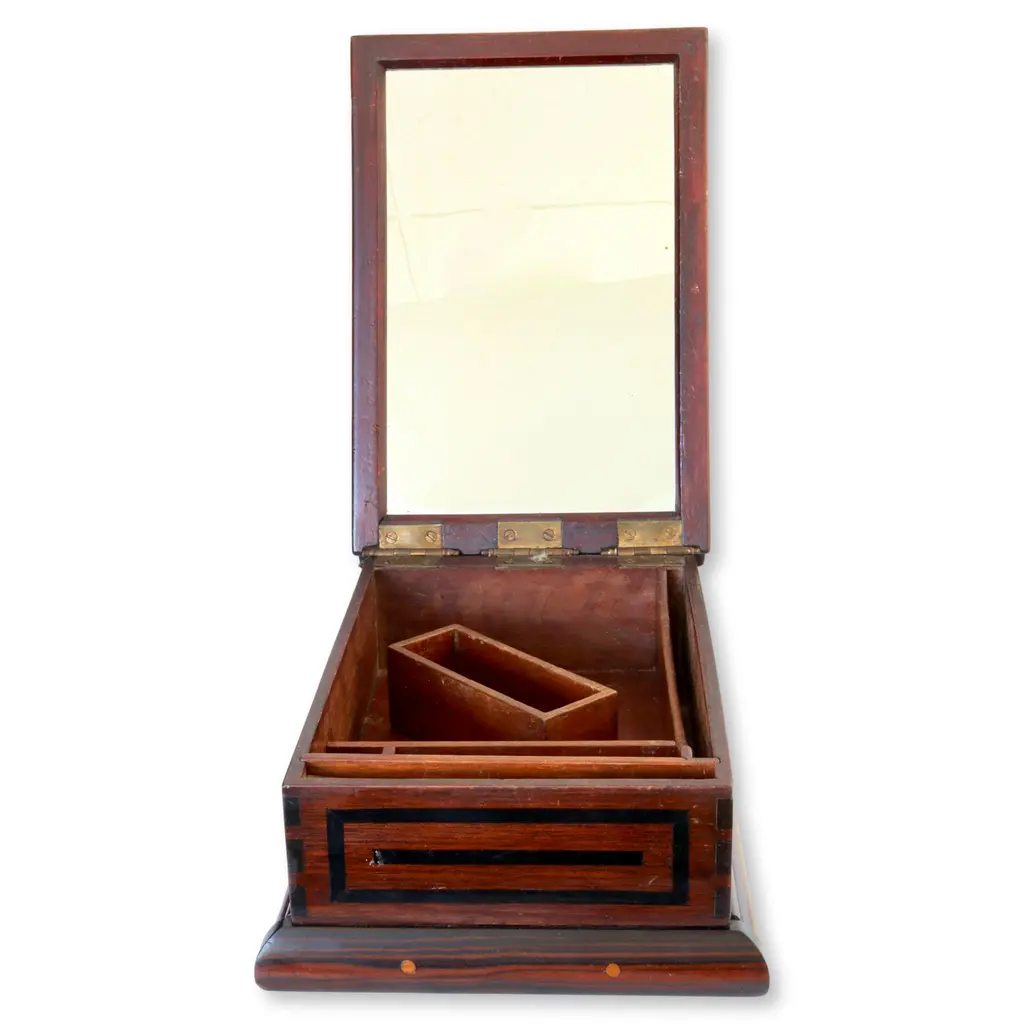 Antique American folk art vanity or dresser box with heart. Skillfully hand-made with fine attention to detail and tongue and groove joints. Mirrored inside. It would have been a gentlemen's dresser box, with a bottom drawer for collars. The drawer is concealed, making somewhat of a safe hiding place for valuables. Purchased in Coastal Maine.