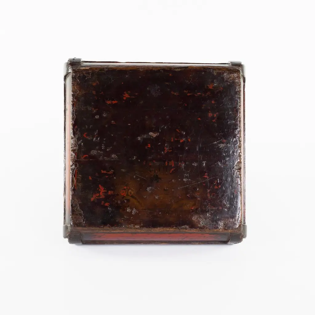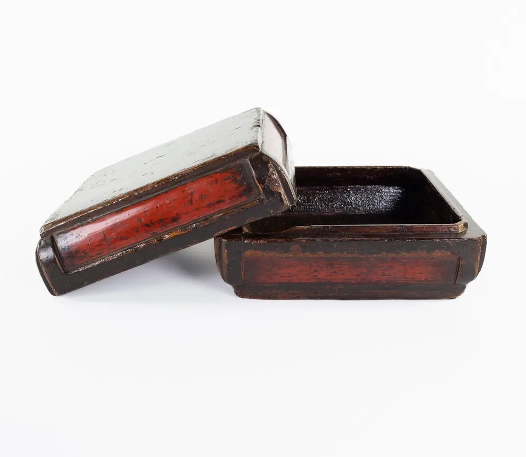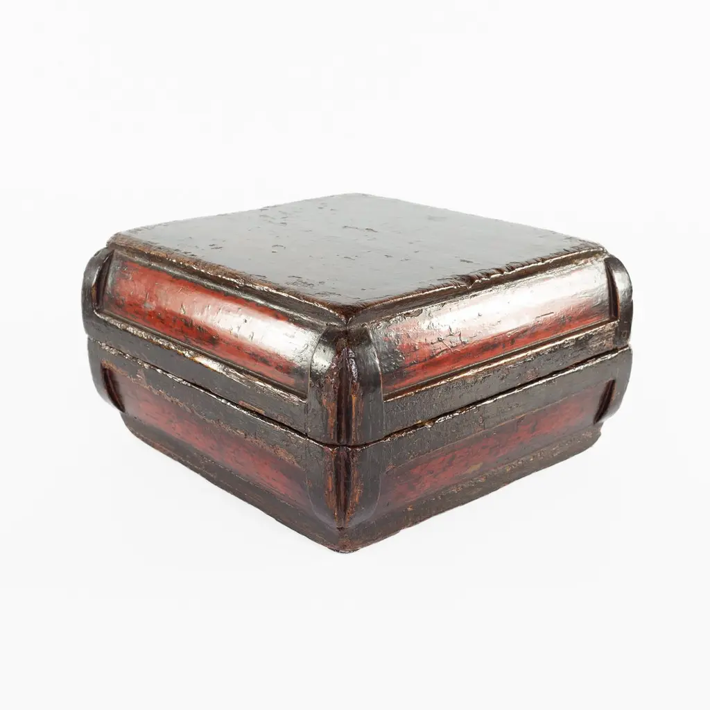 Antiqued red lacquer trinket boxThis trinket box measures: 14 wide x 14 deep x 7.5 inches highThis box is in Excellent Vintage Condition with minor marks, dents, and wear.We take our photos in a controlled lighting studio to show as much detail as possible. We do not photoshop out blemishes. We keep you fully informed regarding your purchase - because we want you to be happy and tell everyone how easy it is to buy real Mid-Century Modern decor online without throwing their money away.When you purchase a piece we carefully clean and prepare it for shipping.
