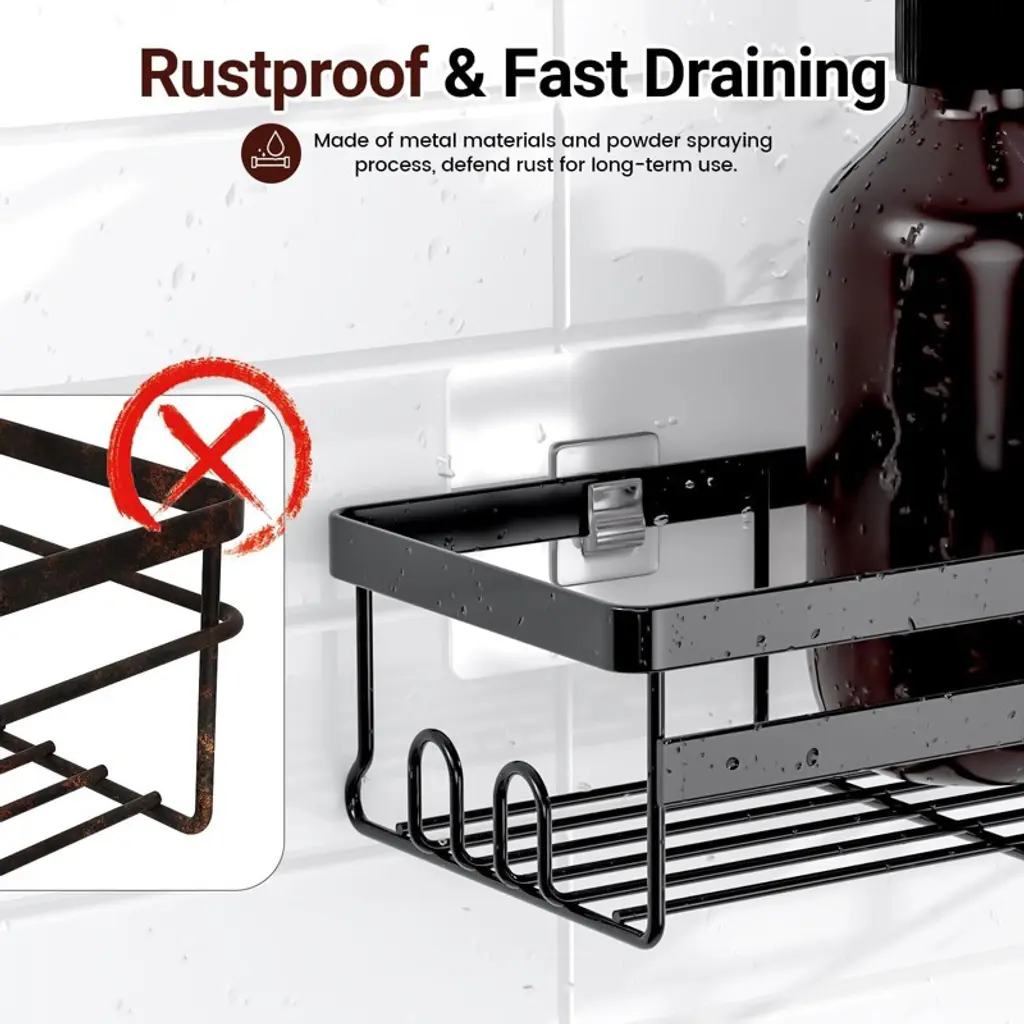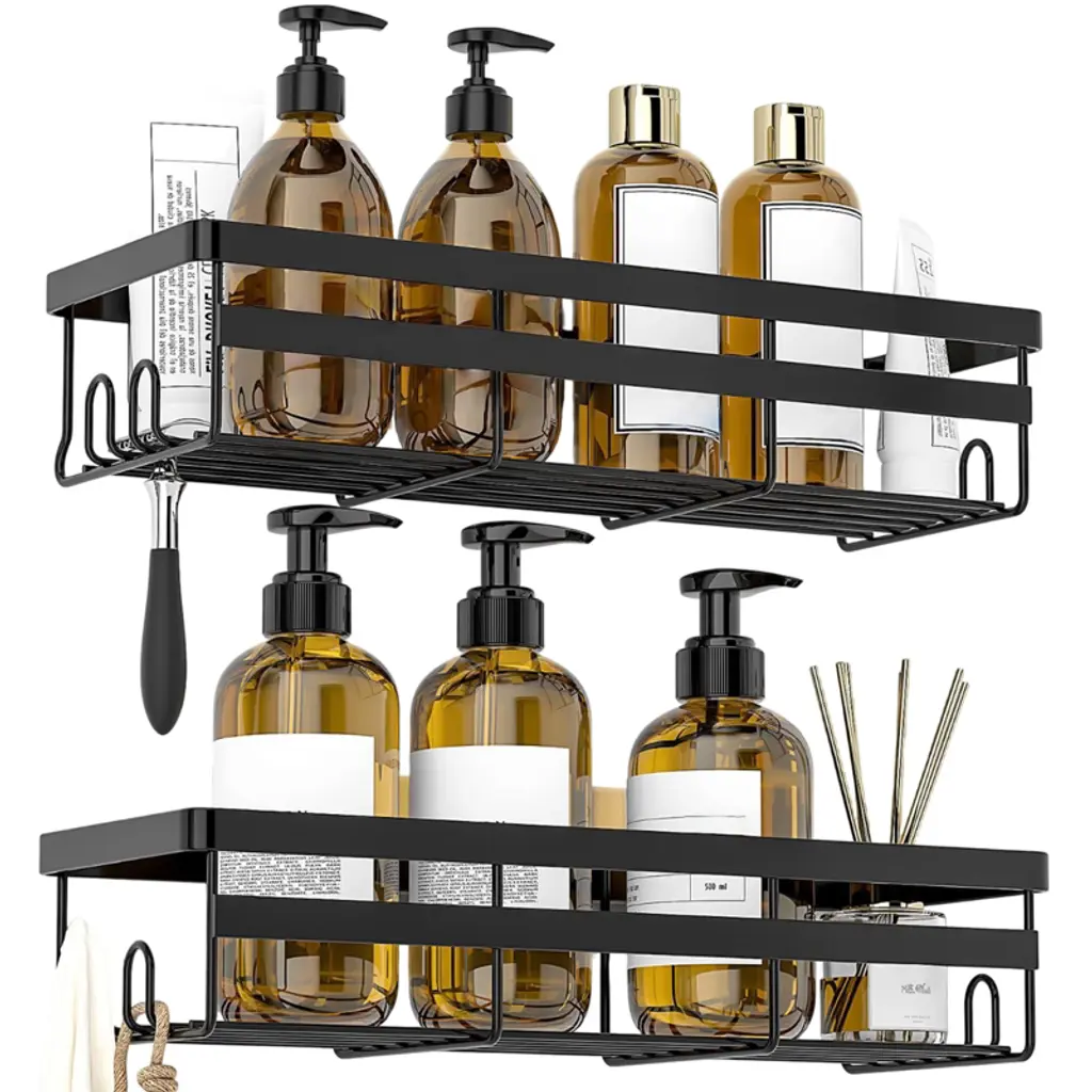 Looking for a practical and versatile storage solution? Our shower caddies are a must - have. You'll get 2 caddies, 2 transparent adhesive stickers, and a user manual. Crafted from 100% rust - proof metal with an extra rust - proof coating, these caddies are durable and moisture - resistant. The upgraded frame with a front fence can bear over 30 lb, ensuring stability. No need for drilling; just use the adhesive stickers to install them. In the bathroom, they're perfect for shampoo, soap, and other toiletries, saving valuable space. The hooks can hold towels and small items. Beyond the bathroom, they're great for the bedroom, kitchen, or living room, where they can store snacks, drinks, and decorative items. They help keep your living spaces tidy and organized, making your daily life more convenient.
