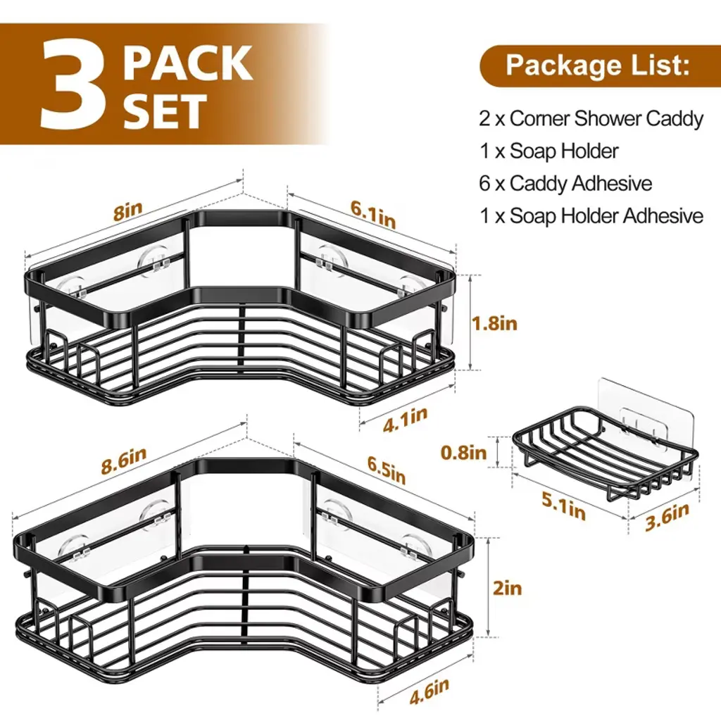 Discover the ultimate shower storage solution! This 3 - pack shower caddy is a game - changer. It can hold up to 40 lbs, thanks to its advanced adhesive technology that leaves no residue on walls. Made of premium stainless steel, it's waterproof and rustproof, ensuring long - term use. Installation is a breeze - no drilling required. Just peel and stick it on dry, smooth walls and let it cure for 24 hours. With 8 hooks and a soap holder, it helps you keep your shower essentials organized. It's not only for bathrooms but also suitable for bathtubs, RV sink areas, kitchens, and laundry rooms. Say goodbye to clutter and hello to a more organized life!