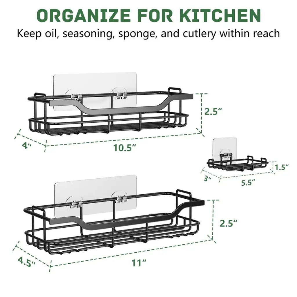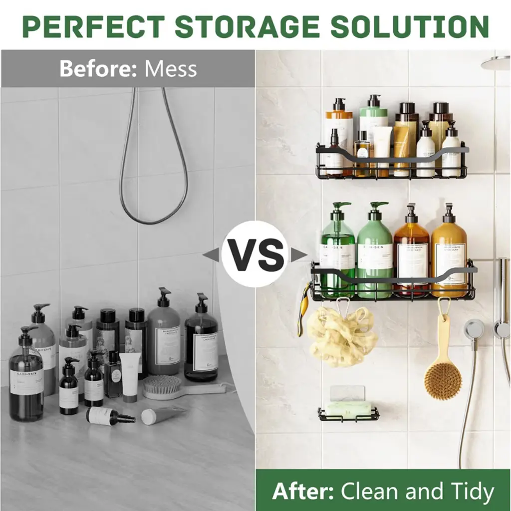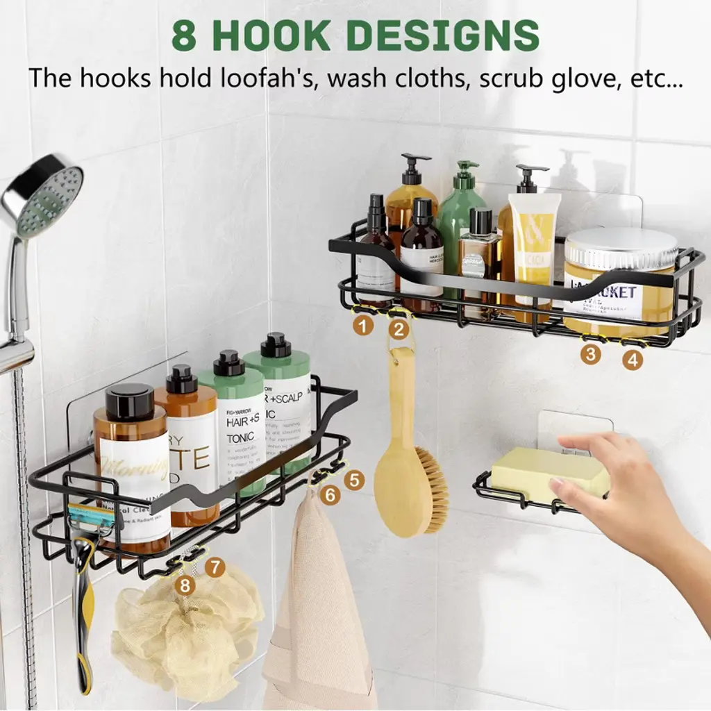 Upgrade your shower organization with this 3 - pack shower caddy set. It includes 2 shelves and 1 soap holder, along with 8 hooks for additional storage. The caddy is made of stainless steel with a spray - paint process, ensuring it's durable and rustproof in the humid shower environment. Installation is a breeze; no drilling or tools are needed. Just clean the surface, apply the adhesive, wait 24 hours, and hang it up. It can hold up to 40 pounds without shaking, making it suitable for smooth walls, glass, tile, or marble surfaces. This caddy helps you keep all your shower essentials like conditioner bottles, soap, and sponges neatly organized, providing a convenient and clutter - free shower experience.