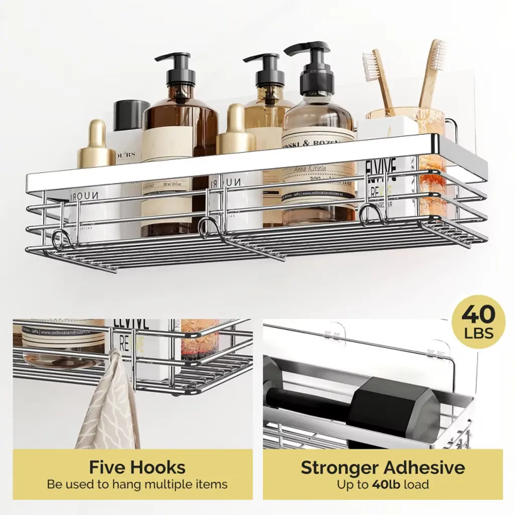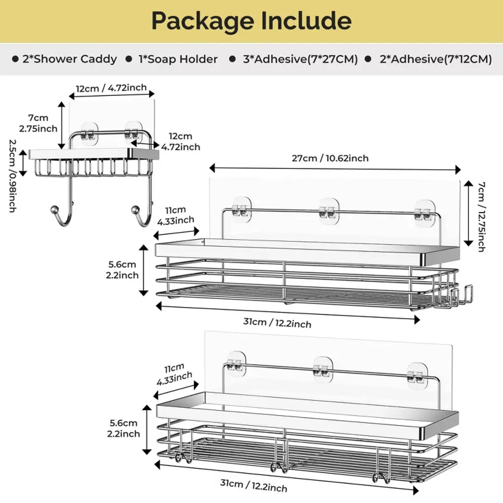 Aoibox Adhesive Shower Caddy With Soap Dish Holder And Hooks, Wall Mounted Bathroom Organizer,stainless Steel Storage Rack,no Drilling Required,3-pack