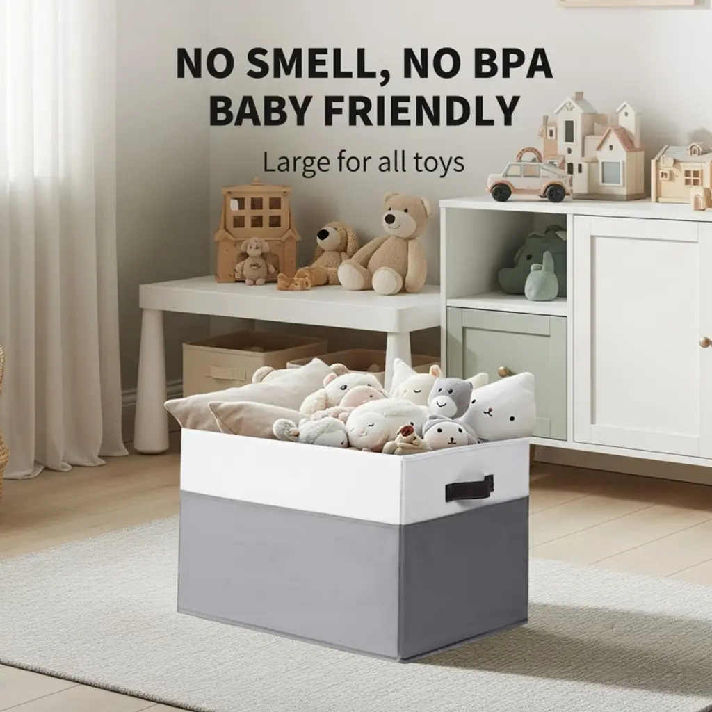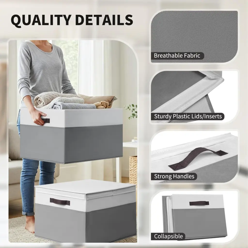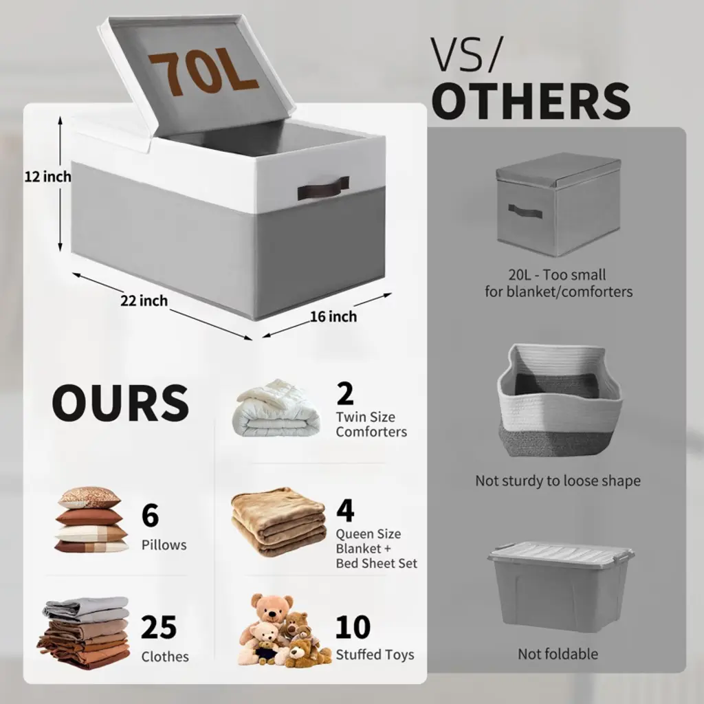 Discover a new level of home organization with these extra large storage baskets, designed to hold twice as much as ordinary bins without losing their sturdy shape. With a spacious 70L capacity, dustproof lids, and stylish two-toned design, they not only keep your space neat but also add a decorative touch to any room. Versatile, stackable, and easy to carry, these bins are perfect for tidying up your living room, nursery, or closet while complementing any decor.