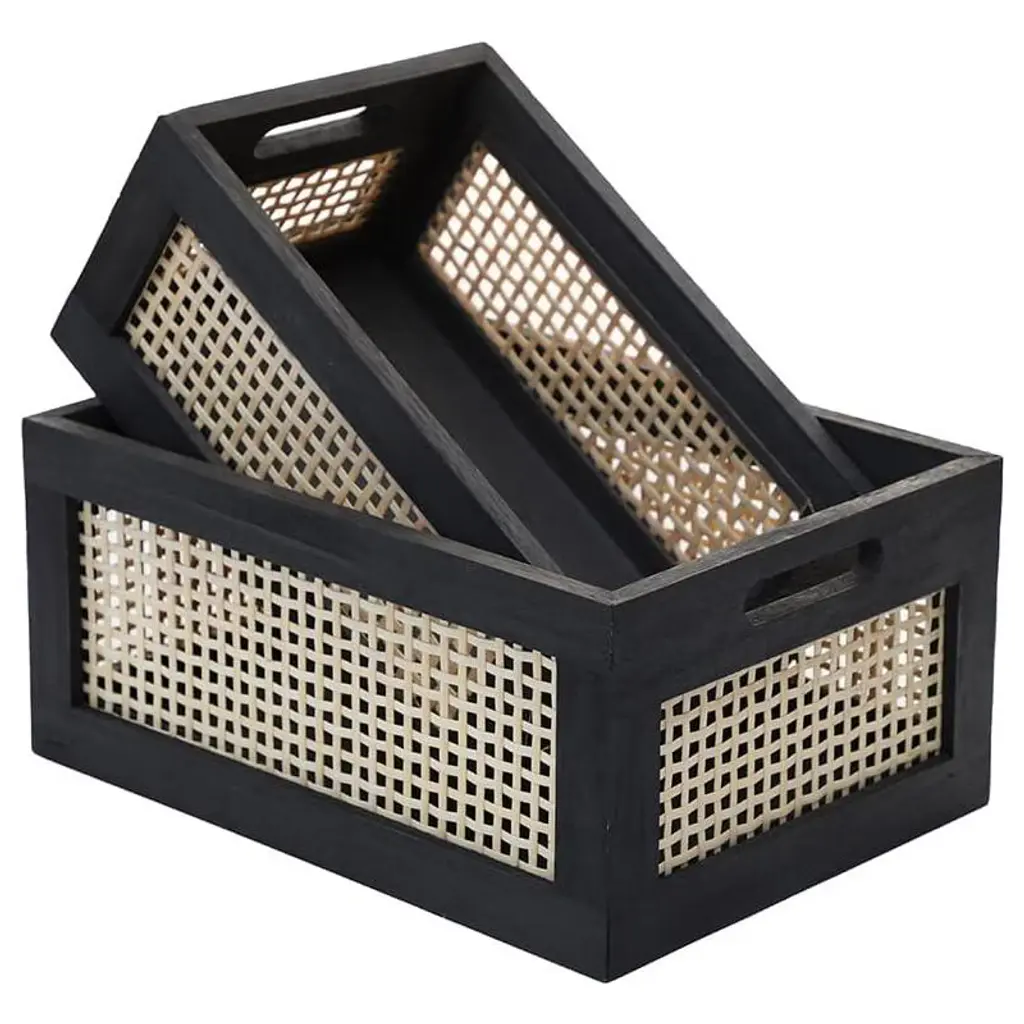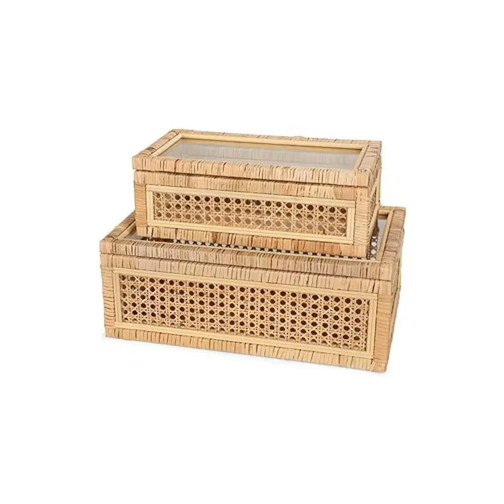 Organize your space in style with this set of four handmade rattan storage baskets, crafted with premium materials and sturdy wooden frames for lasting durability. Featuring an elegant woven design and convenient side handles, these baskets add a rustic farmhouse touch while effortlessly storing towels, snacks, books, and more in any room. Versatile in size and function, they fit perfectly in shelves, closets, and on countertops, making them a charming and practical solution for your home or office.