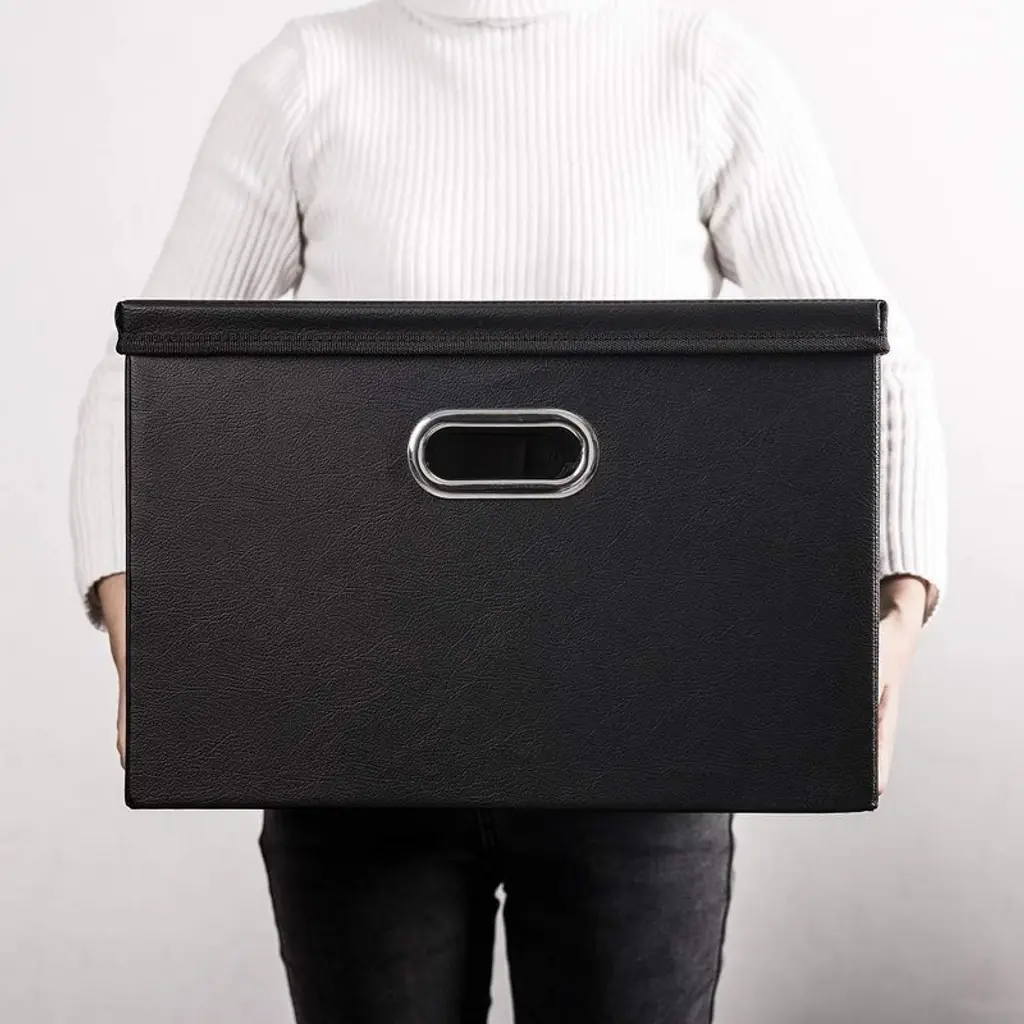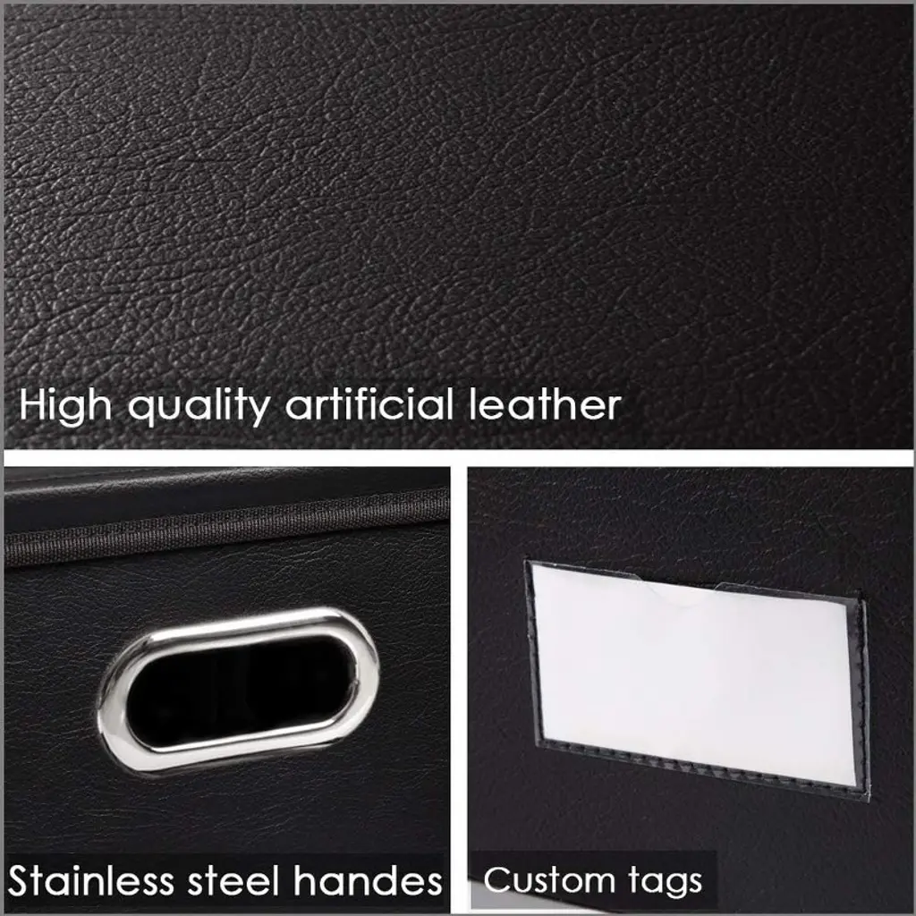 Upgrade your organizing game with this spacious collapsible storage bin, crafted from durable eco-friendly leather fabric and featuring rust-proof stainless steel handles for easy carrying. The sleek black design seamlessly blends with any home or office decor, while the reinforced structure lets you fold it flat when not in use to save valuable space. Its generous dimensions provide ample room for clothes, books, and more, making decluttering stylish and effortless.