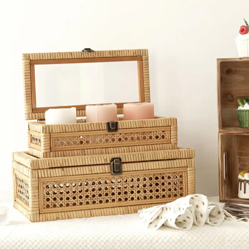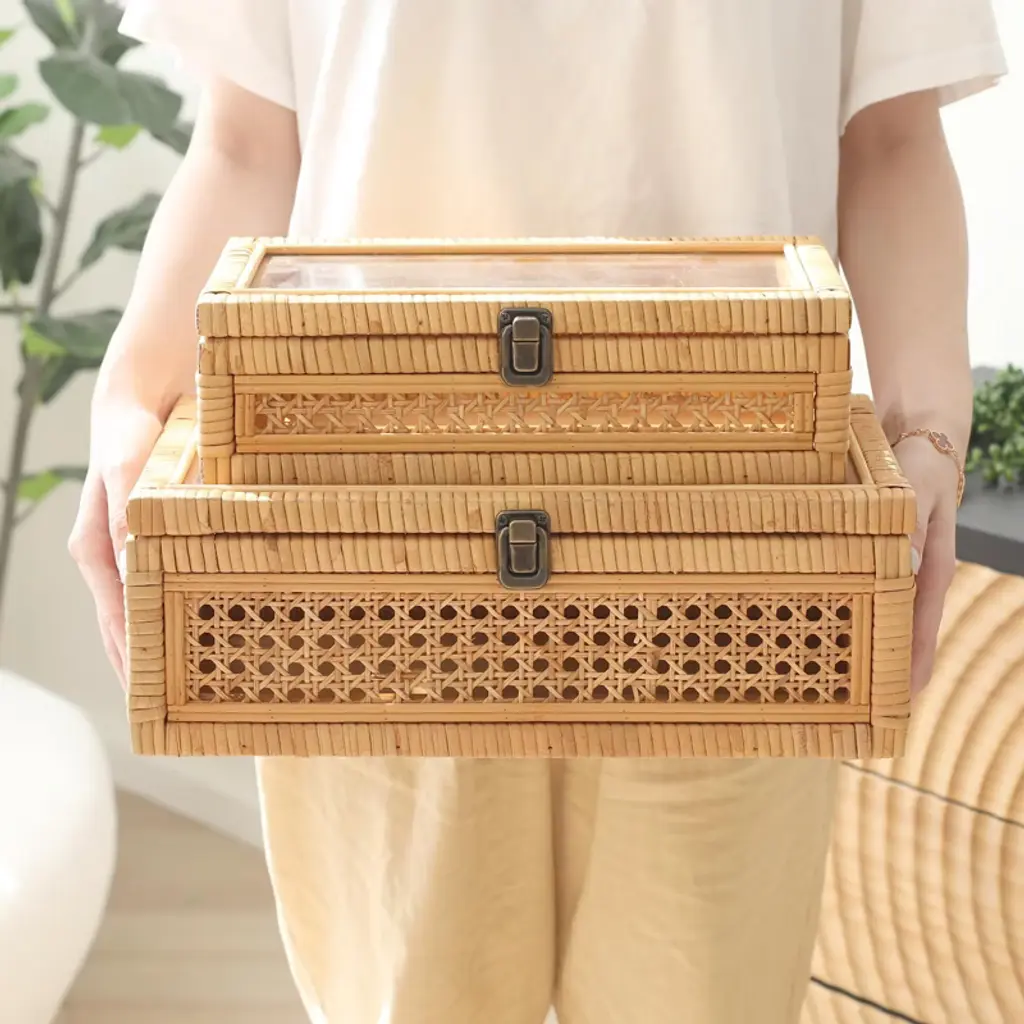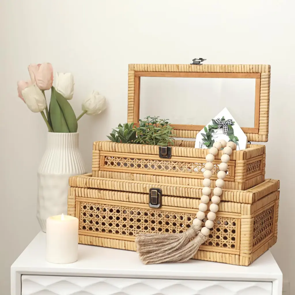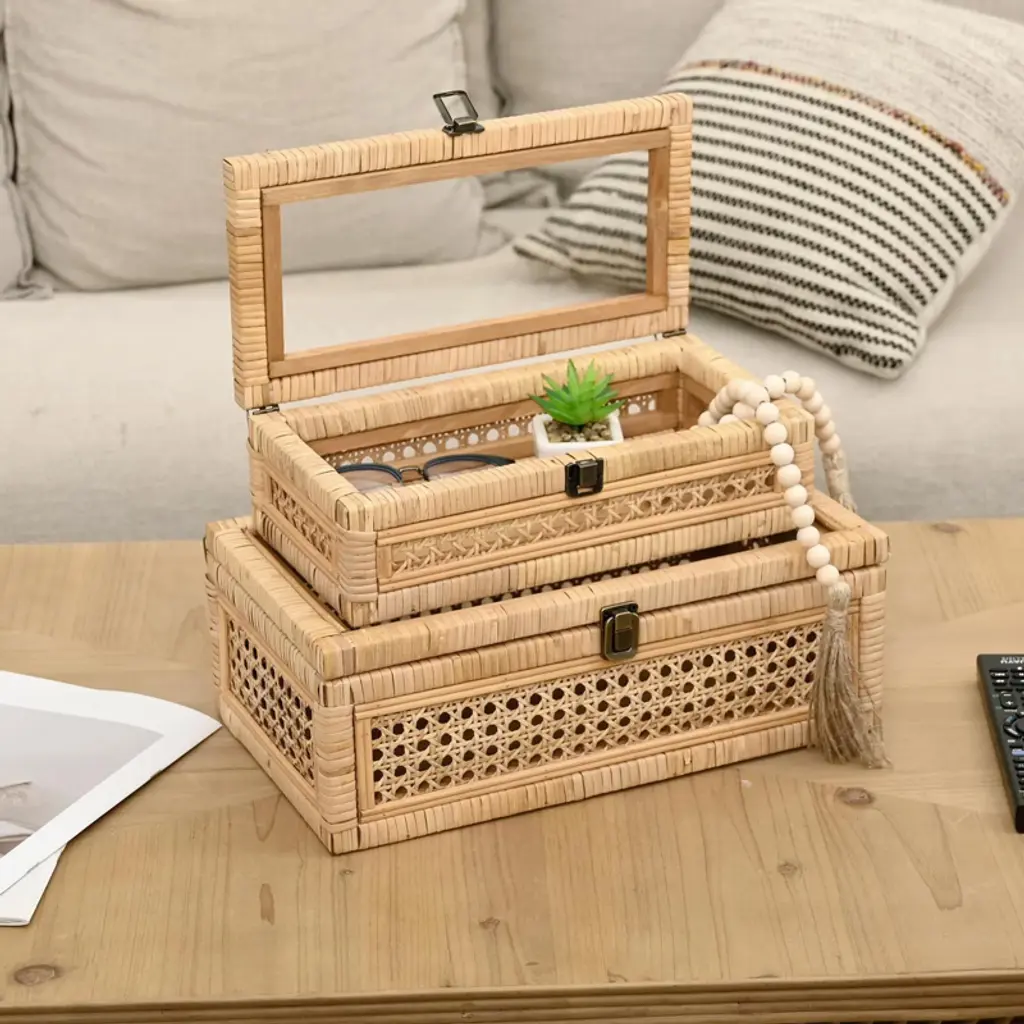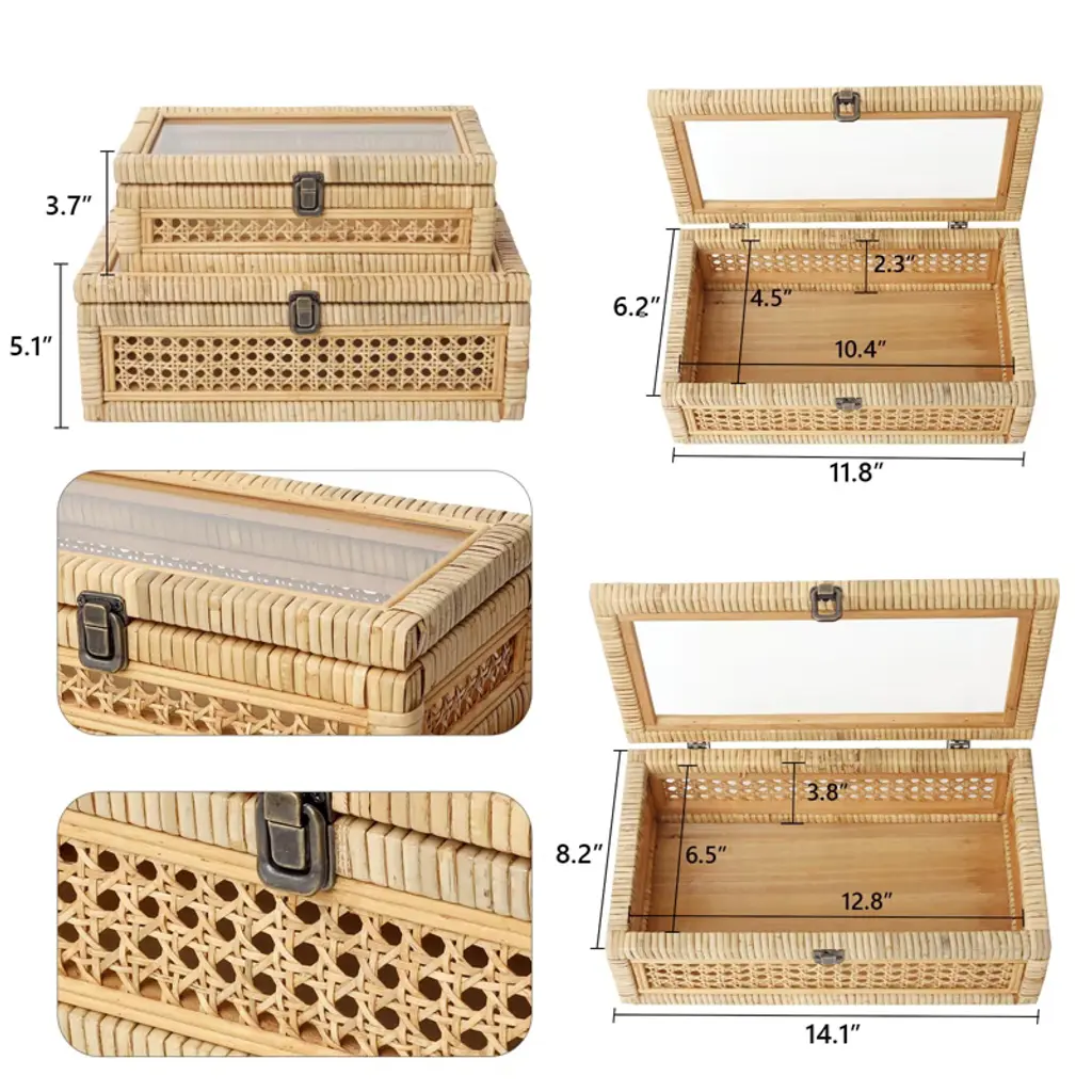 Bring natural charm to your home with this set of two handcrafted rattan and cane stacking boxes, featuring elegant glass top lids for both display and protection. Perfect for storing jewelry, keepsakes, or small treasures, their versatile sizes allow for stylish organization in any space. Designed to complement boho, coastal, and rustic farmhouse decor, these decorative boxes add a sophisticated touch and warmth to your room.