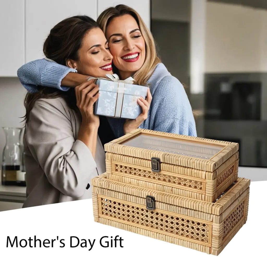 Aoibox Rattan And Cane Stacking Boxes With Glass Top Lid Set Of 2 Boho Rustic Farmhouse Decor Storage Organizer