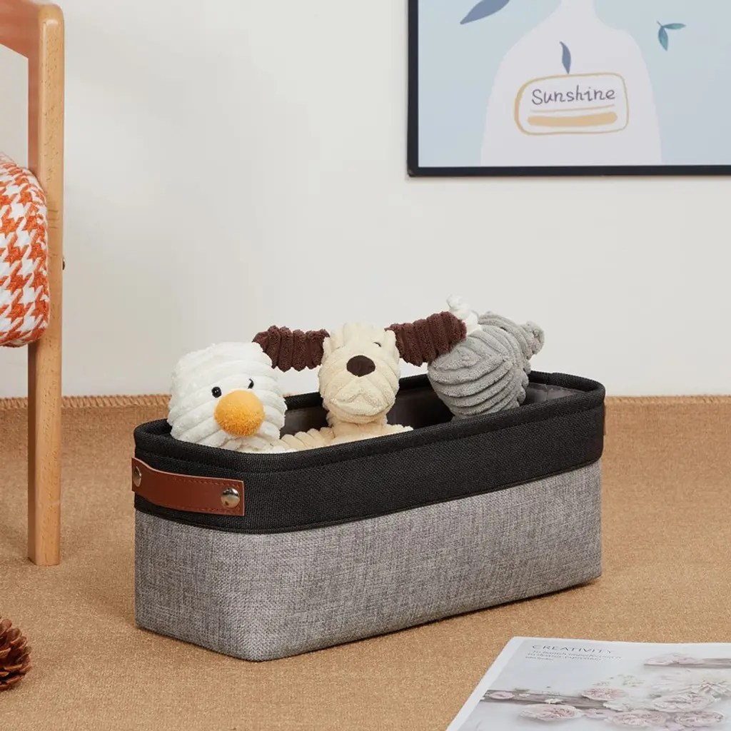 Elevate your home organization with this set of two modern foldable fabric baskets, designed to keep your space neat and stylish. Crafted from durable linen with sturdy handles, these versatile organizers are perfect for storing everything from closet essentials to bathroom accessories and more. The sleek black and grey tones blend easily with any decor, making organization both effortless and decorative.