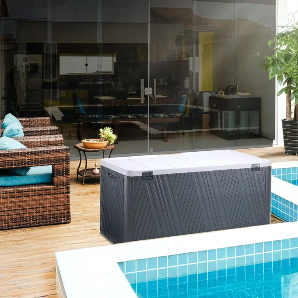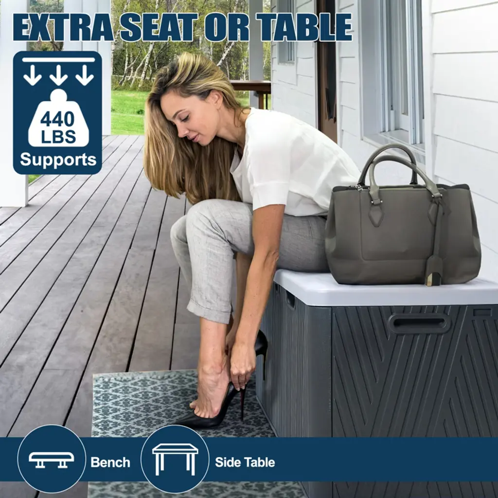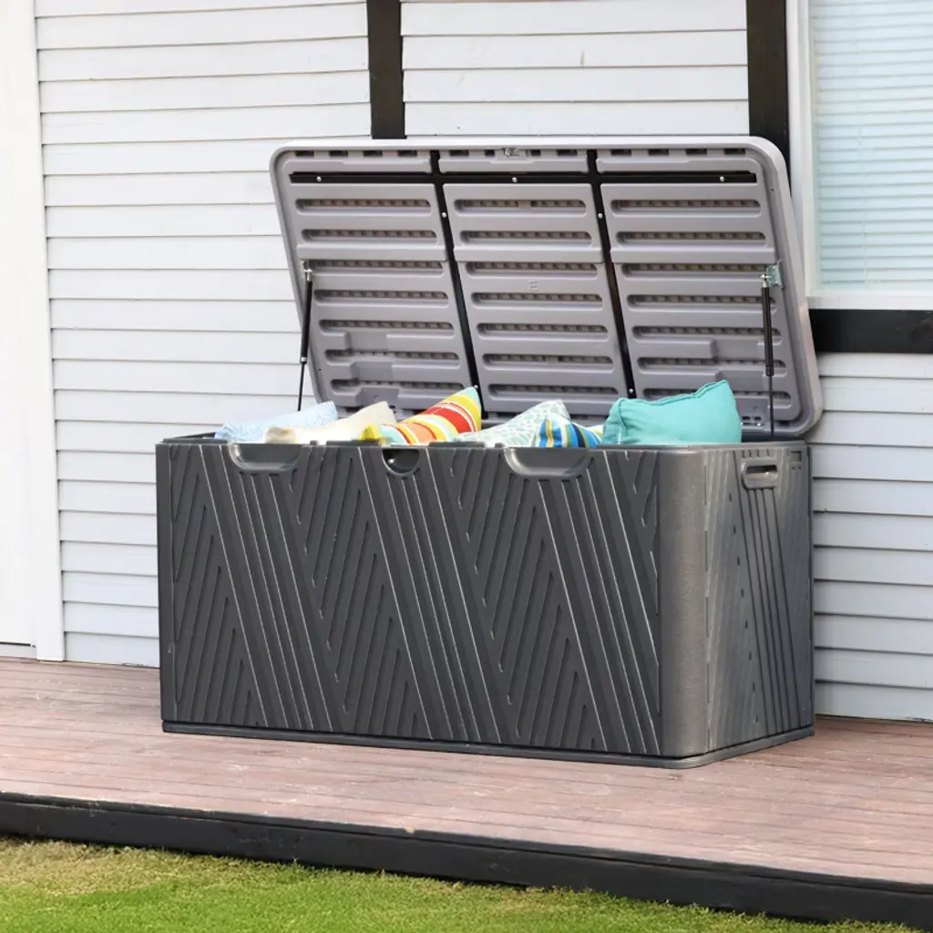 Enhance your outdoor storage with the 71 Gallon Deck Box from Aoodor. This deck box is easy to assemble and large enough as a patio storage box for patio furniture cushions, garden tools, and sports equipment. Made of durable PE material, waterproof and sun protection, can also be used as a bench. Double air rods and a lockable lid provide security for you and your storage.
