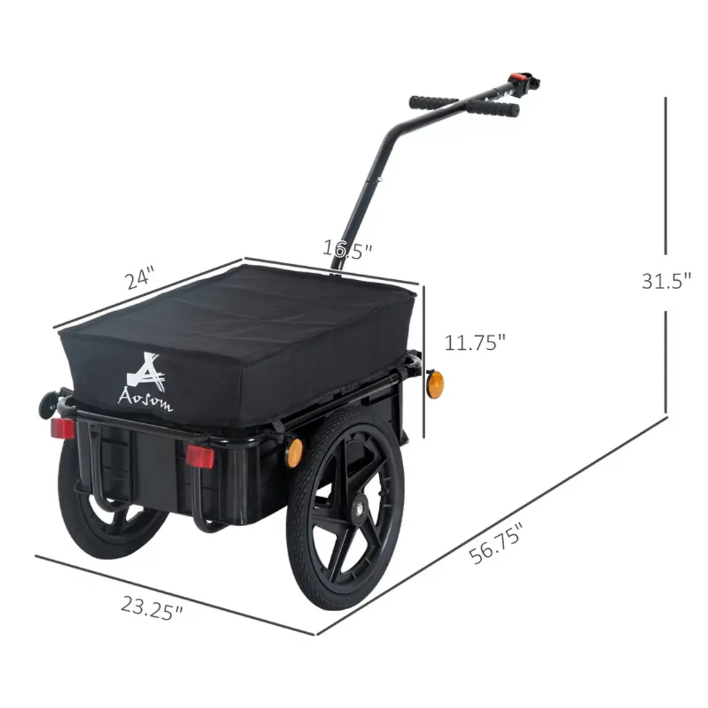 Easy to Use: The bike wagon is convenient to pull by bikes, versatile coupler attaches to most bicycles for convenient use, the red button enables easy installment and disassembly of connector to bicyclesLarge Tires: It will be easy for you to haul and load things up to move, thanks to the two rubber-covered wheels and easy-to-pull handle.Large Cargo: You'll fill the big removable cargo compartment with quite a bit before it's complete. Provide yourself with a handy storage option that lets you conveniently organize your gear, groceries, and supplies.Safety Design: You'll be able to keep your inventory protected with the outdoor storage trailer thanks to the 600 oxford cloth with coating. You'll save yourself in the dark with the included red, yellow, and white reflectors.Bike Trailer Product Information: Overall Dimensions: 56.7" L x 23.23" W x 31.5" H. Weight Capacity: 88 lbs.