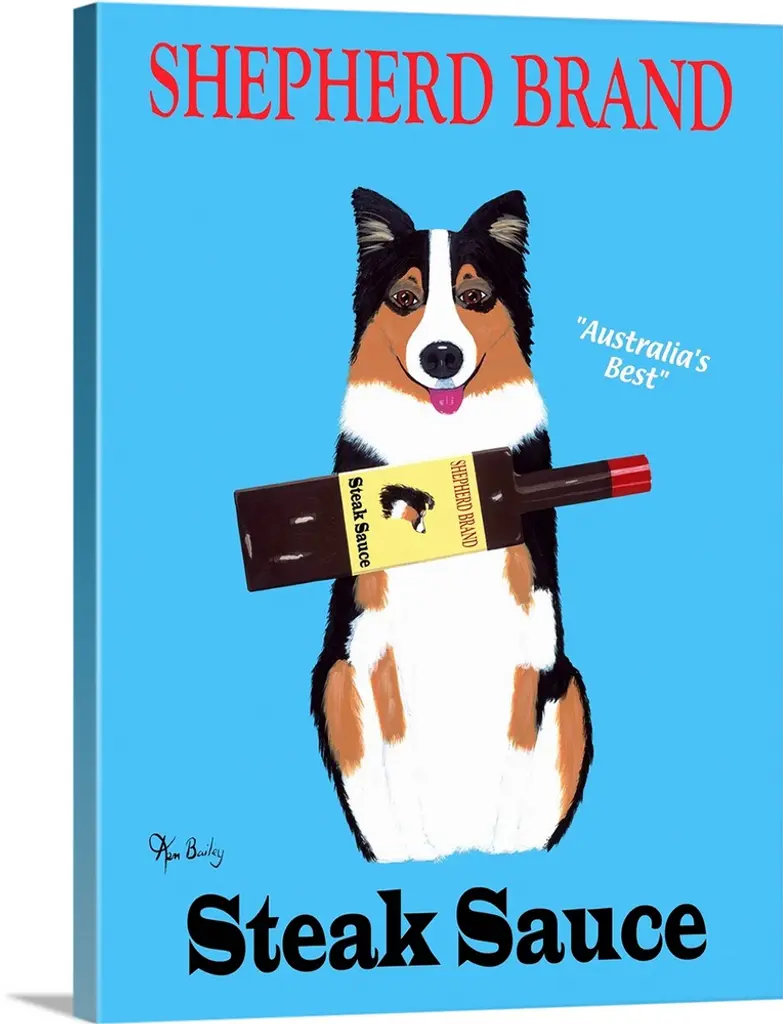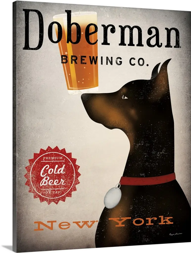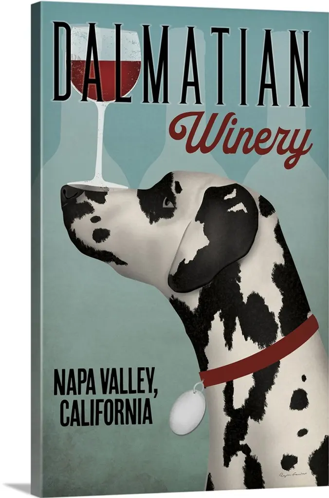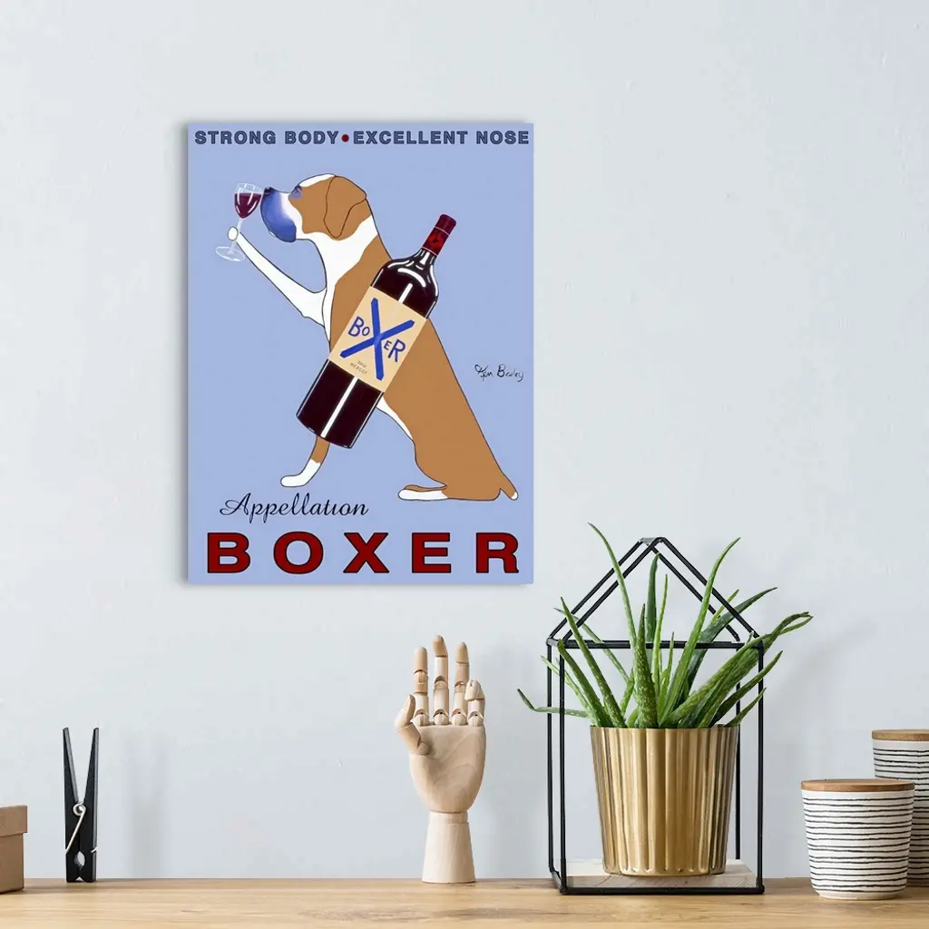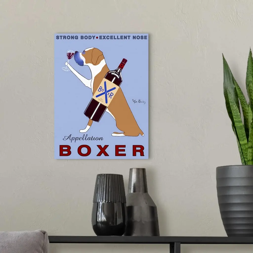 Large, vertical advertisement for Appellation Boxer wine, of a boxer dog sitting, holding a glass of red wine to his nose, and a large bottle of this wine is placed diagonally over the dogs body. Text above the dog reads "Strong body-excellent nose".