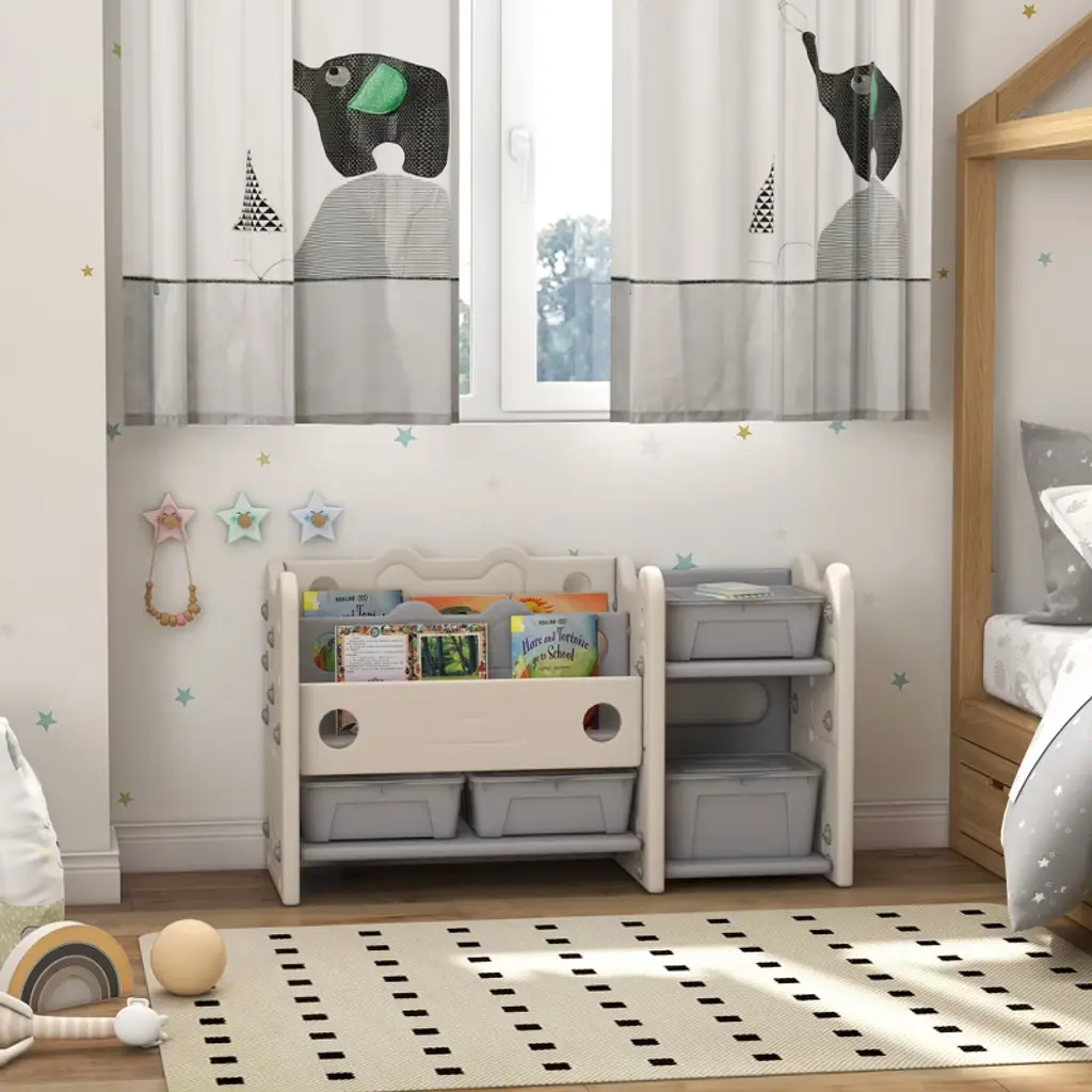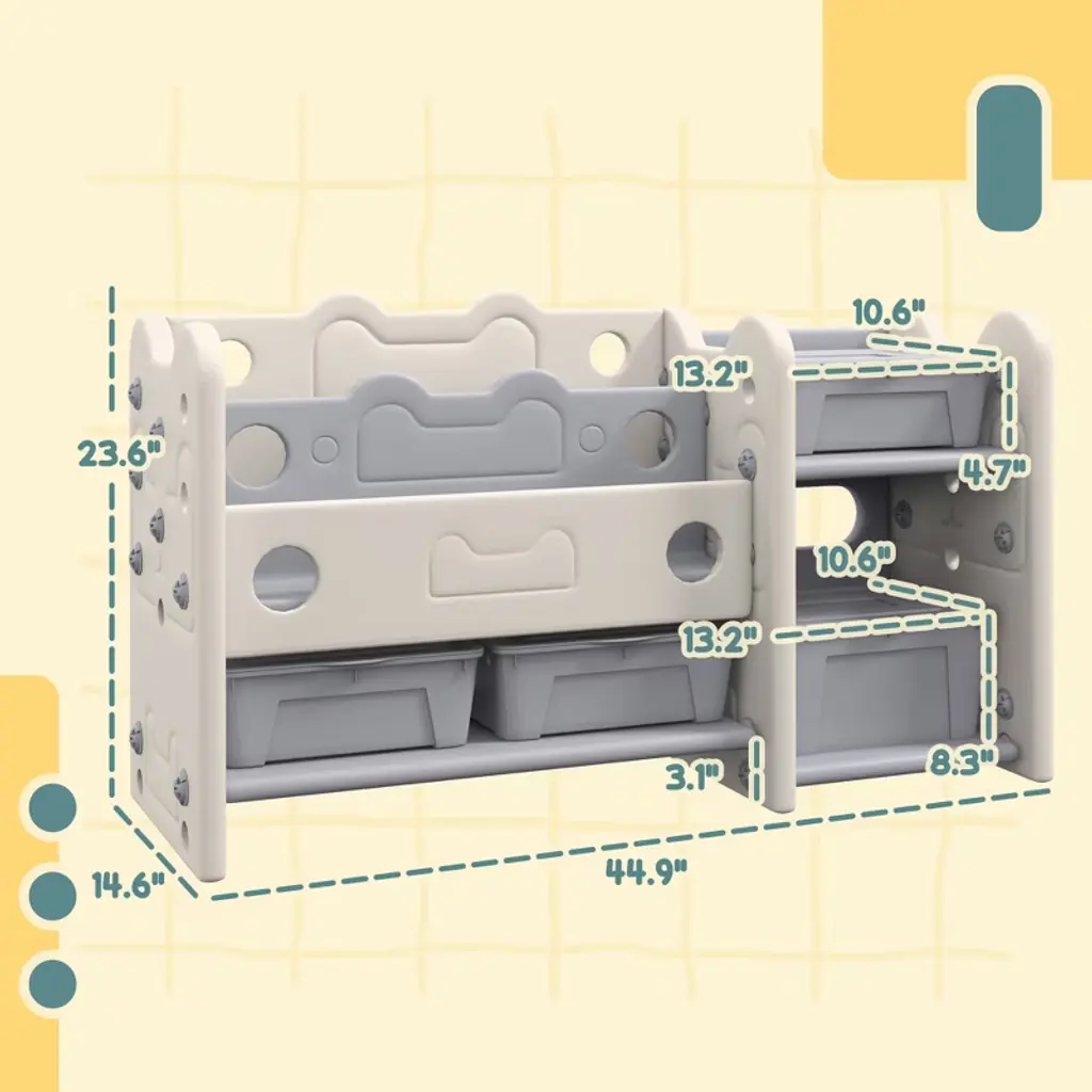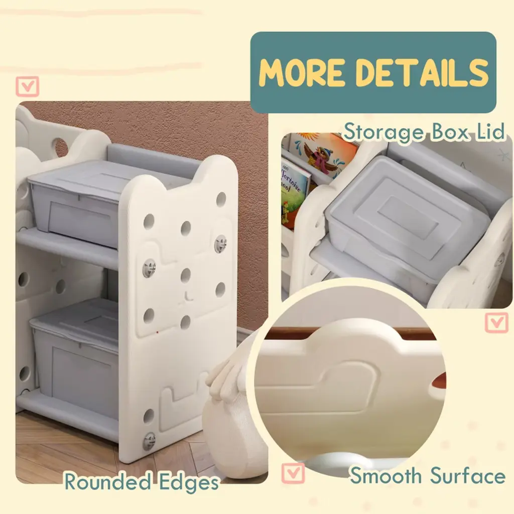 Have a playroom storage solution. Our kid's toy storage organizer features ample space and designated areas to keep toys neat, including bookshelves, four storage boxes, and a rack.