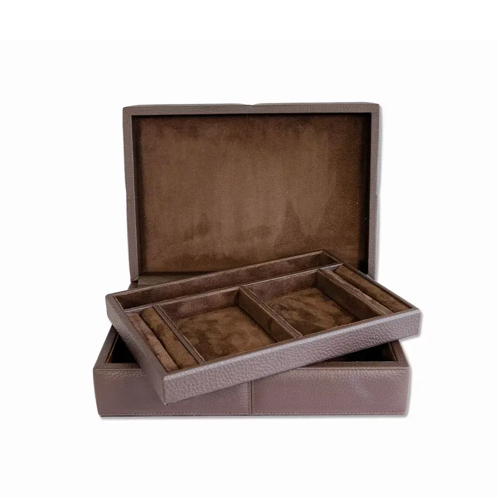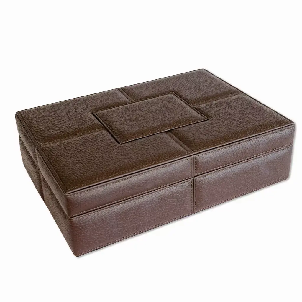 Wooden handmade box, with plateau, dressed in fine and soft genuine leather and with decorative soft stitching and internal microfiber fabric. Available in 14 different colors. Please, ask the Concierge for further details.