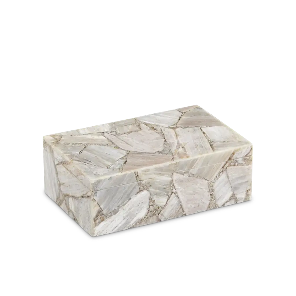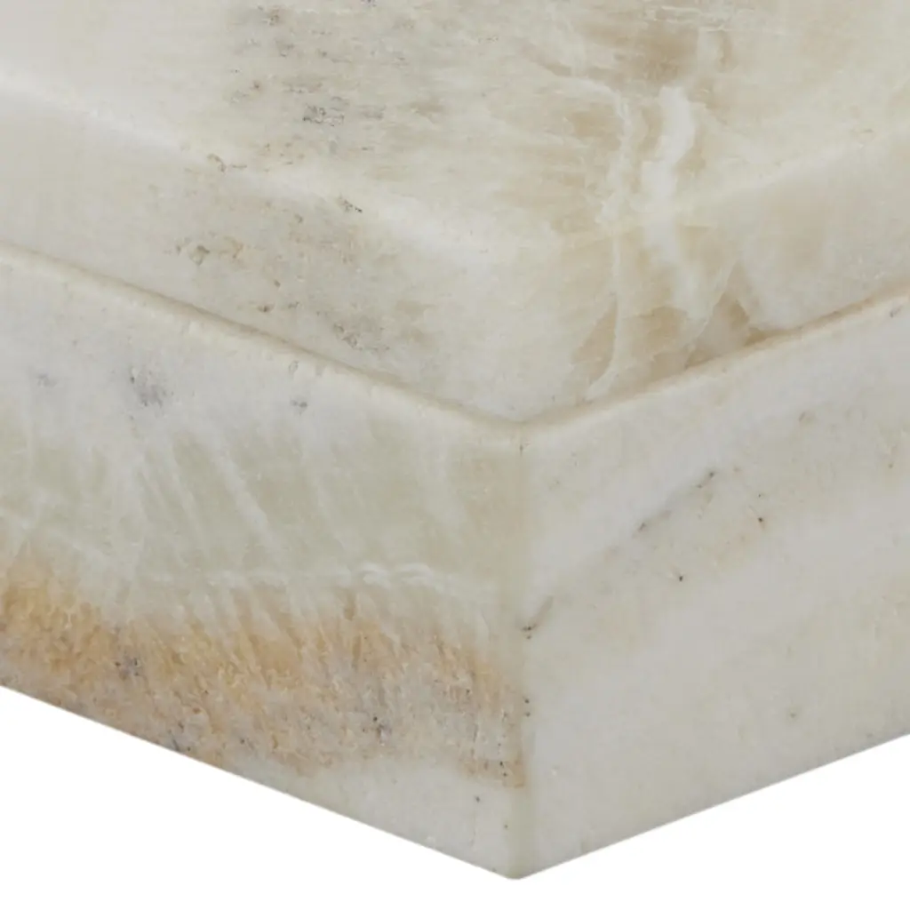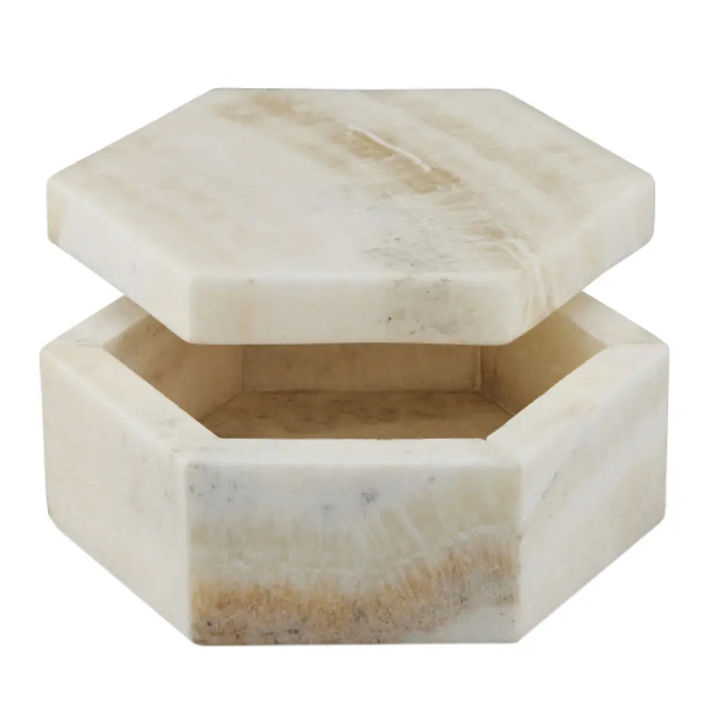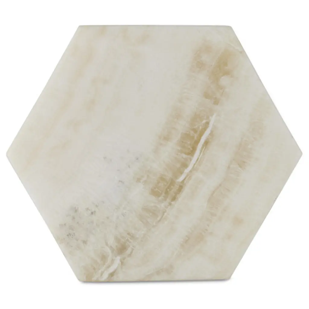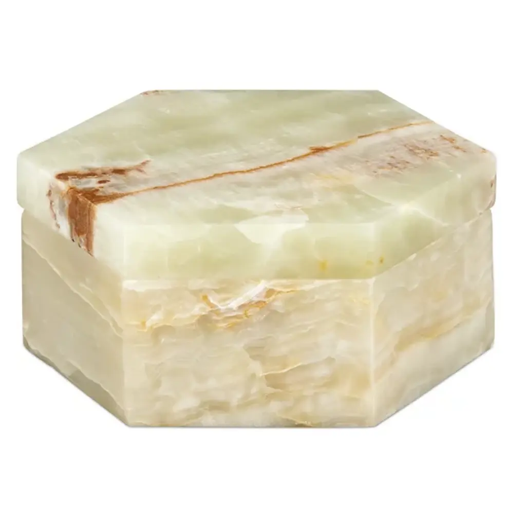 The Arco Onyx Hexagon Box is a sophisticated blend of contemporary design and natural beauty. Its sleek, modern lines are contrasted by the lively veining inherent to the onyx stone. Each piece is unique, with veining that ranges from subtle to bold, adding character and charm. Perfect for storing small treasures, this box is a striking decorative accent. The clean lines create a contemporary profile, while the natural markings of the stone bring a tremendous uptick in personality. There will be variations from piece to piece given the material from which it is made.