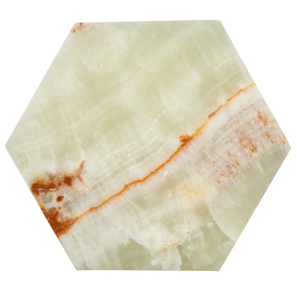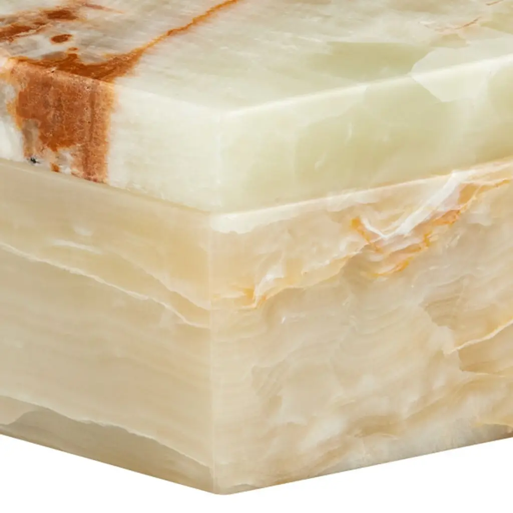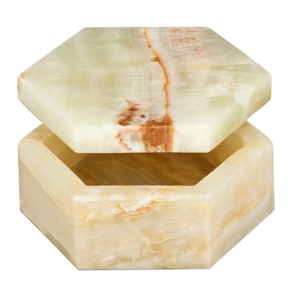 The Arco Onyx Hexagon Box is a sophisticated blend of contemporary design and natural beauty. Its sleek, modern lines are contrasted by the lively veining inherent to the onyx stone. Each piece is unique, with veining that ranges from subtle to bold, adding character and charm. Perfect for storing small treasures, this box is a striking decorative accent. The clean lines create a contemporary profile, while the natural markings of the stone bring a tremendous uptick in personality. There will be variations from piece to piece given the material from which it is made.