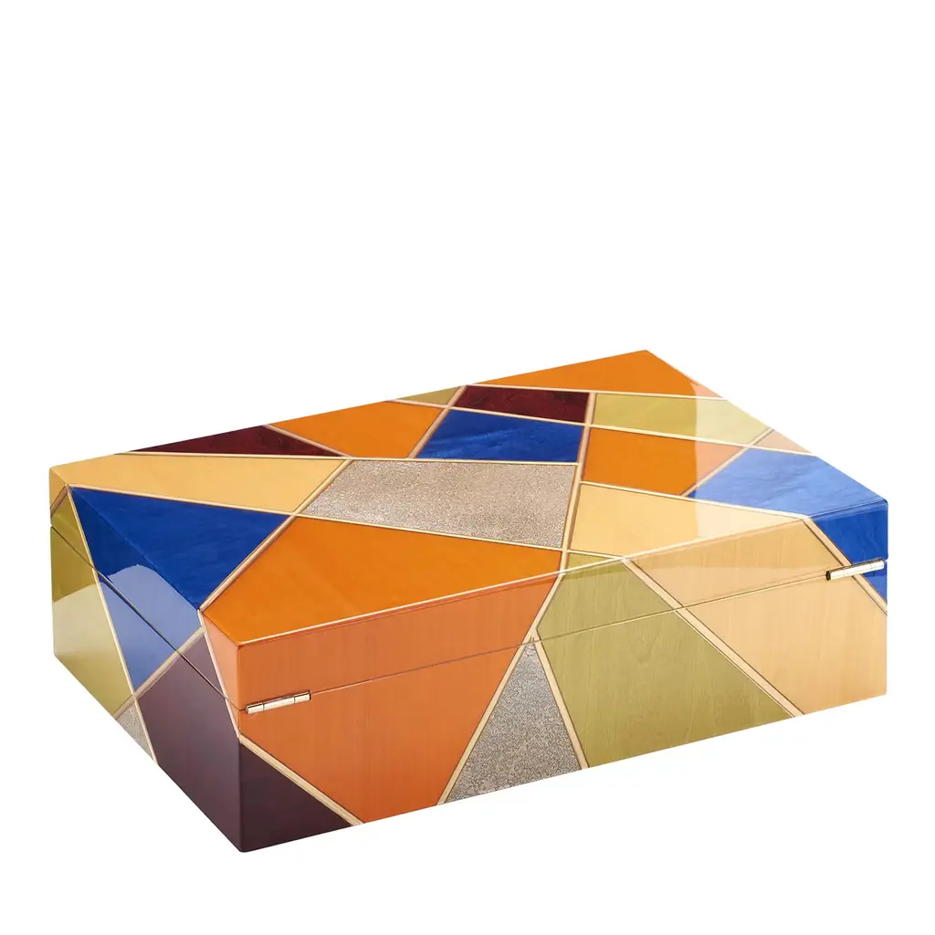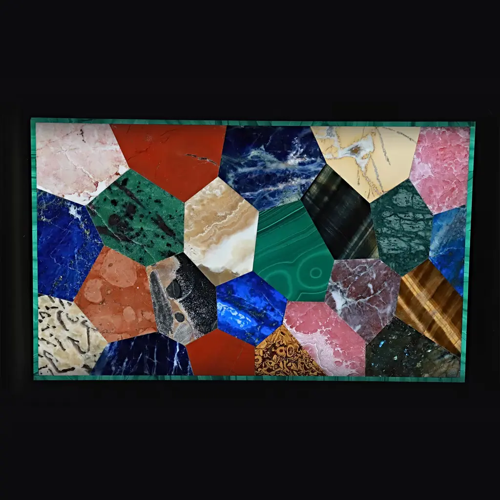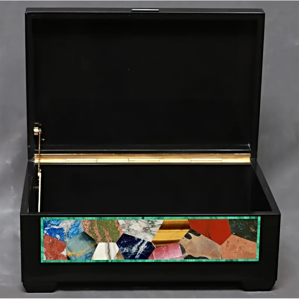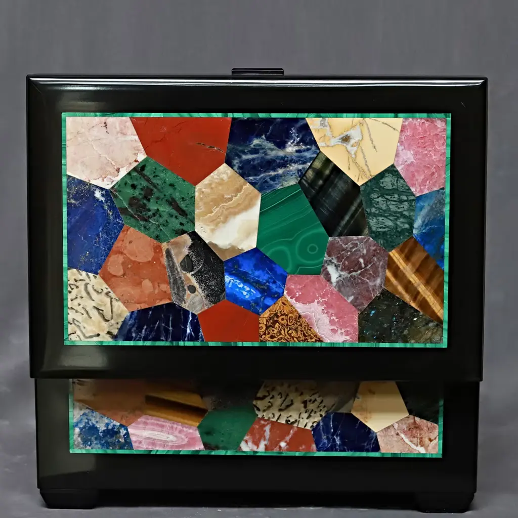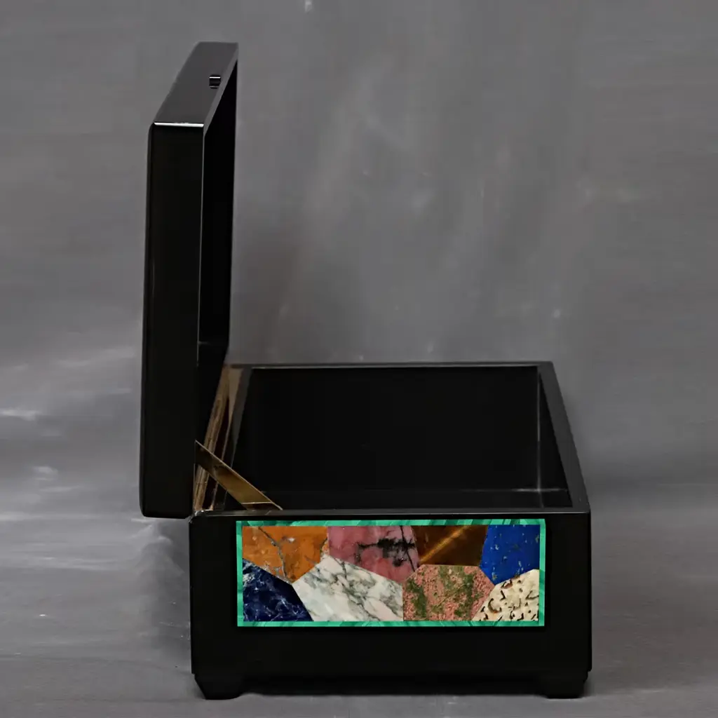 Precious memories impressed on polaroids or jewelry favorites will be luxuriously treasured within this rectangular-cut box. Black Belgio marble is featured to craft its general structure - feet included - while rhodochrosite, tiger eye, lapis lazuli, zoisite, bloodstone, and onyx create the Arlequin-style decoration on all sides, pattern outlined by a thin malachite frame.