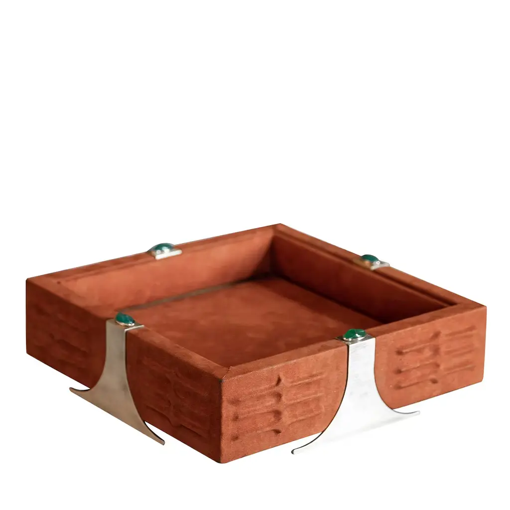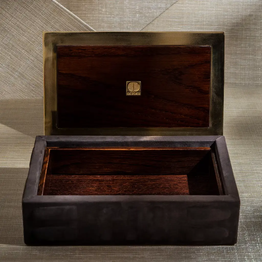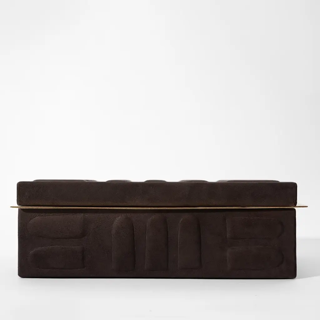 Asat is a masterpiece of refined craftsmanship. The solid Canaletto walnut structure of the body and the lid is covered in prized and highly textured Nubuck Leather enhancing the visual effect of the piece, soft to the touch and vibrant to the eye. Textures and symbols refer to the Bacabs Collection, placing the item among the kind homages to the pre-Columbian culture. The linear and minimalist brass insert counterbalances the sumptuousness of the piece, for an elegant and refined look.