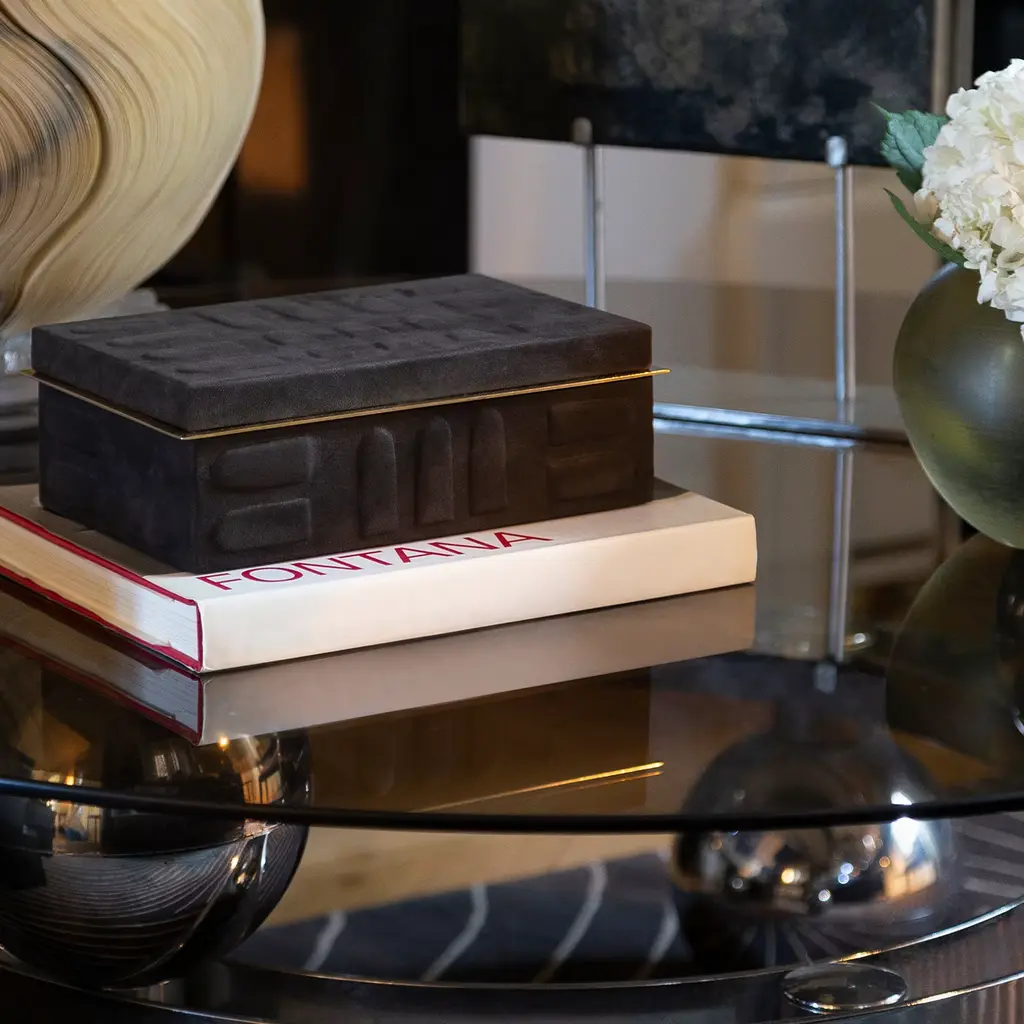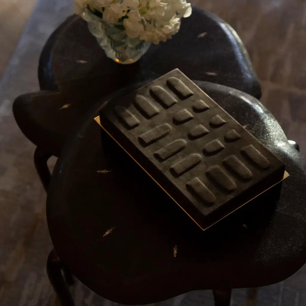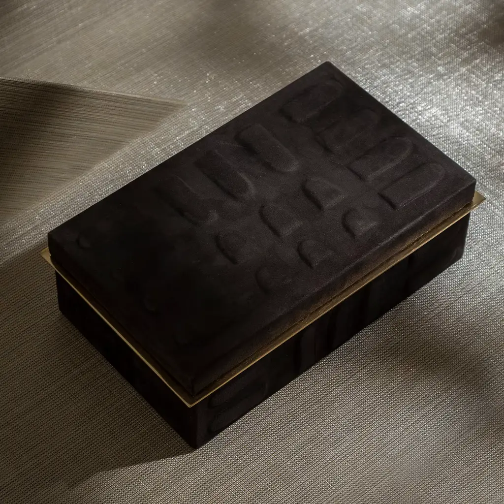 Asat is a masterpiece of refined craftsmanship. The solid Canaletto walnut structure of the body and the lid is covered in prized and highly textured Nubuck Leather enhancing the visual effect of the piece, soft to the touch and vibrant to the eye. Textures and symbols refer to the Bacabs Collection, placing the item among the kind homages to the pre-Columbian culture. The linear and minimalist brass insert counterbalances the sumptuousness of the piece, for an elegant and refined look.