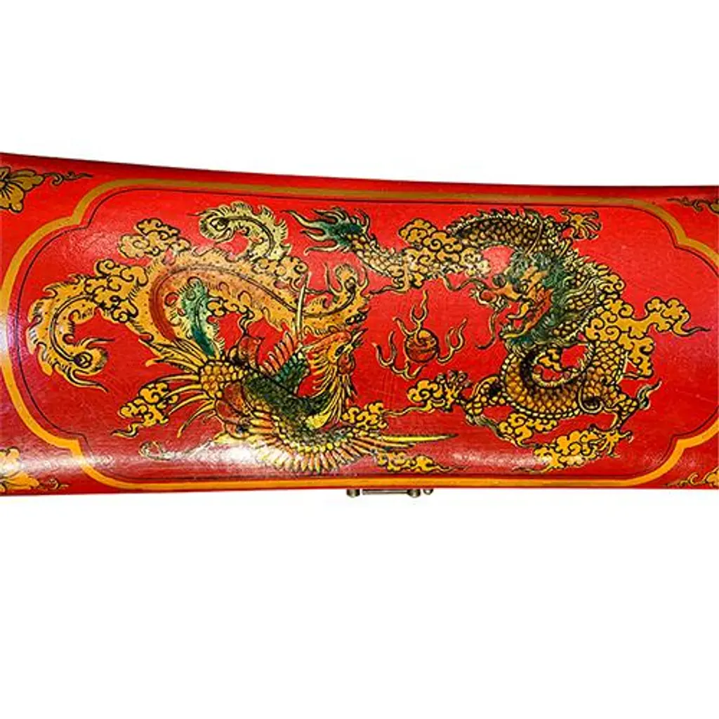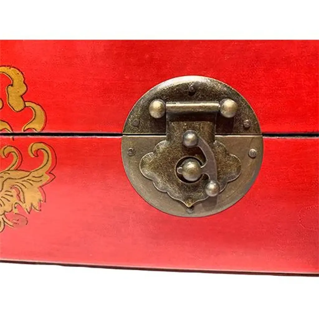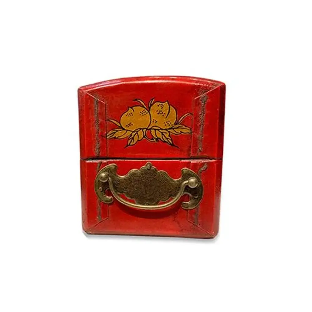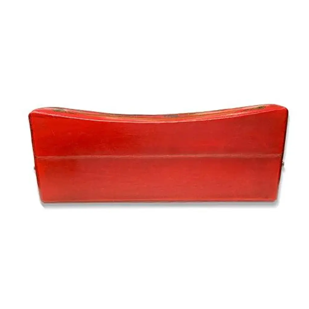 Delicate hand painted Red wooden Asian jewelry box with a saddle shape design. It has lots of storage for necklaces and bracelets. No maker marks. Smooth texture.