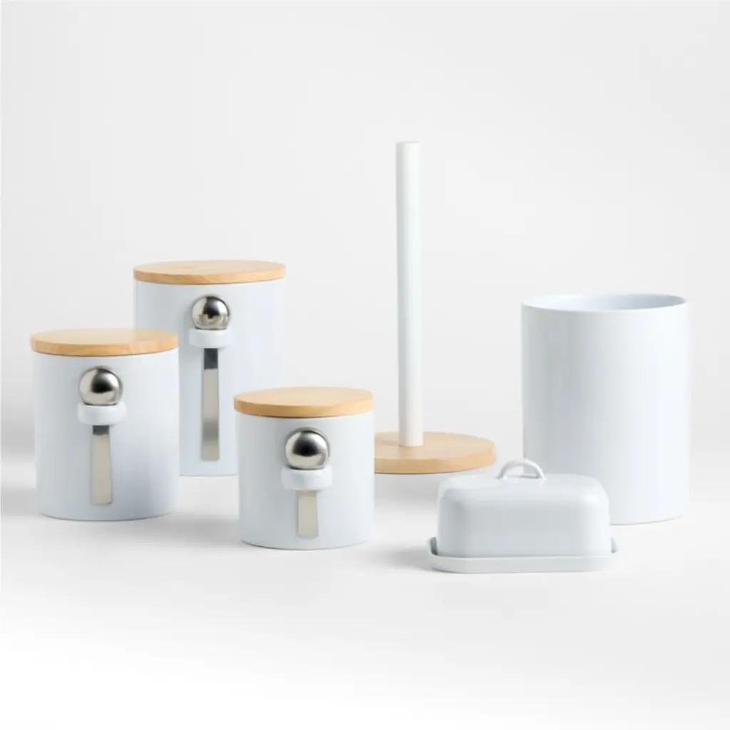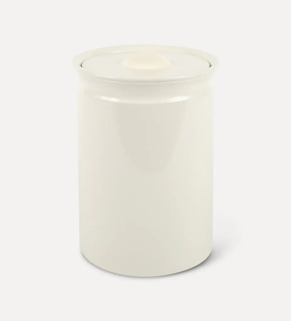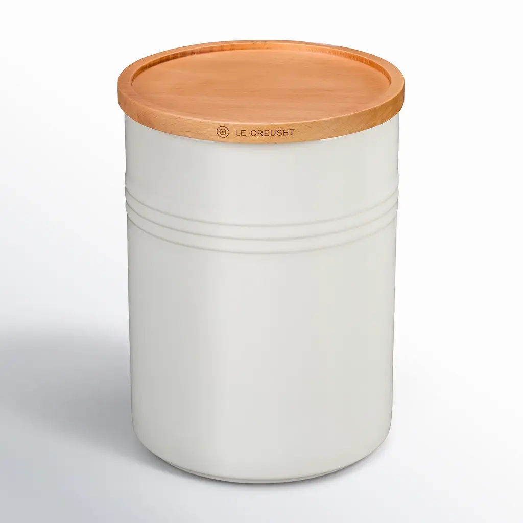 Our classic canister with scoop slims down and simplifies in white stoneware and sustainable wood. Keeping cornmeal, oatmeal, protein bars and other kitchen staples stored within easy reach, the clean-lined cylinder is topped with a perfectly proportioned wood lid. The large canister hangs a stainless steel tablespoon scoop on the exterior for easy portioning while baking or cooking. Group with the matching small, medium and extra-large canisters for coordinated storage.By choosing FSC®-certified products, you are supporting responsible management of the world's forests.