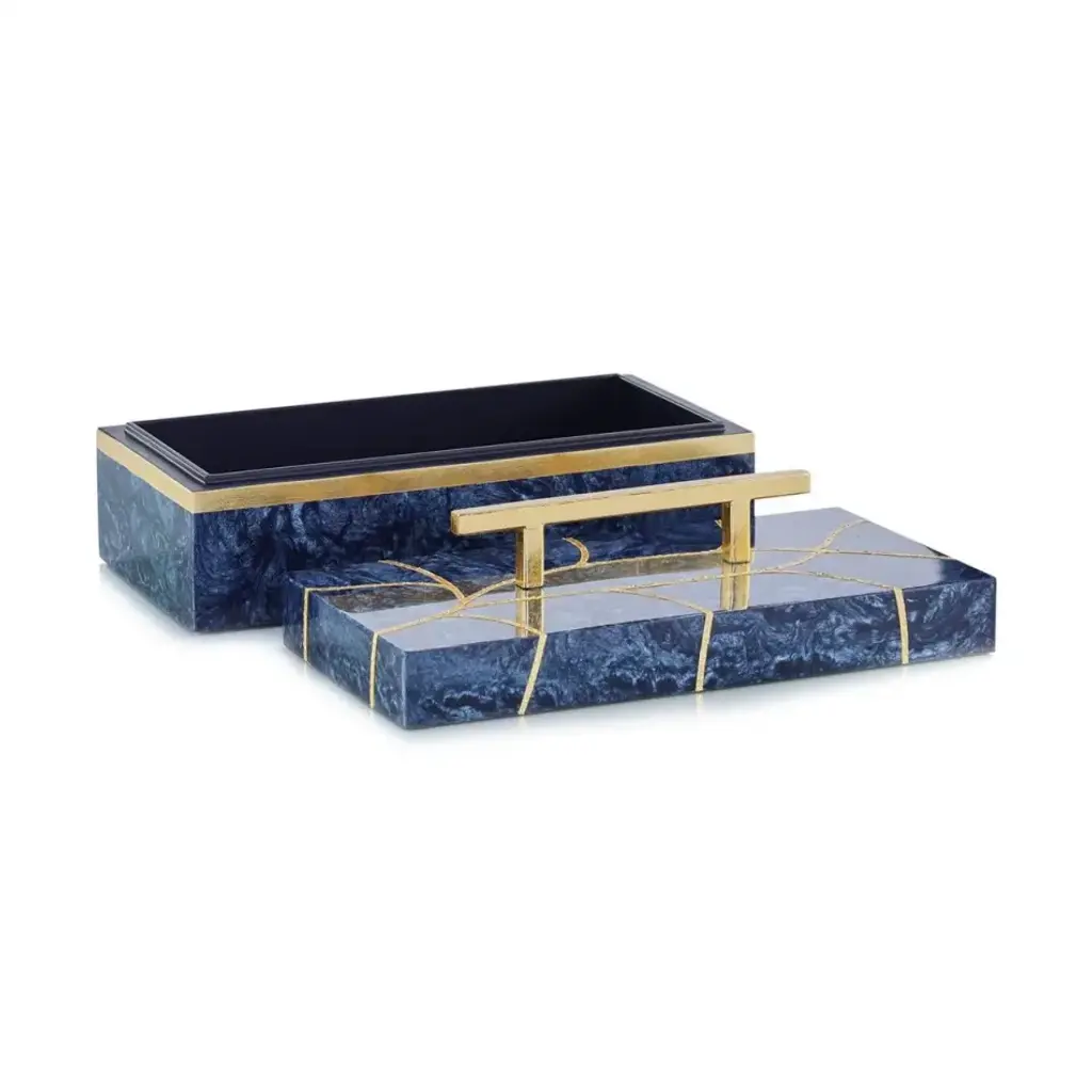 The Astilla Box is a gorgeous decorative vessel with a chic contemporary look. Crafted from composite, the dark blue box showcases swirling white tones paired with gold trim and a splintering motif at the top. The look is completed with a slender steel handle in a Brass finish.