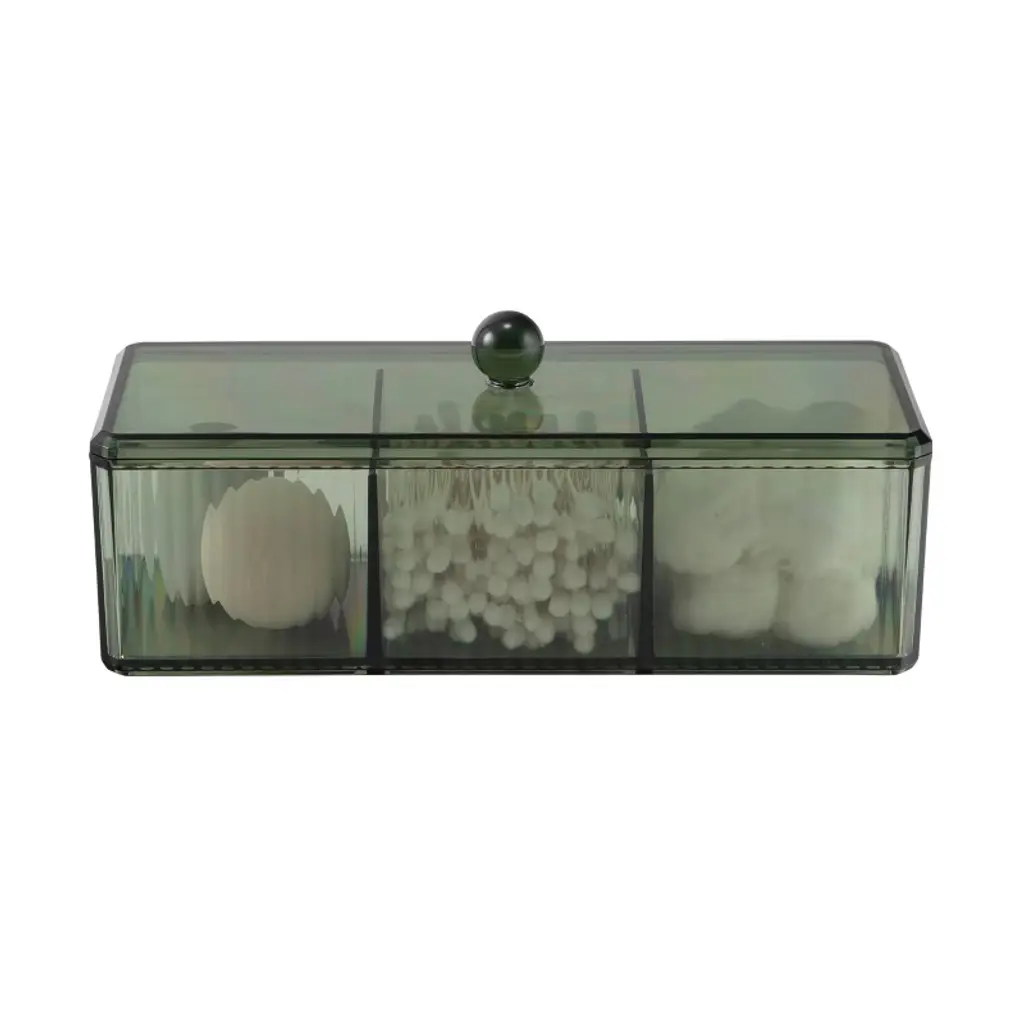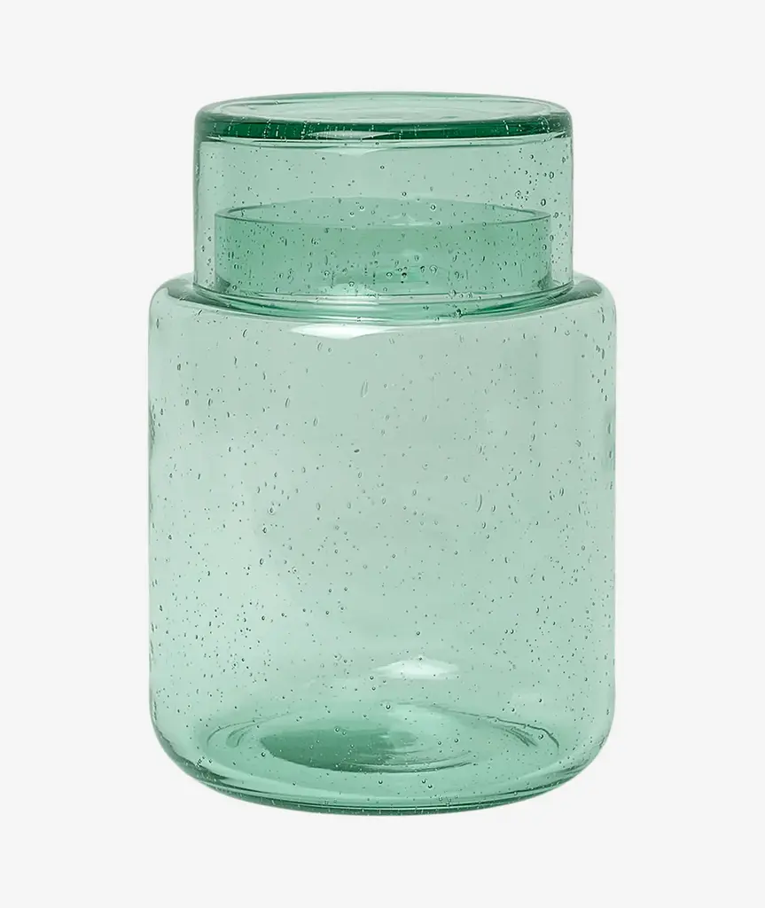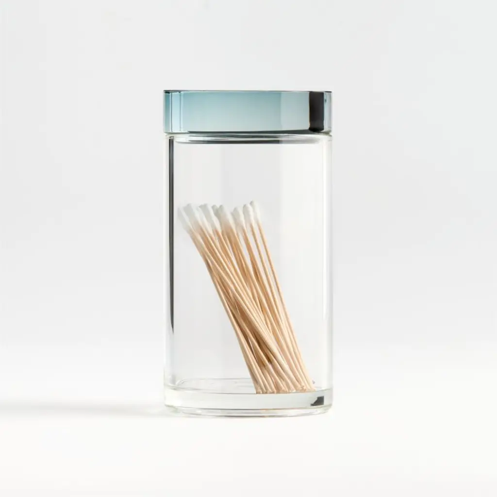 Elevate your vanity storage with our Astoria bathroom canisters. Hand-blown by talented artisans, the vessels have a chunky, modern look we love. Ultra-clear glass shapes the bases, and the cool grey-blue glass lids double as coasters to give the open canisters a lift. Low and wide, the large size is ideal for holding bath salts or cotton balls. The taller small and medium canisters keep cotton swabs, makeup pads, hair ties and more at the ready. Subtle variations in the hand-blown glass make each one beautifully unique.