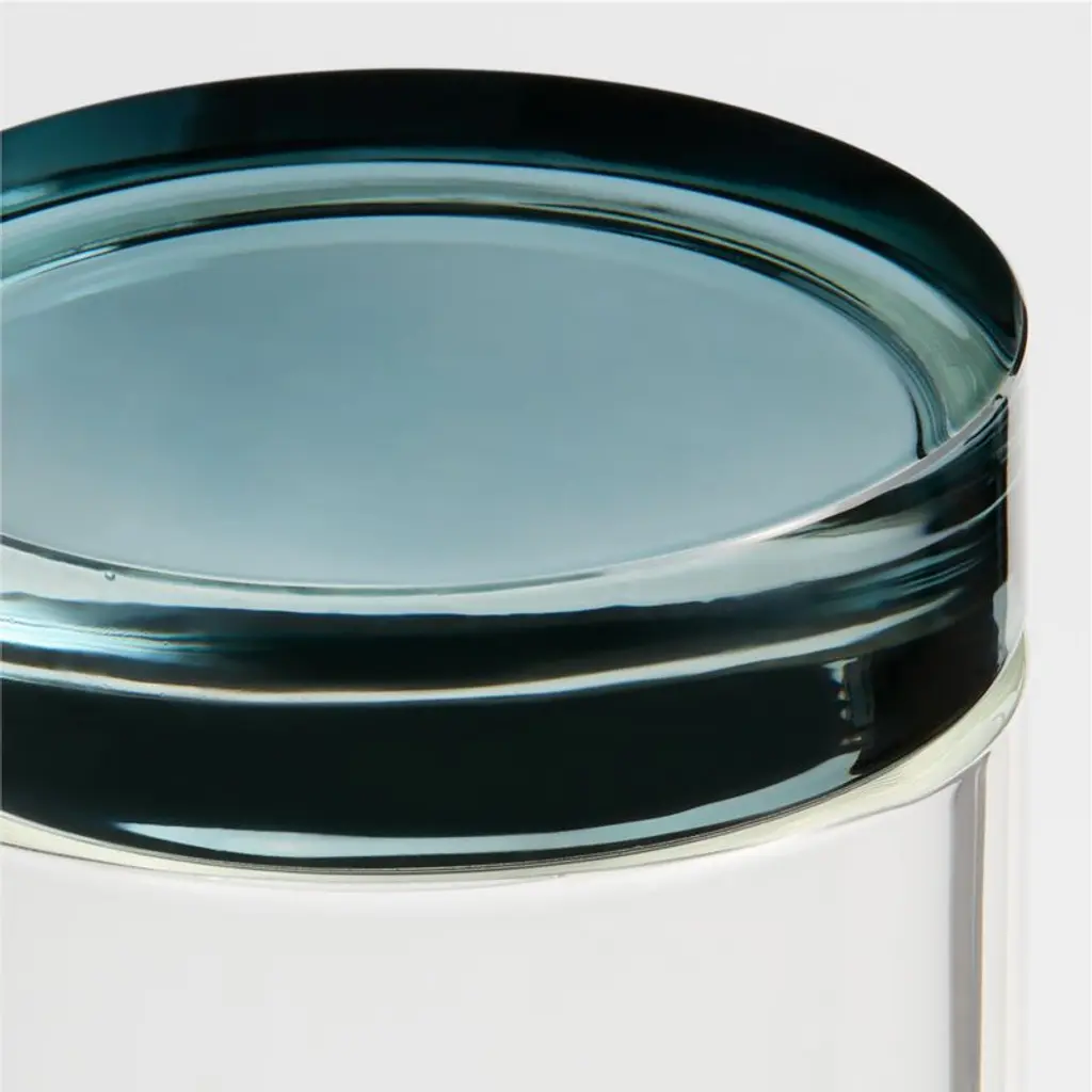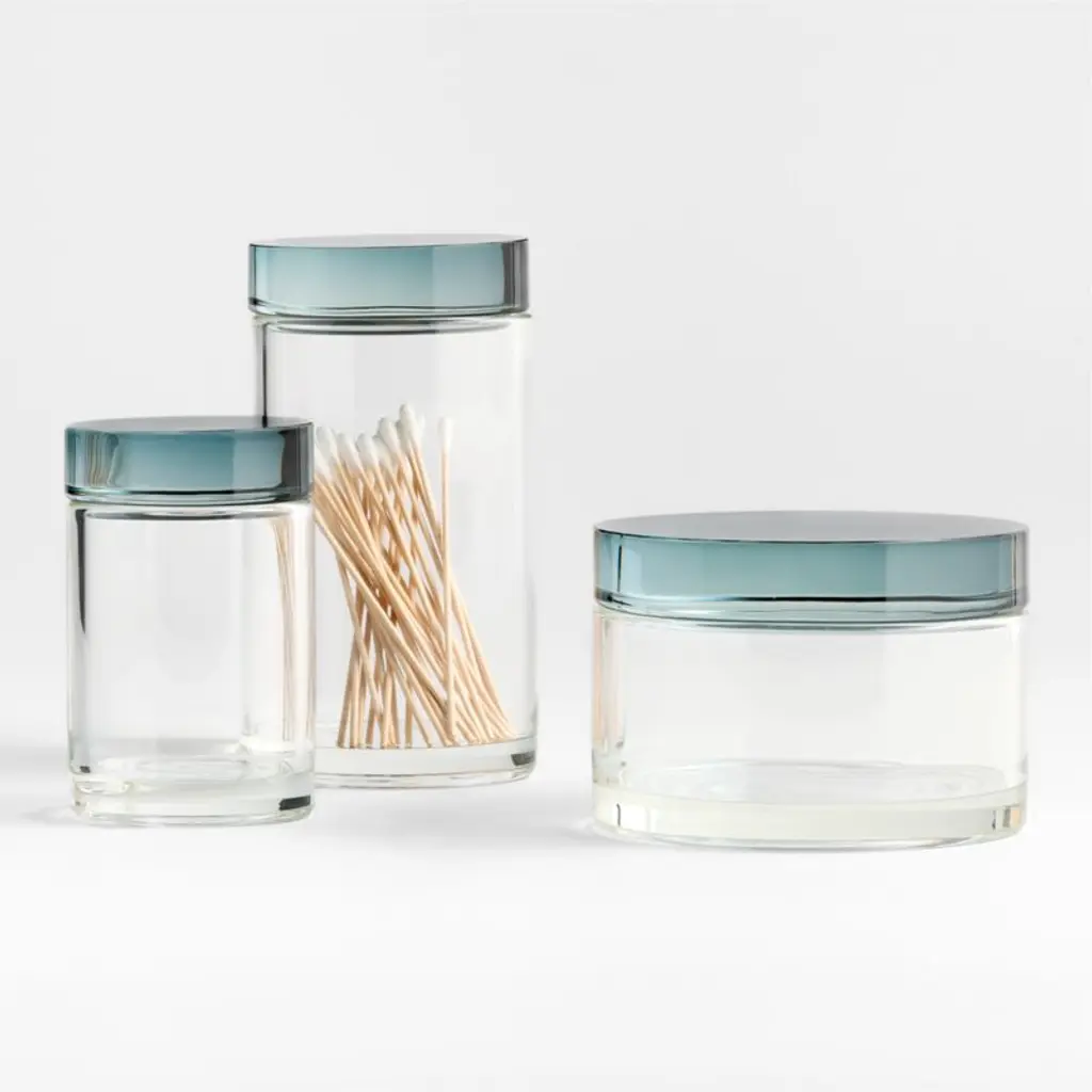 Elevate your vanity storage with our Astoria bathroom canisters. Hand-blown by talented artisans, the vessels have a chunky, modern look we love. Ultra-clear glass shapes the bases, and the cool grey-blue glass lids double as coasters to give the open canisters a lift. Low and wide, the large size is ideal for holding bath salts or cotton balls. The taller small and medium canisters keep cotton swabs, makeup pads, hair ties and more at the ready. Subtle variations in the hand-blown glass make each one beautifully unique.