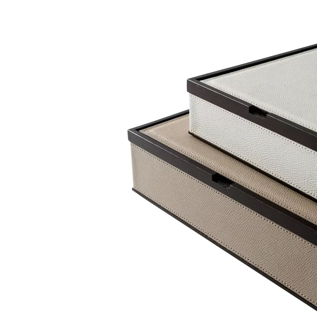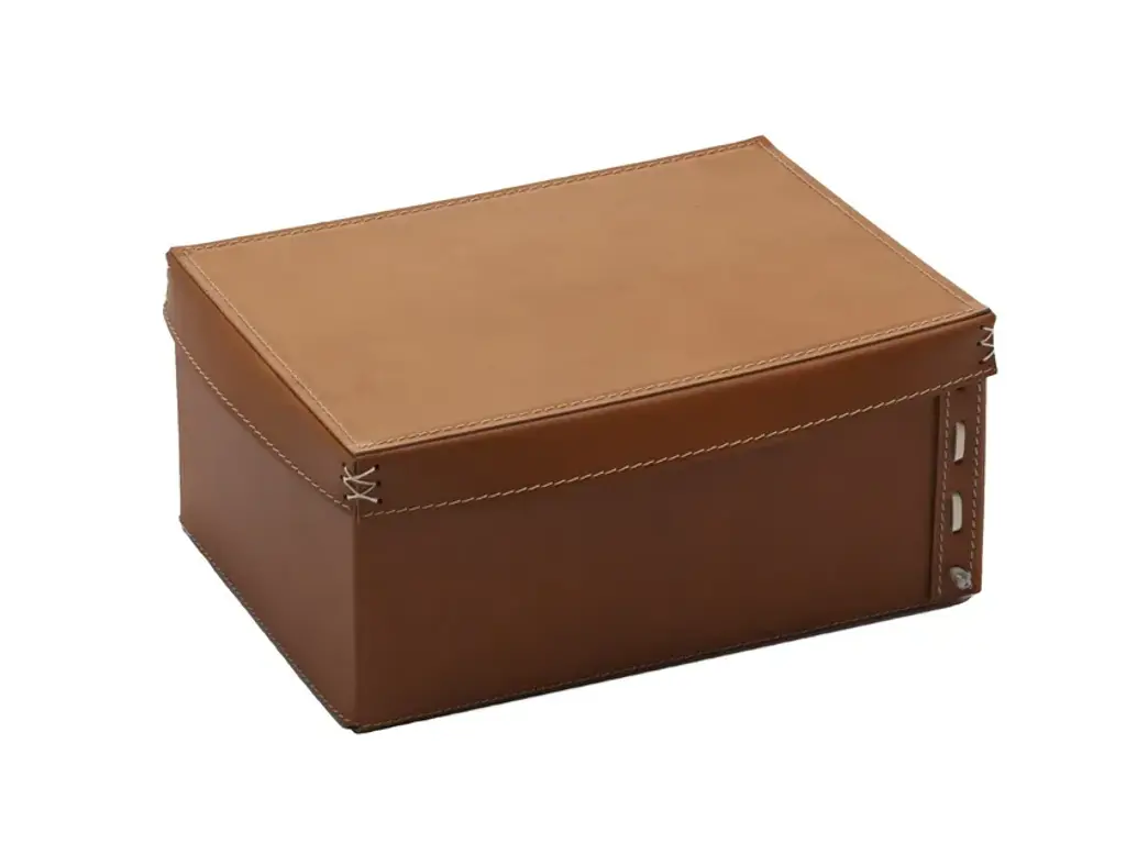 This beautiful box is made from wenge-finish oak that is covered in leather for a sophisticated, stylish look for home or the office. This low, square box with a handy lid comes in two different sizes and is customizable in various leathers and colors. Perfect for safekeeping of documents or important papers.
