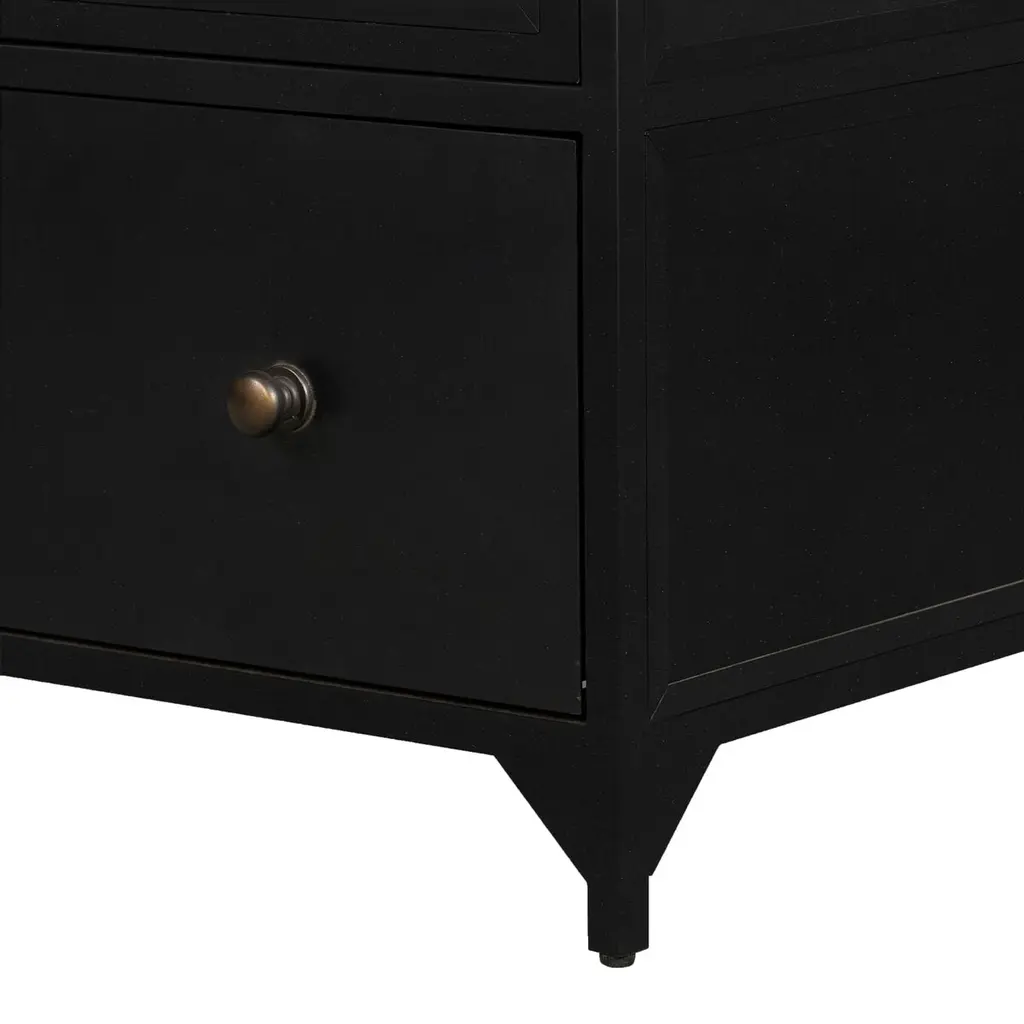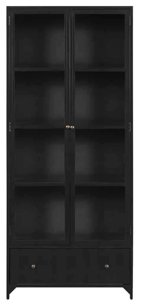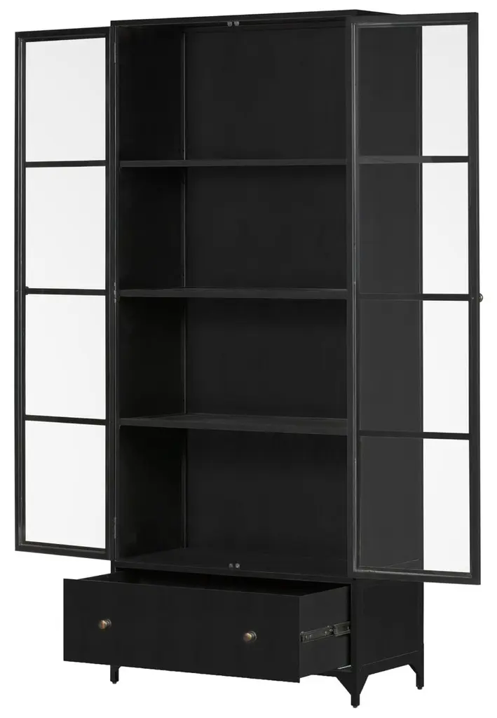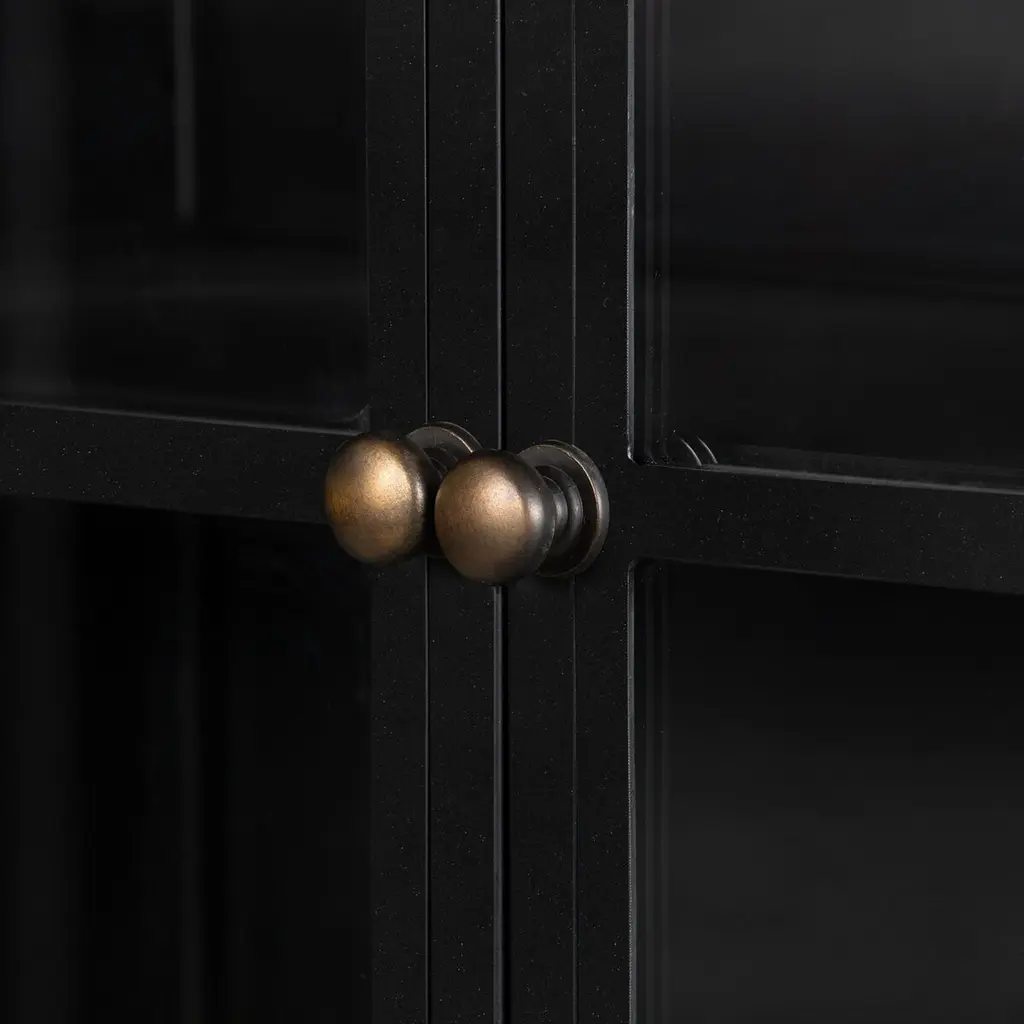 Industrial chic at its most refined, this iron cabinet has four shelves behind its tempered-glass doors, offering a wealth of storage and display space. Two drawers on the bottom provide additional space to stash items out of sight. The brass finish of the knobs provides an elegant contrast to the black finish of the iron.