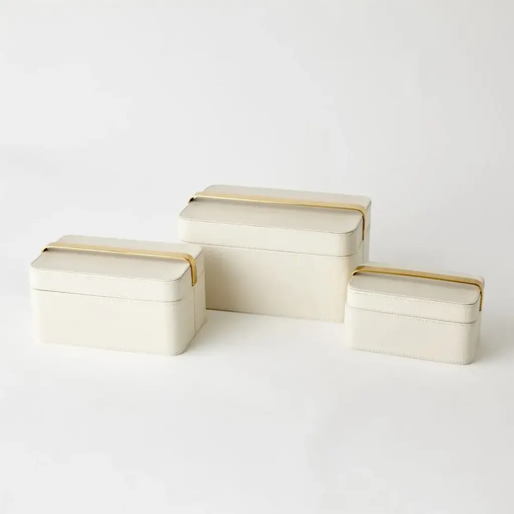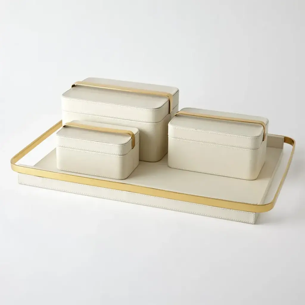Our Avery Collection of boxes and serving trays are meticulously crafted in handsome milk leather accented with highly polished chrome hardware. Useful and purposeful, these are also decorative and add a dash of sophistication to any home office or room setting. The boxes are available in 3 sizes, and the serving trays are available in 2 sizes. Each sold separately. From a fashion forward perspective, Global Views offers accessories, furniture, statement lighting, and an assortment of rugs and mirrors to add beauty and joy to your home.