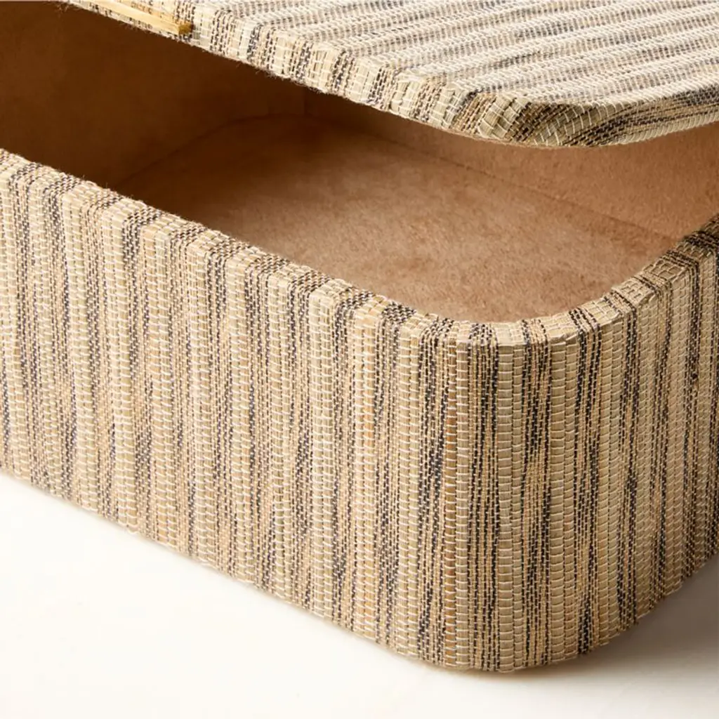 Woven from sun-dried mendong grass, the Axton box features a contrasting solid brass handle and a faux suede interior lining. The brass is unlacquered, offering a living finish that will develop the patina of a vintage find. Simply polish the brass to bring back its original luster. CB2 exclusive.