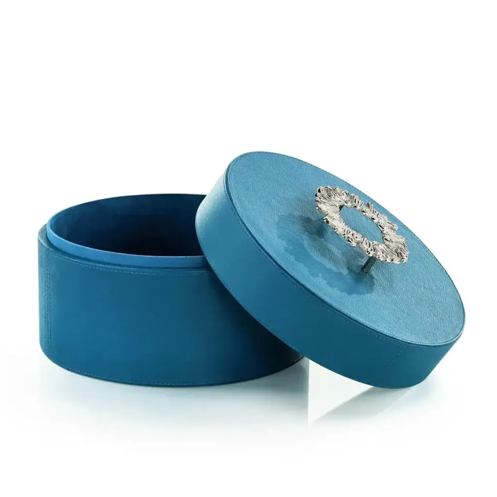 The Azure Isle Box is a gorgeous decorative vessel that serves as a luxurious accent within a space. This rounded box is wrapped in leather with a stylish azure tone, accented by a raised handle with an abstract shape in a Nickel finish.