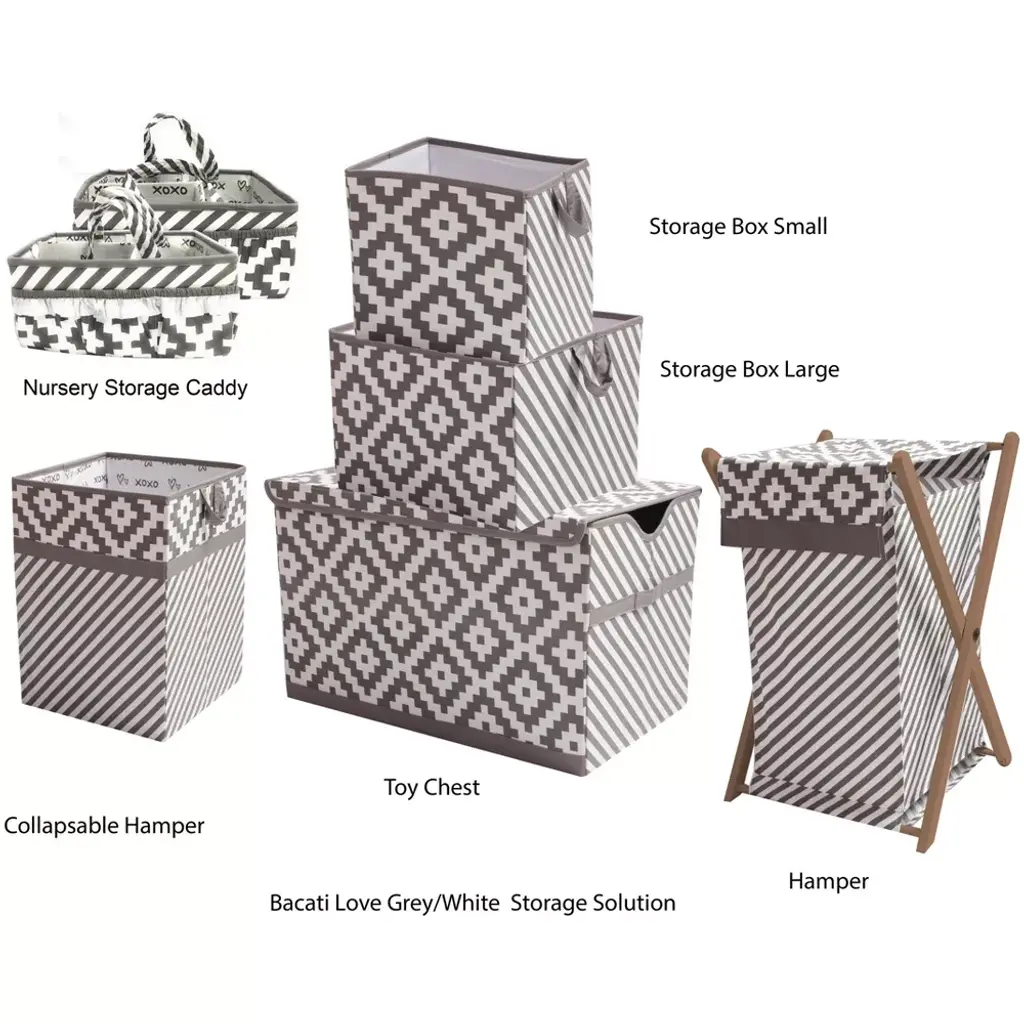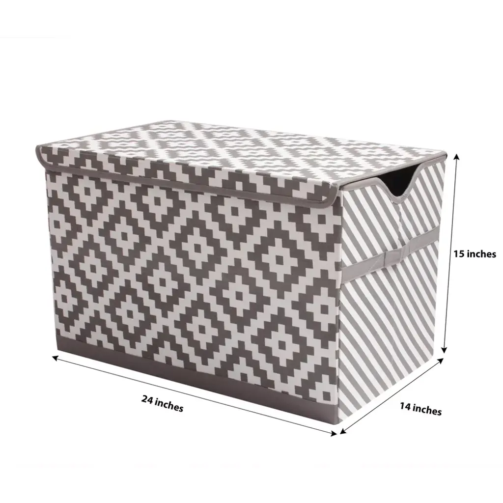 Your kiddo will learn to keep their space/playroom/gameroom/bedroom organized with the Knock-Down Storage Toy Chest from Bacati. Designed in a rectangular silhouette with Lid, this kids storage toy chest is great for storing anything from comic books or board games to small toys or craft supplies, while the closed lid-top design gives them easy access to its contents, and the two side handles make it easy to carry from one place to the other. Featuring a Bacati signature prints and pattern, it brings a sweet complement to their room decor. Great for stashing under their desks or in closets, it features a foldable design for efficient storage when not in use. Many cordinating items available to purchase separately in this Bedding Collection by Bacati. Size: 15 Inches (H) x 14.5 Inches (W) x 24.5 Inches (D)