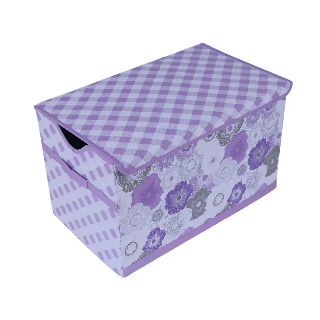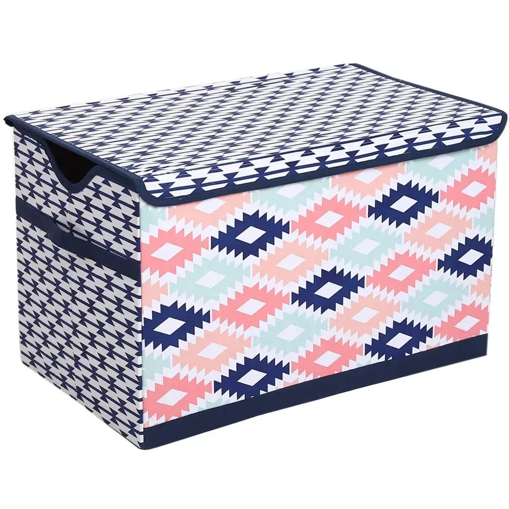 Your kiddo will learn to keep their space/playroom/gameroom/bedroom organized with the Knock-Down Storage Toy Chest from Bacati. Designed in a rectangular silhouette with Lid, this kids storage toy chest is great for storing anything from comic books or board games to small toys or craft supplies, while the closed lid-top design gives them easy access to its contents, and the two side handles make it easy to carry from one place to the other. Featuring a Bacati signature prints and pattern, it brings a sweet complement to their room decor. Great for stashing under their desks or in closets, it features a foldable design for efficient storage when not in use. Many cordinating items available to purchase separately in this Bedding Collection by Bacati. Size: 15 Inches (H) x 14.5 Inches (W) x 24.5 Inches (D). 2 side handles for easy carrying