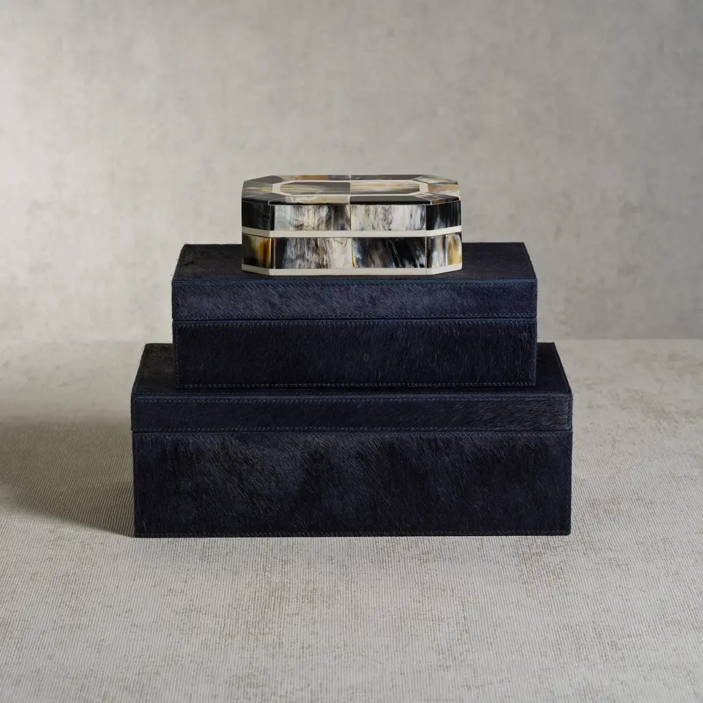 The Baldur Black Horn Inlaid Decorative Box is a refined and stylish addition to any space. Featuring geometric cuts of black and natural horn inlaid with elegant ivory trim, this rectangular octagon-shaped container adds a touch of sophistication. Constructed with a durable MDF frame, it combines functional storage with a striking, contemporary design. Lovely chic graphic design. Hand-inlaid bone design. Single compartment wood interior. Features a lift-off lid Materials: Horn/Resin/MDF. Natural variation in color is expected. Wipe with dry cloth.