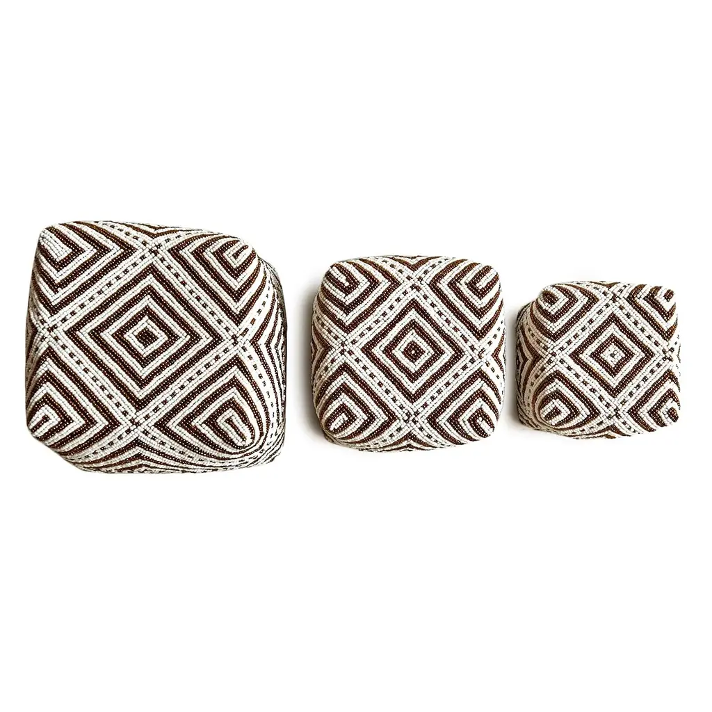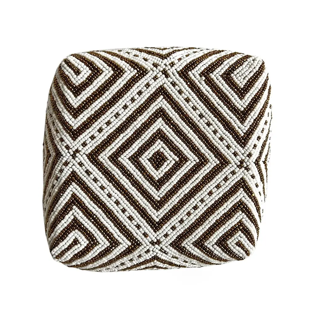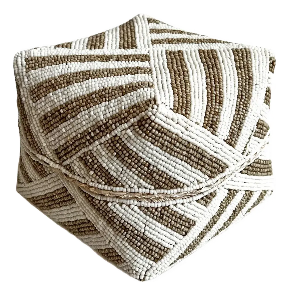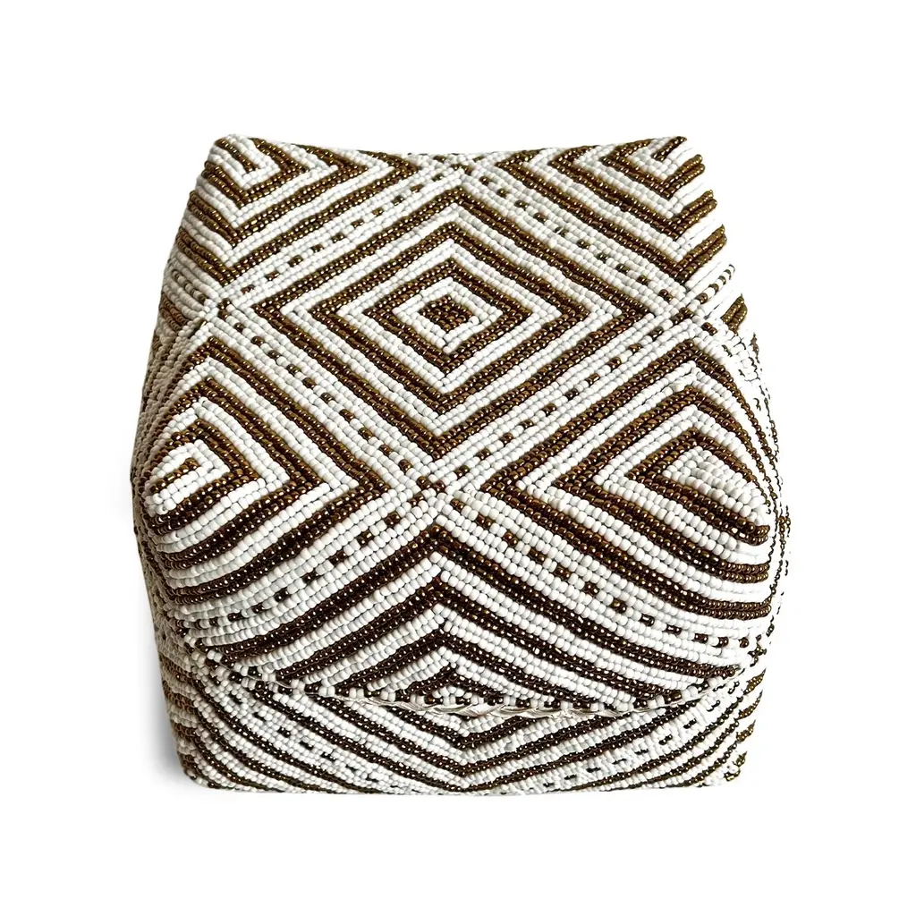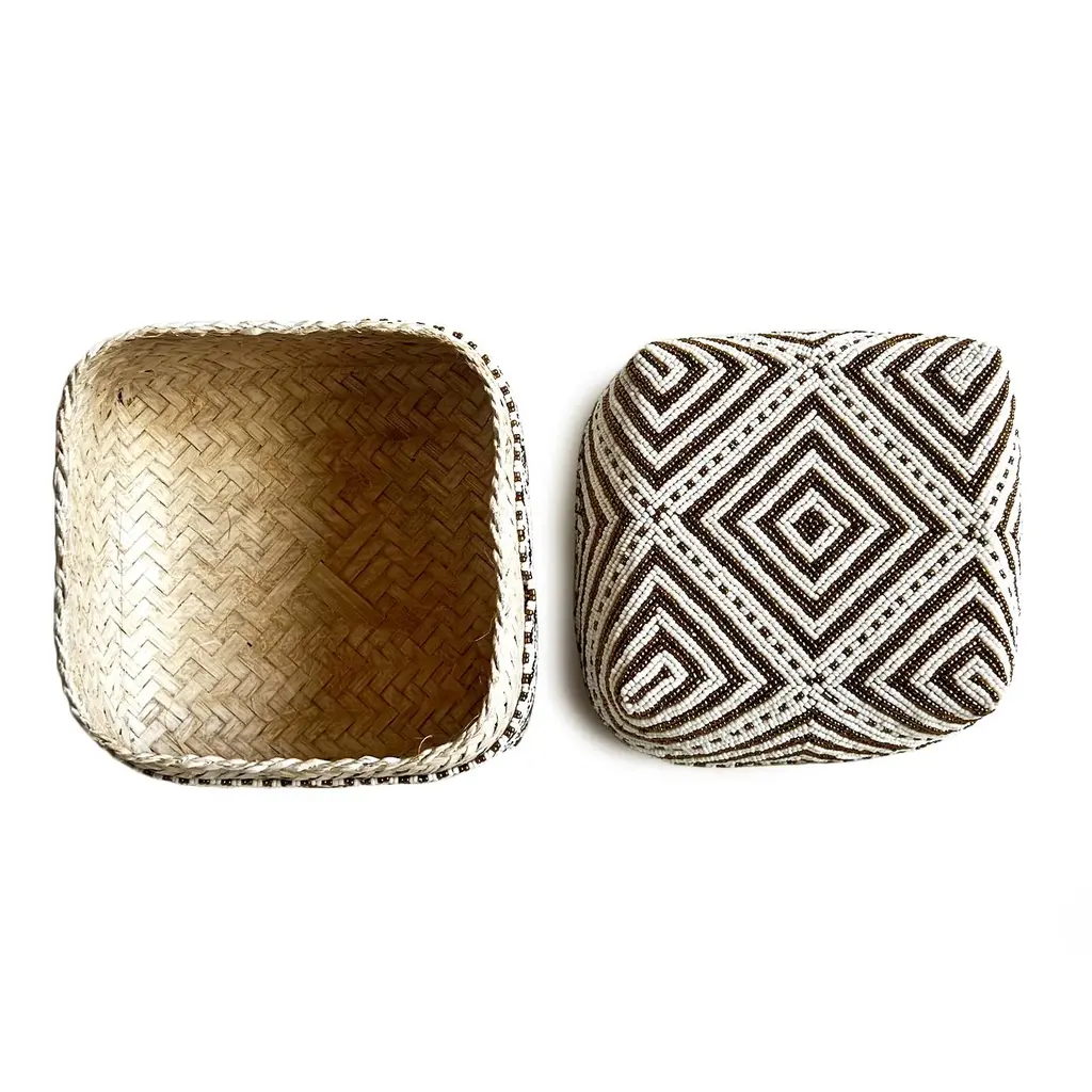Beautiful hand beaded accessory box made from woven bamboo and intricately covered with geometric triangle patterns of gold and white beads. Very attractive and useful to store small objects. Various sizes available and each sold individually.