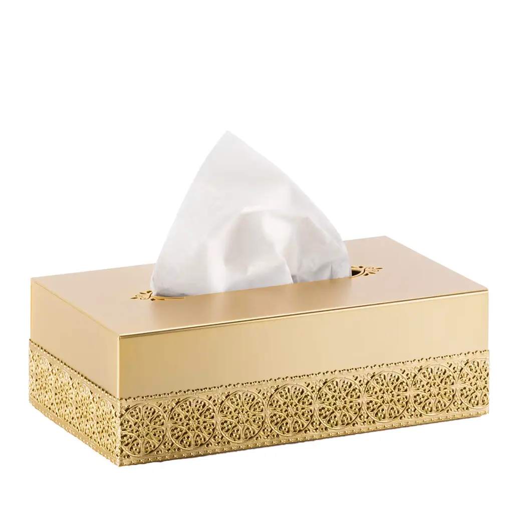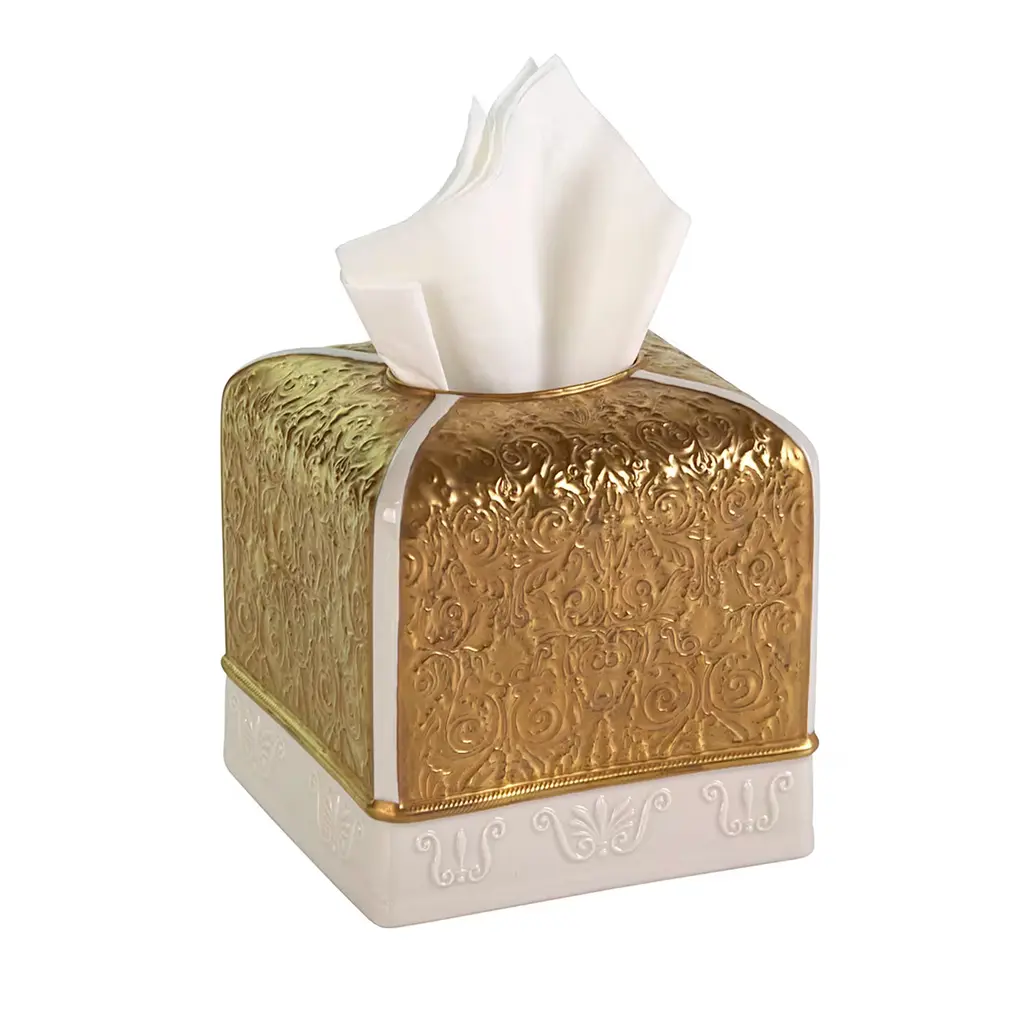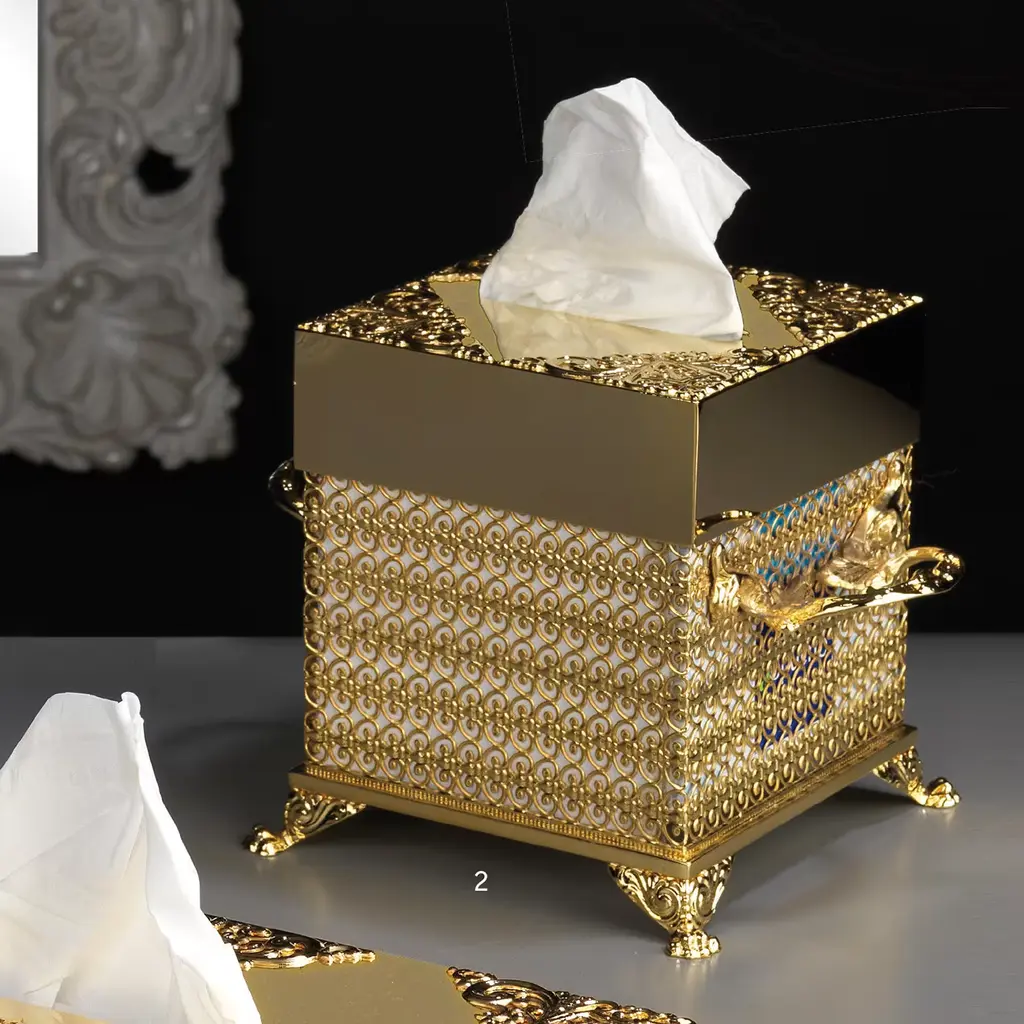 This gorgeous Kleenex box will add a lavish character to a refined bathroom, particularly when paired with marble-fashioned furniture. Handcrafted of brass finished with polished 24k gold, it is distinguished by lion paw-shaped feet and extraordinarily detailed decorations.