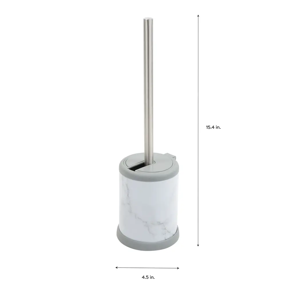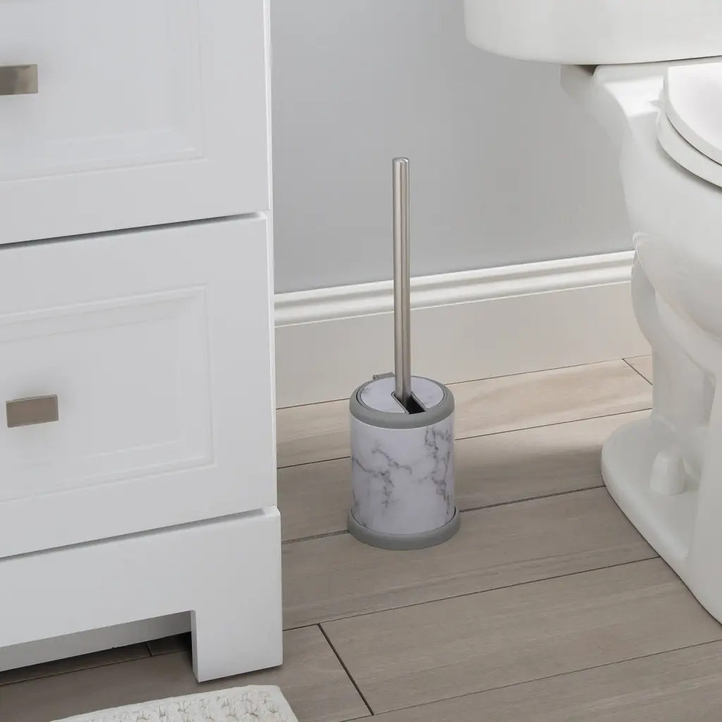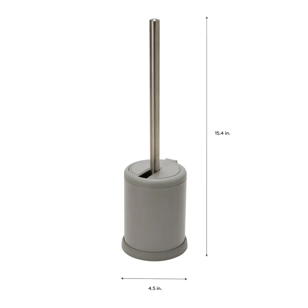 Store your toilet brush in plain sight with the attractive Bath Bliss Toilet Brush Set. This brush and decorative storage container is discreet and will make a lovely accent to most bathroom decors. The handle and canister for the bathroom toilet brush have a slick finish and are constructed from a hygienic and rust-resistant stainless steel. The set also has a durable, rounded, bristle brush that is designed to remain hidden when the product is not in use. This stainless steel toilet brush will keep both your bathroom and toilet looking their best. Treated to resist mildew, bacteria and rust. Comes with an opening and closing lid.